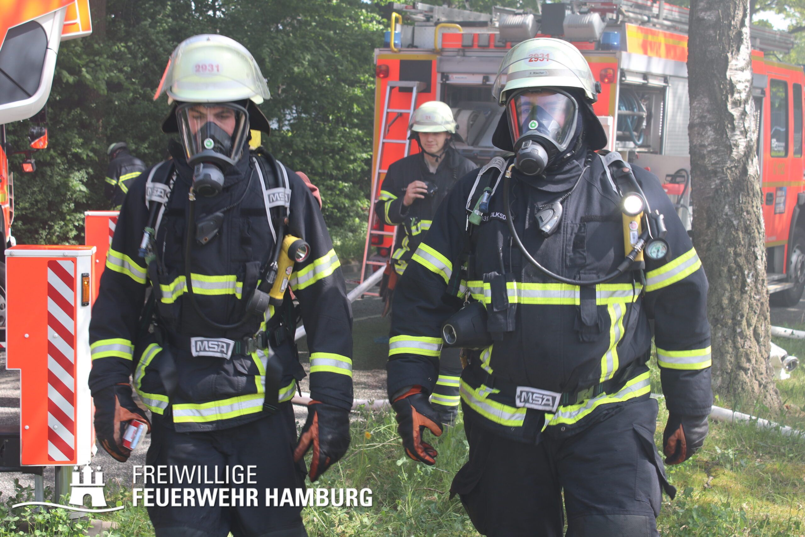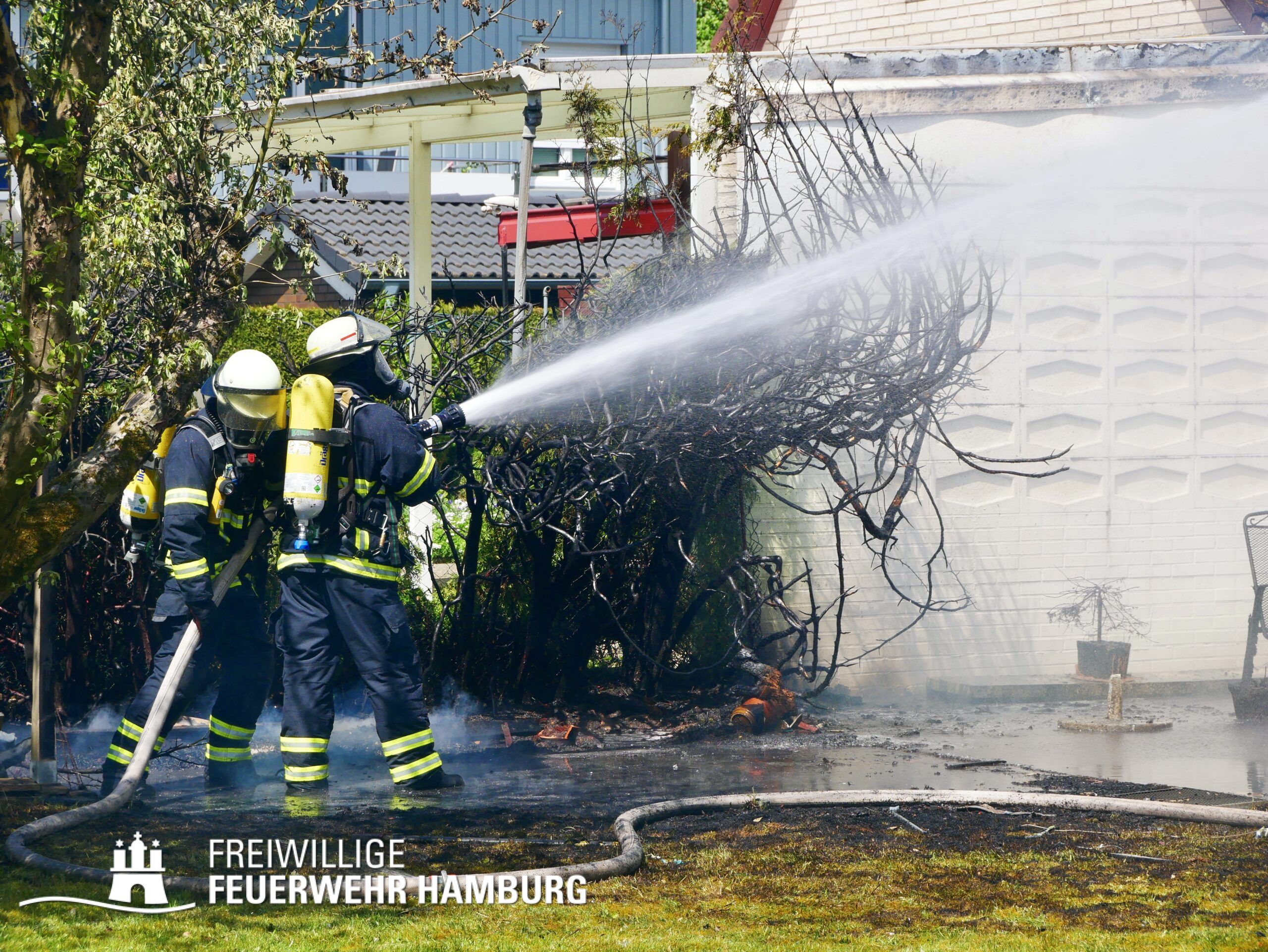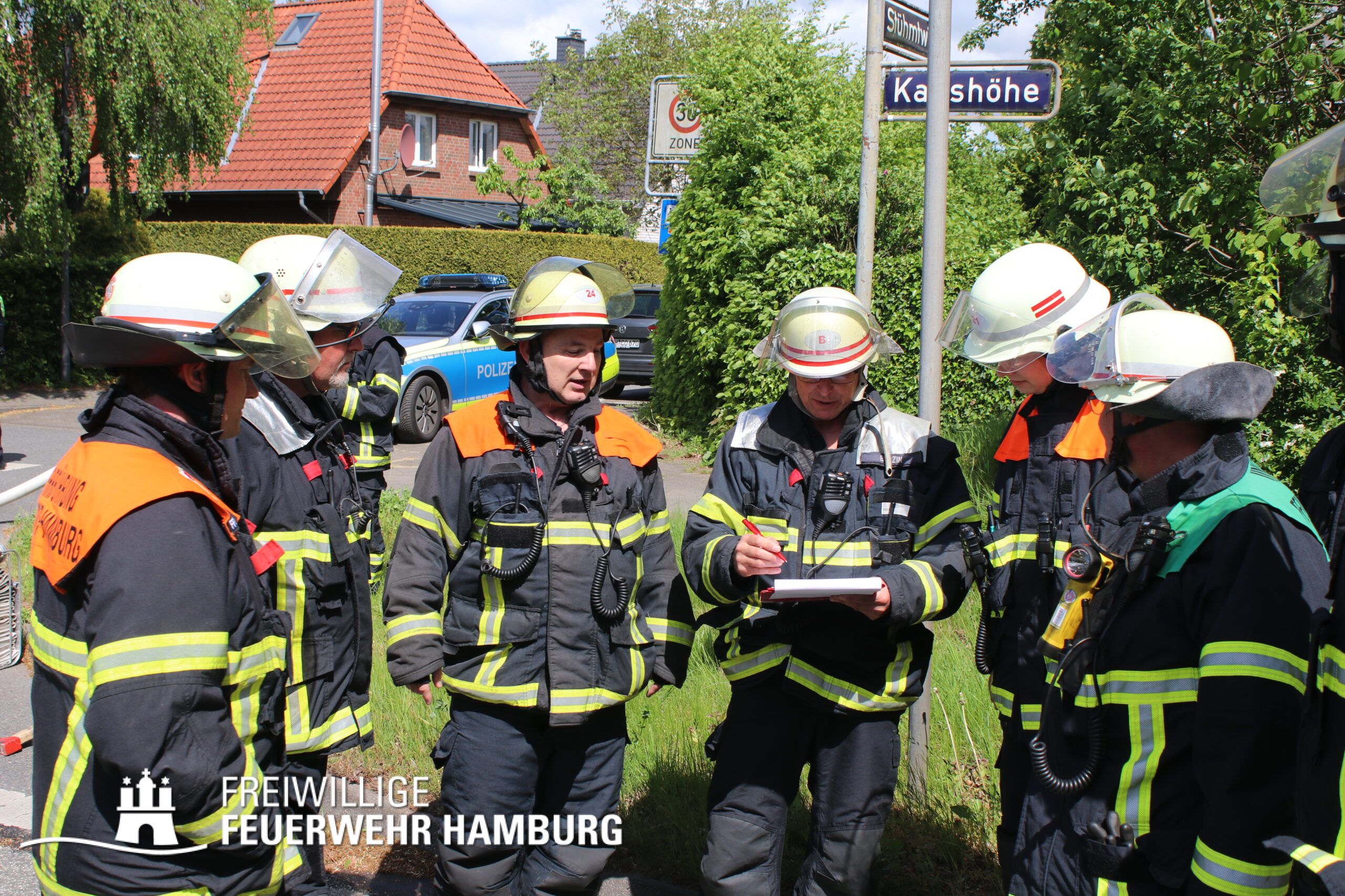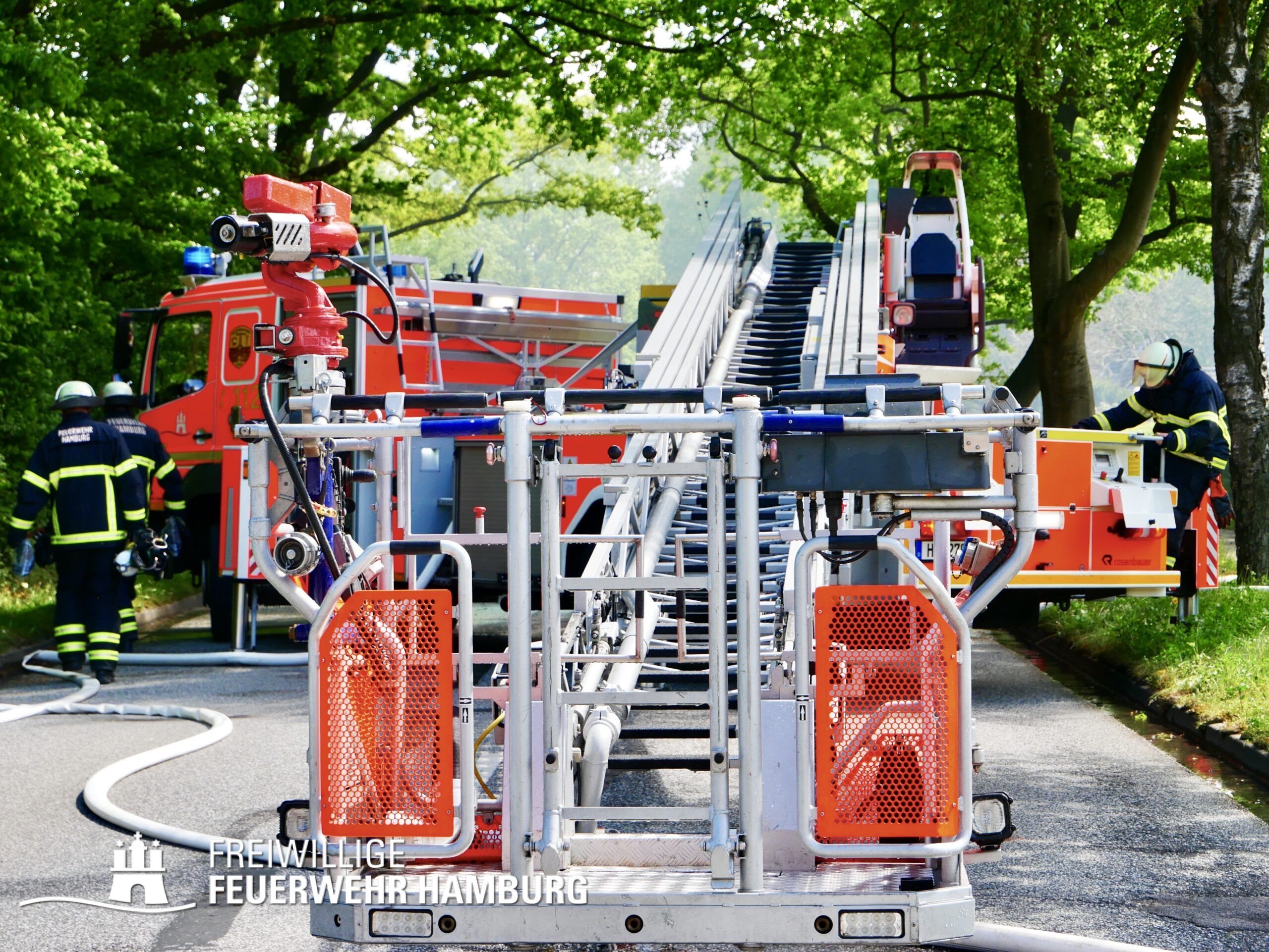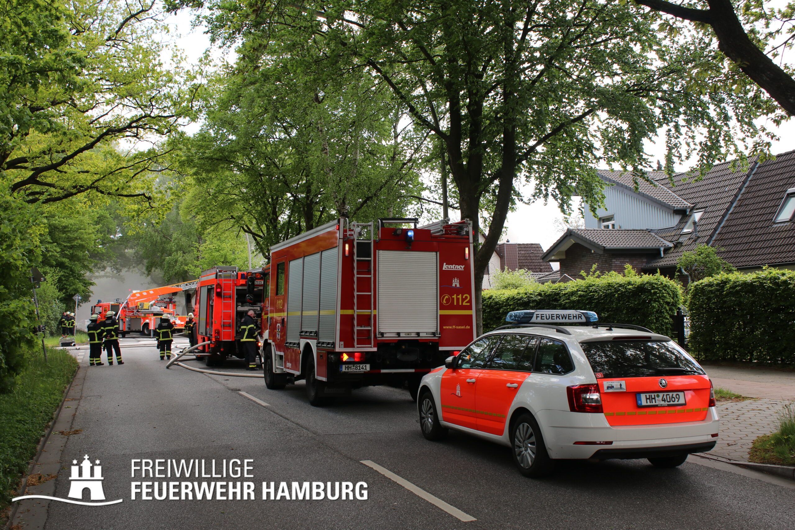 Die FF Sasel führte mit den Kräften der Berufsfeuerwehr Sasel einen umfassenden Löschangriff durch und stellte mehrere Trupps unter Atemschutz. Zusätzlich bauten sie eine Wasserversorgung auf und nahmen Teile des Daches über eine Steckleiter auf. Die FF Volksdorf unterstützte ebenfalls mit Atemschutzgeräteträgern bei der Brandbekämpfung und den Nachlöscharbeiten. Aufgrund der Anstrengung der Einsatzkräfte bei Sonne entschied sich der Bereichsführer Sven Kasch schnell dazu, die Verorgungs-Einheit der FF Ottensen-Bahrenfeld mit Kaltgetränken und Snacks anzufordern. Weiterhin koordinierte Sven Kasch die Kräfte der Freiwilligen Feuerwehr vor Ort.