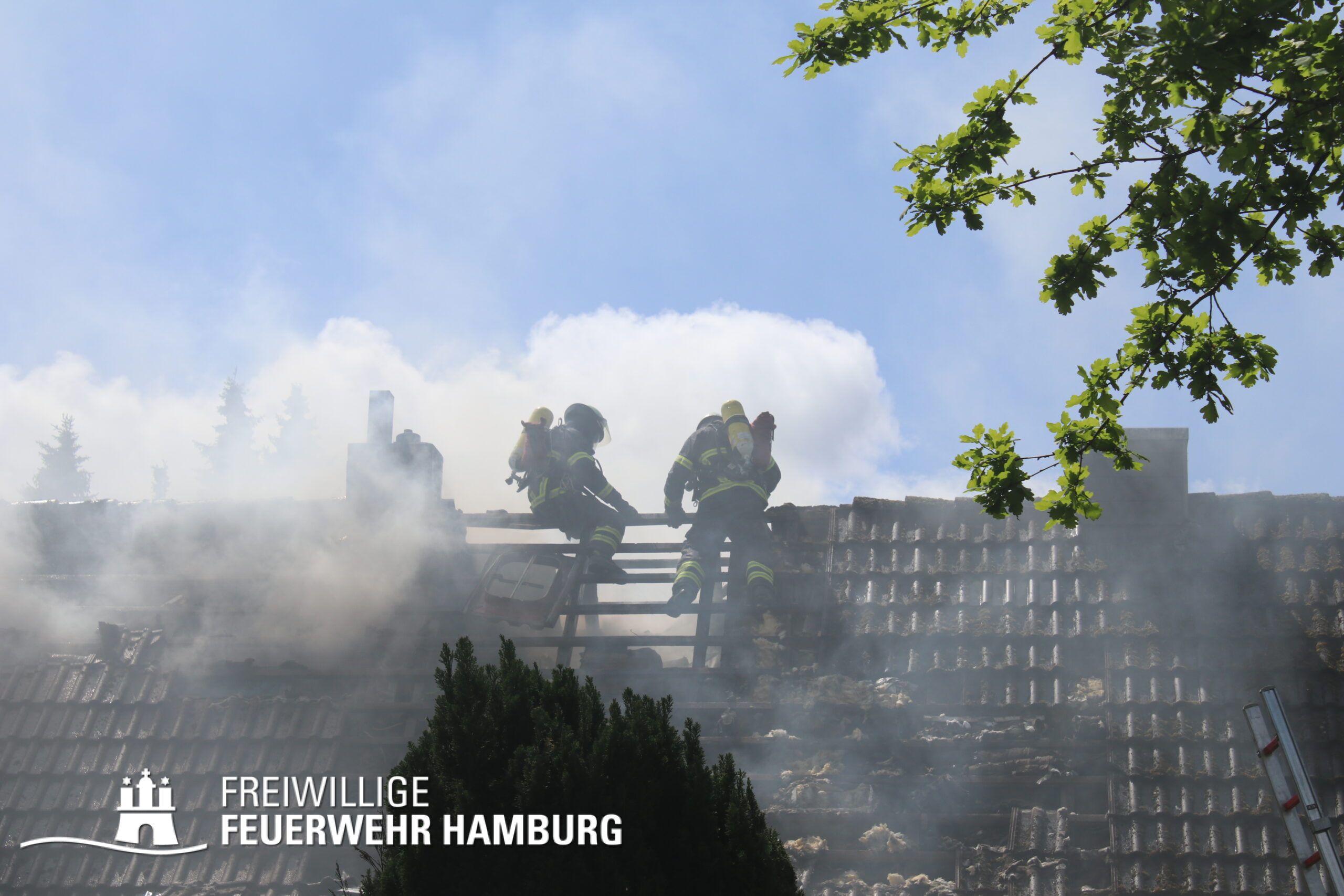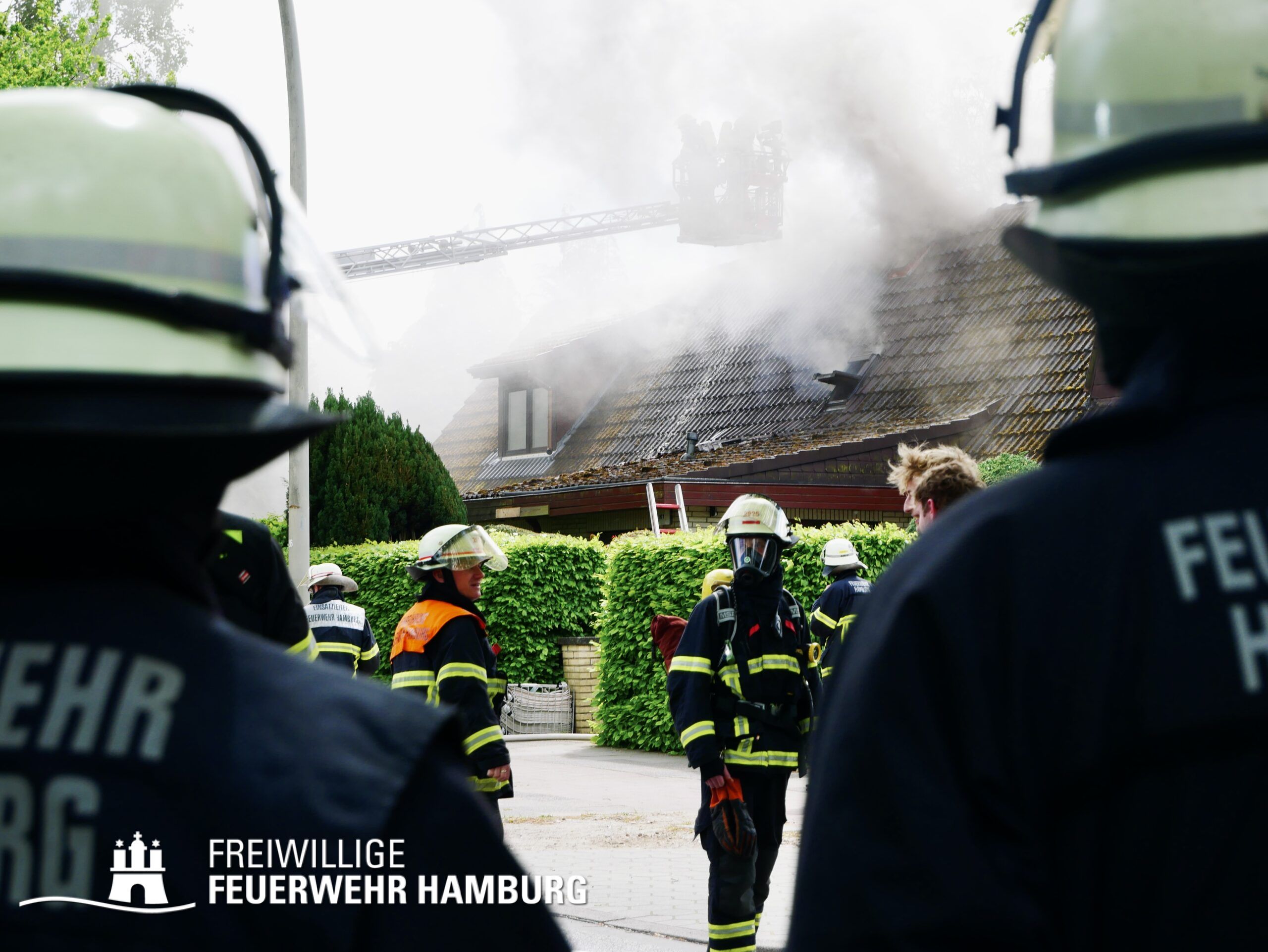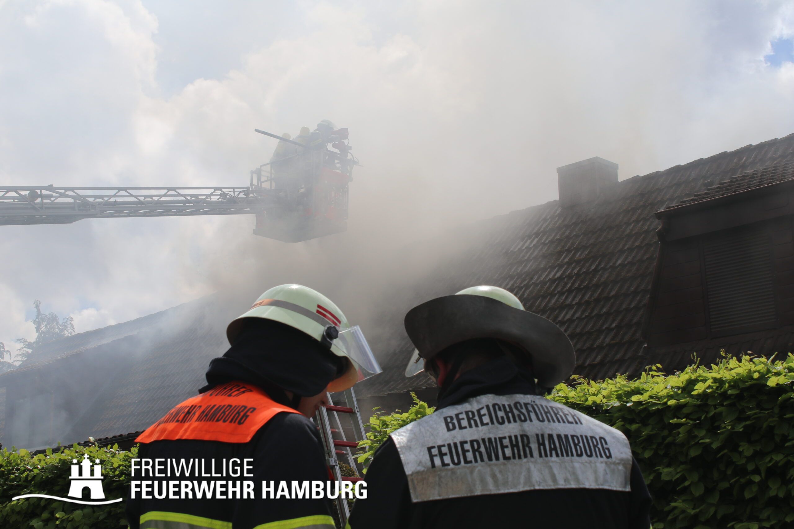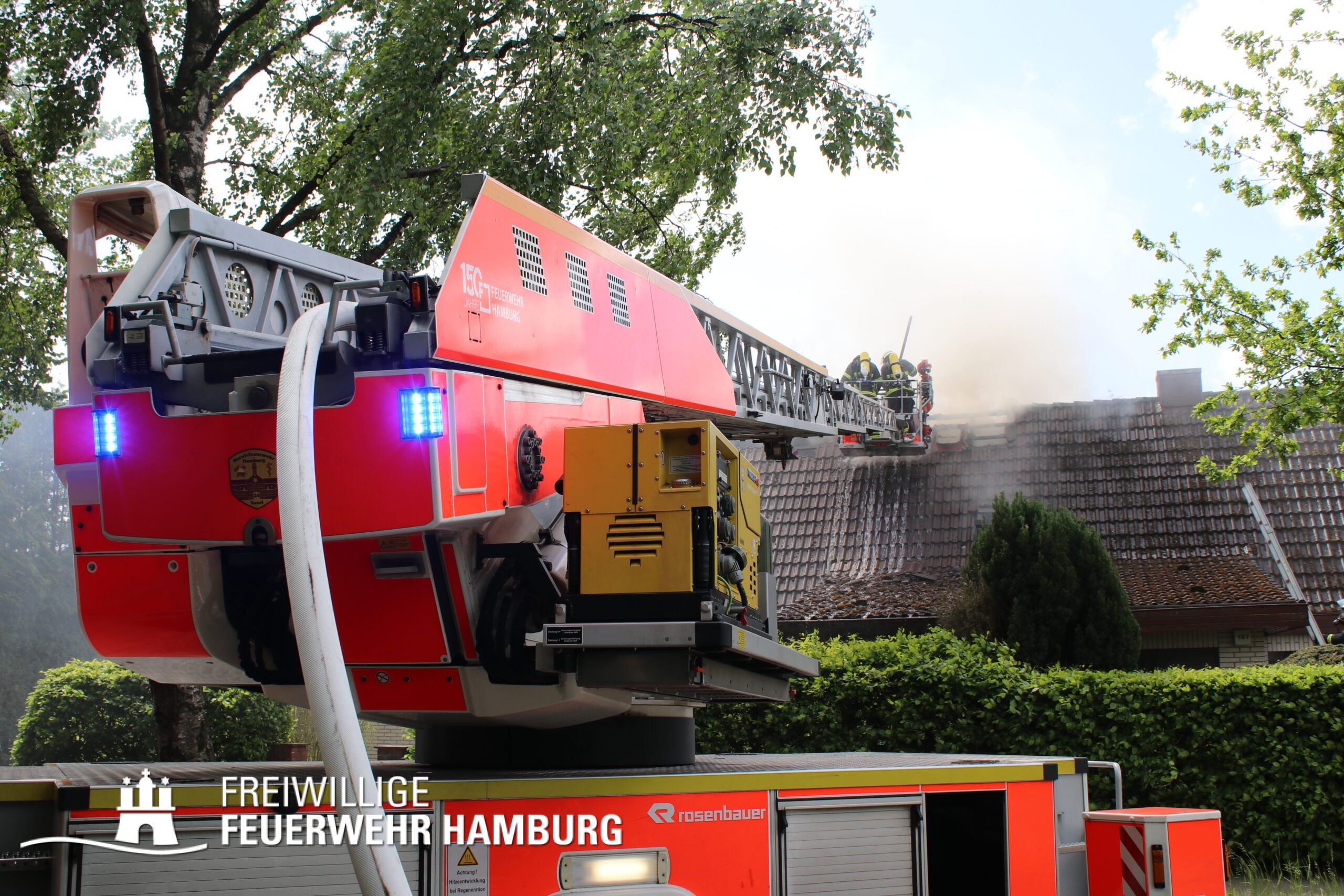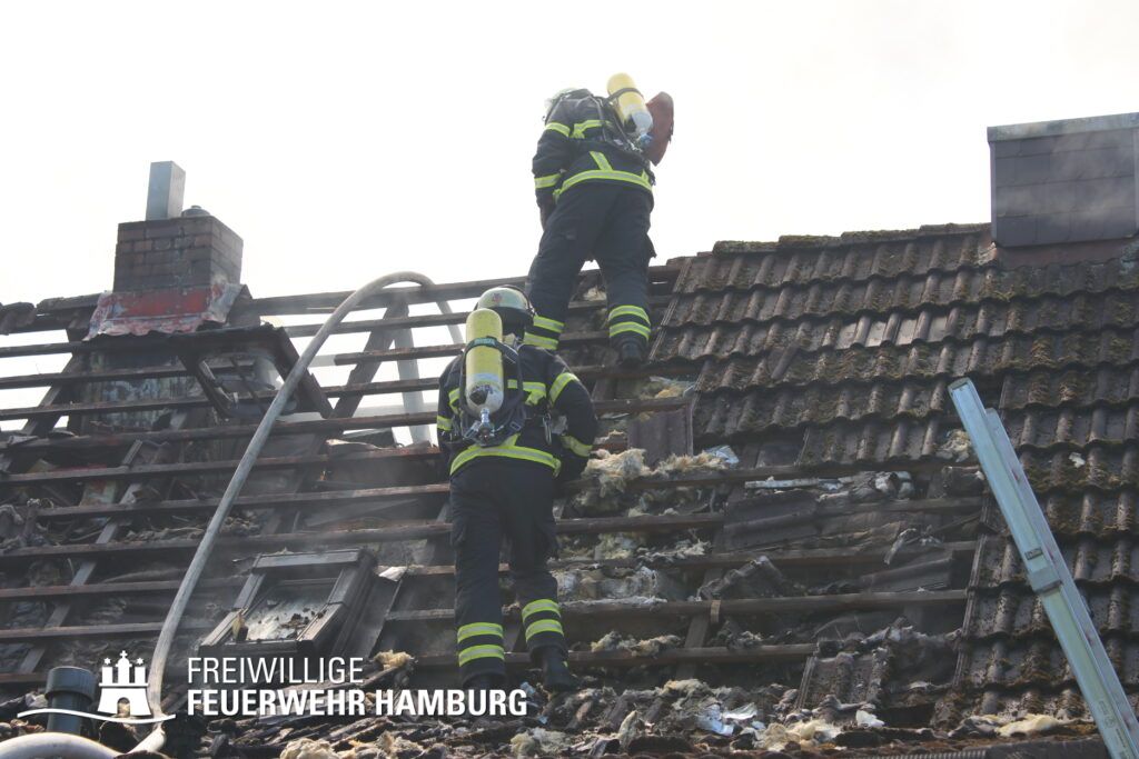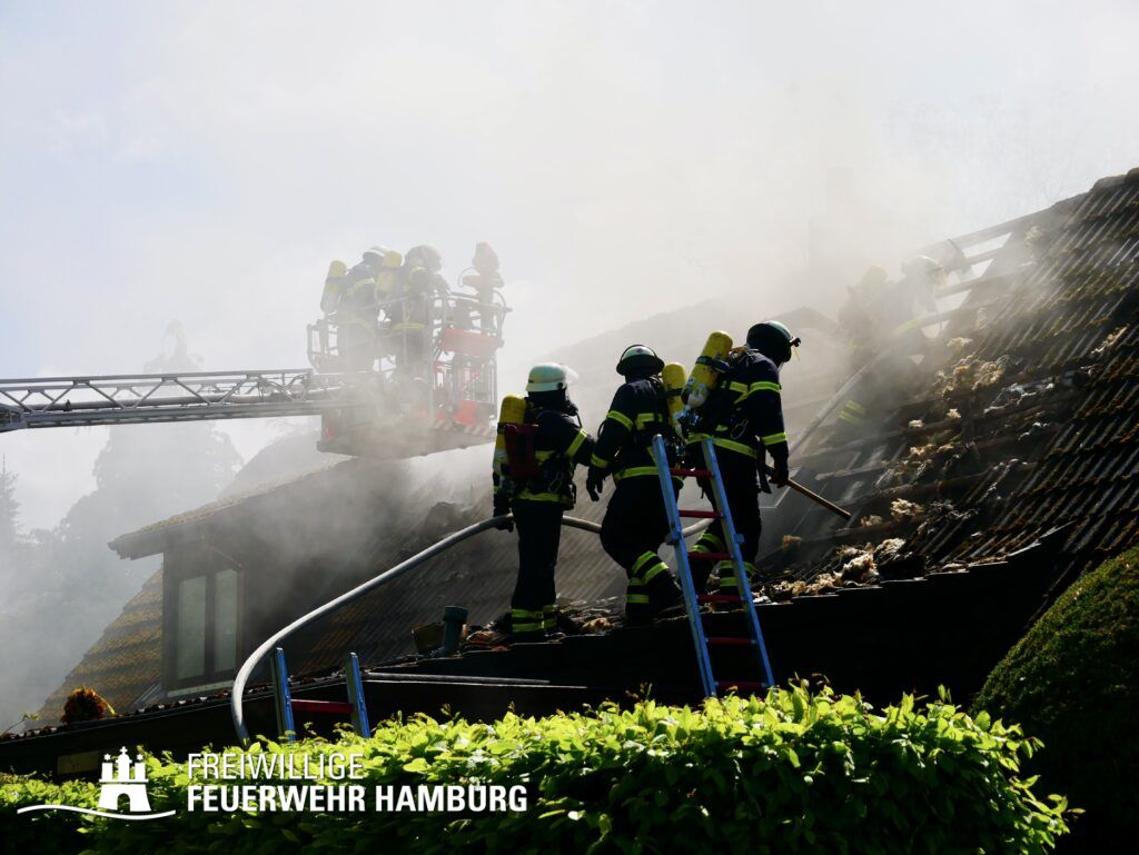 BF Sasel und der FF Sasel eintrafen, drang schon dichter Rauch aus dem Dachbereich der Doppelhaushälfte. Die Einsatzleitung vor Ort erhöhte daher umgehend das Alarmstichwort auf FEU2 (Feuer, 2 Löschzüge) und leitete die Brandbekämpfung