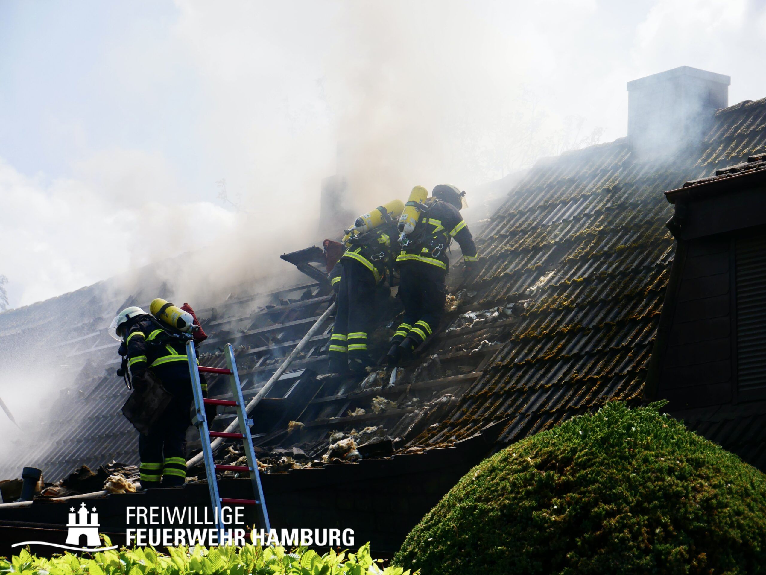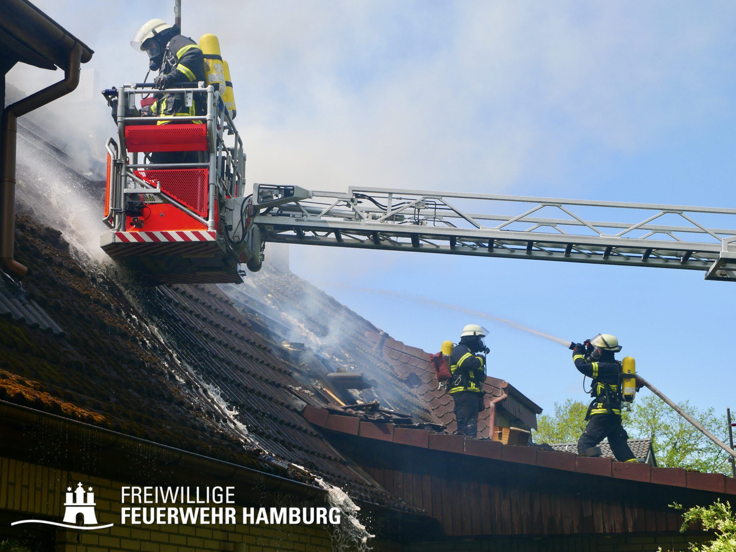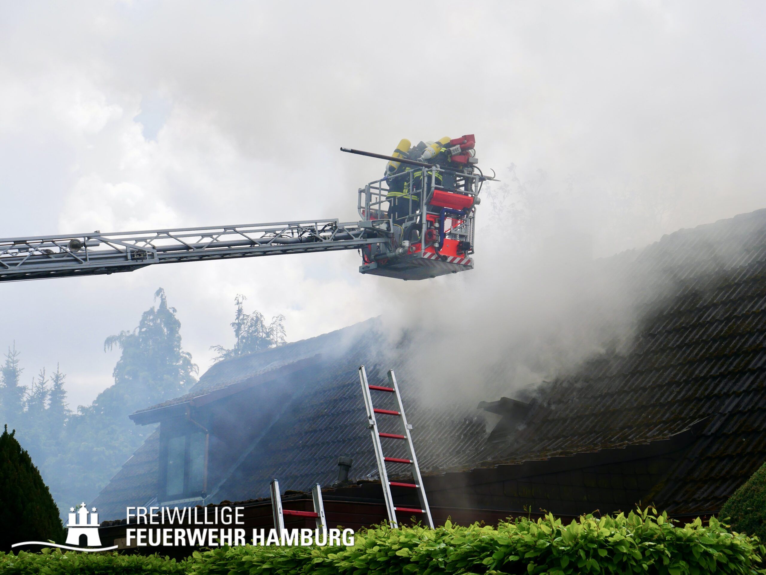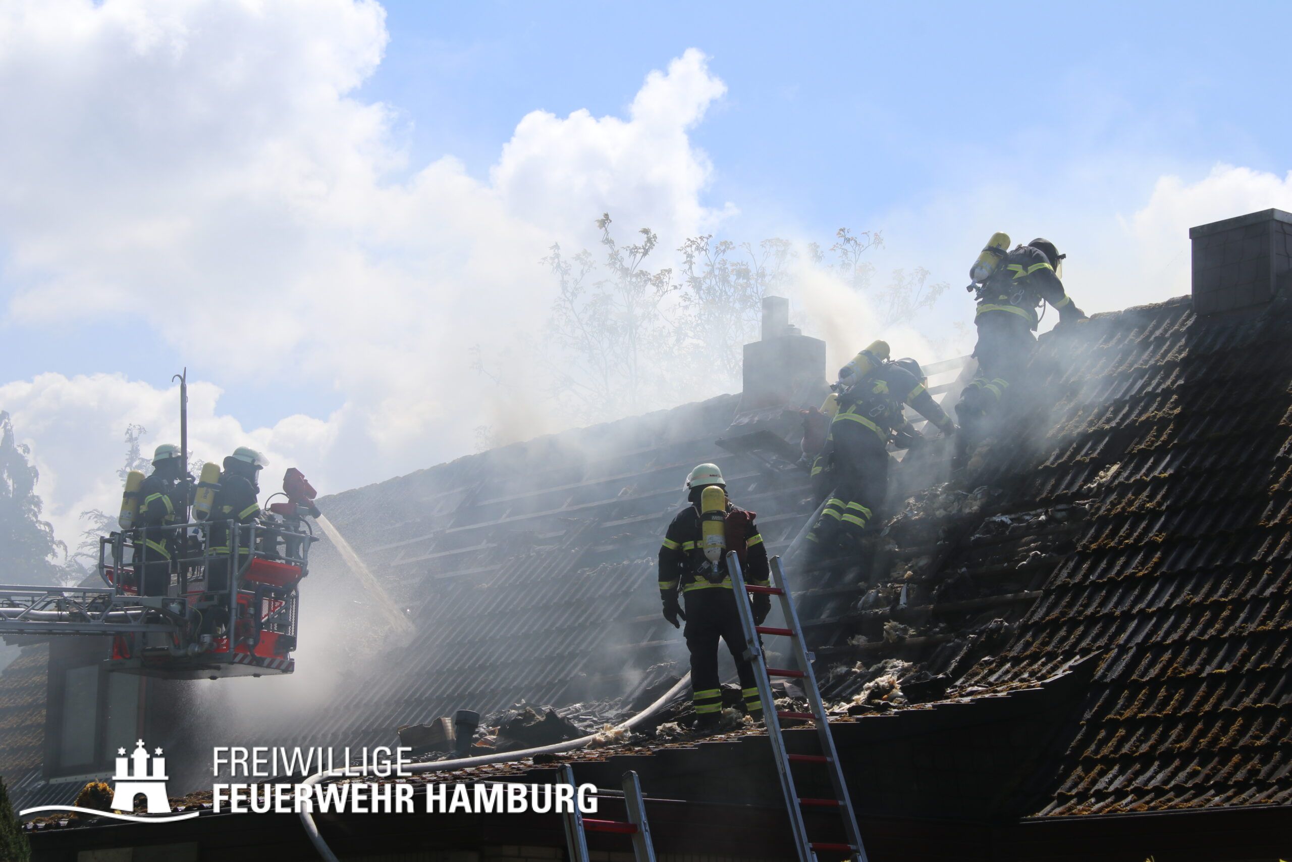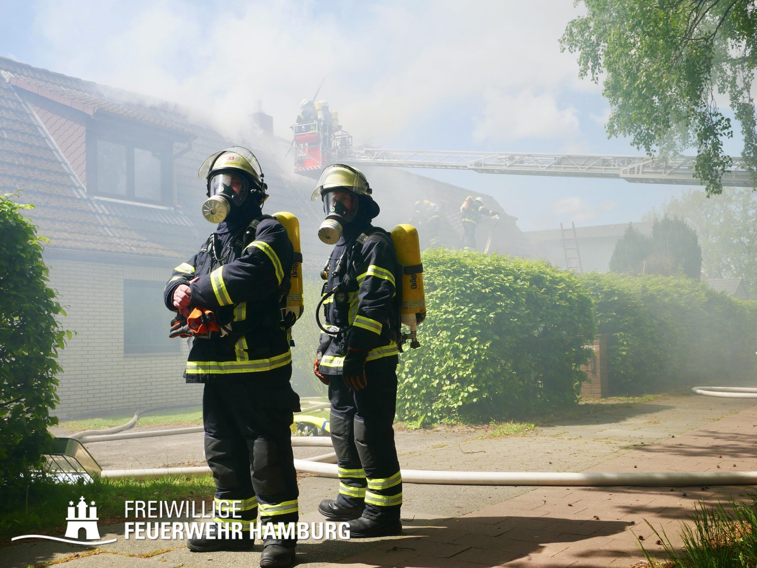 BF Sasel und der FF Sasel eintrafen, drang schon dichter Rauch aus dem Dachbereich der Doppelhaushälfte. Die Einsatzleitung vor Ort erhöhte daher umgehend das Alarmstichwort auf FEU2 (Feuer, 2 Löschzüge) und leitete die Brandbekämpfung