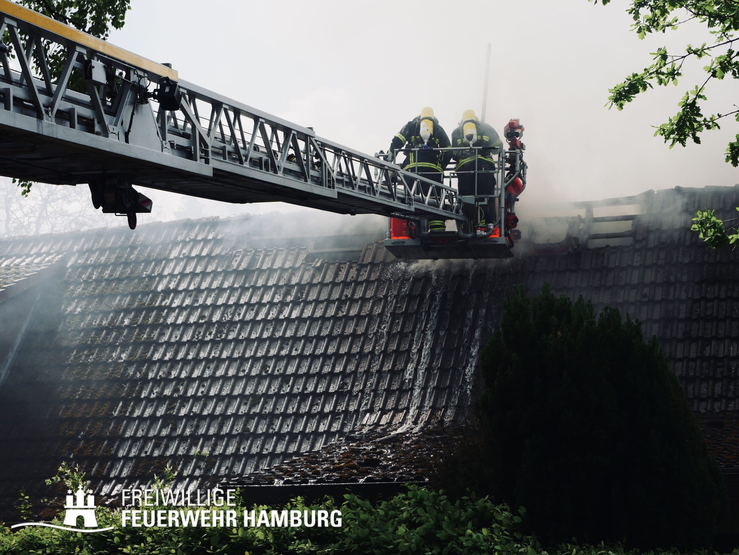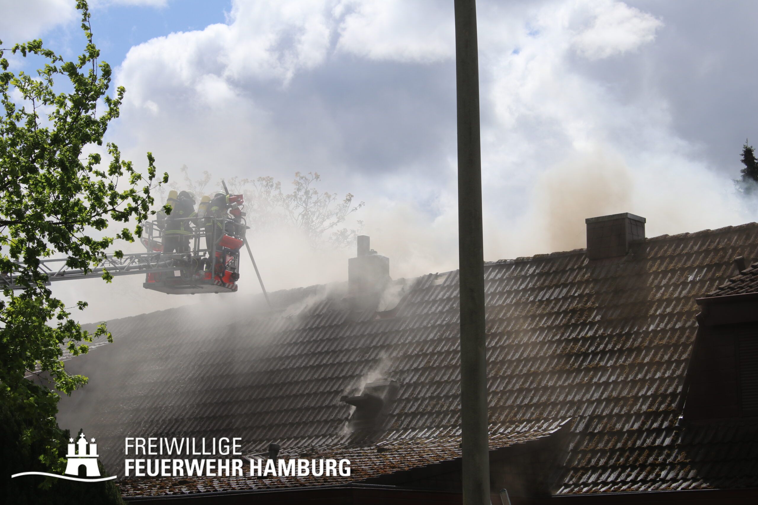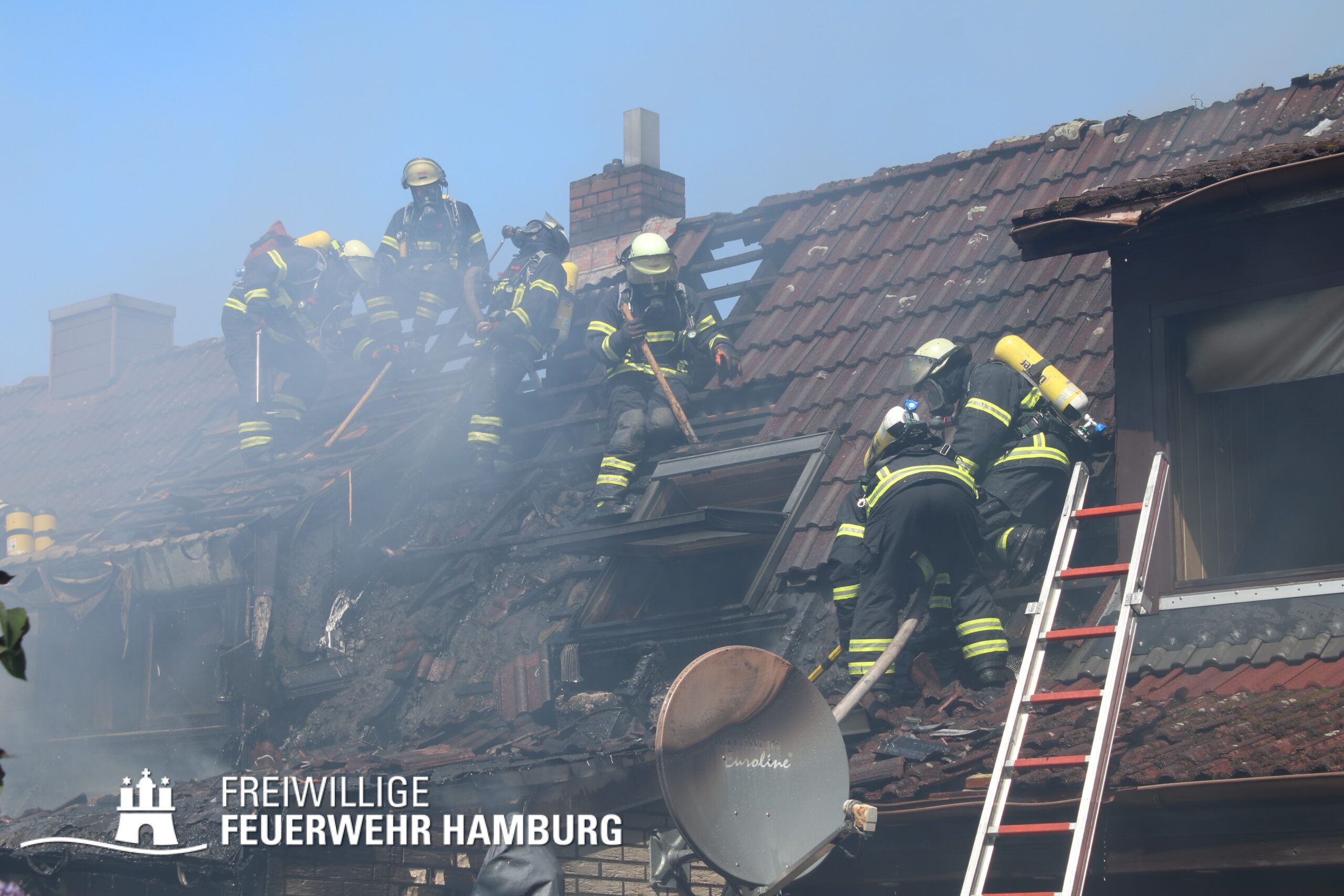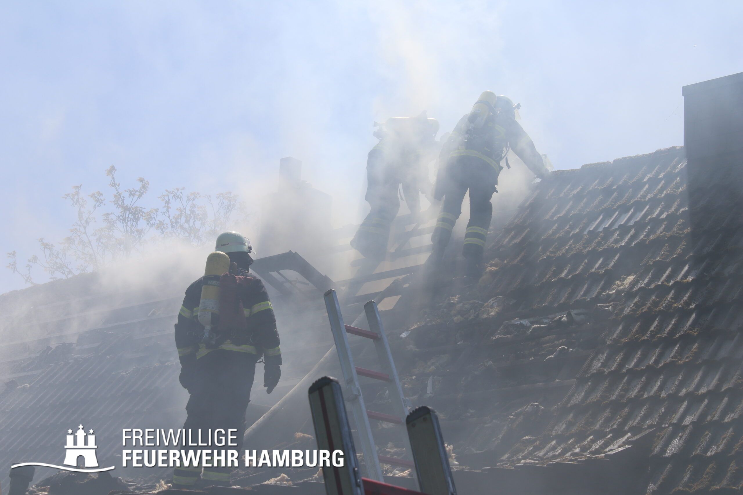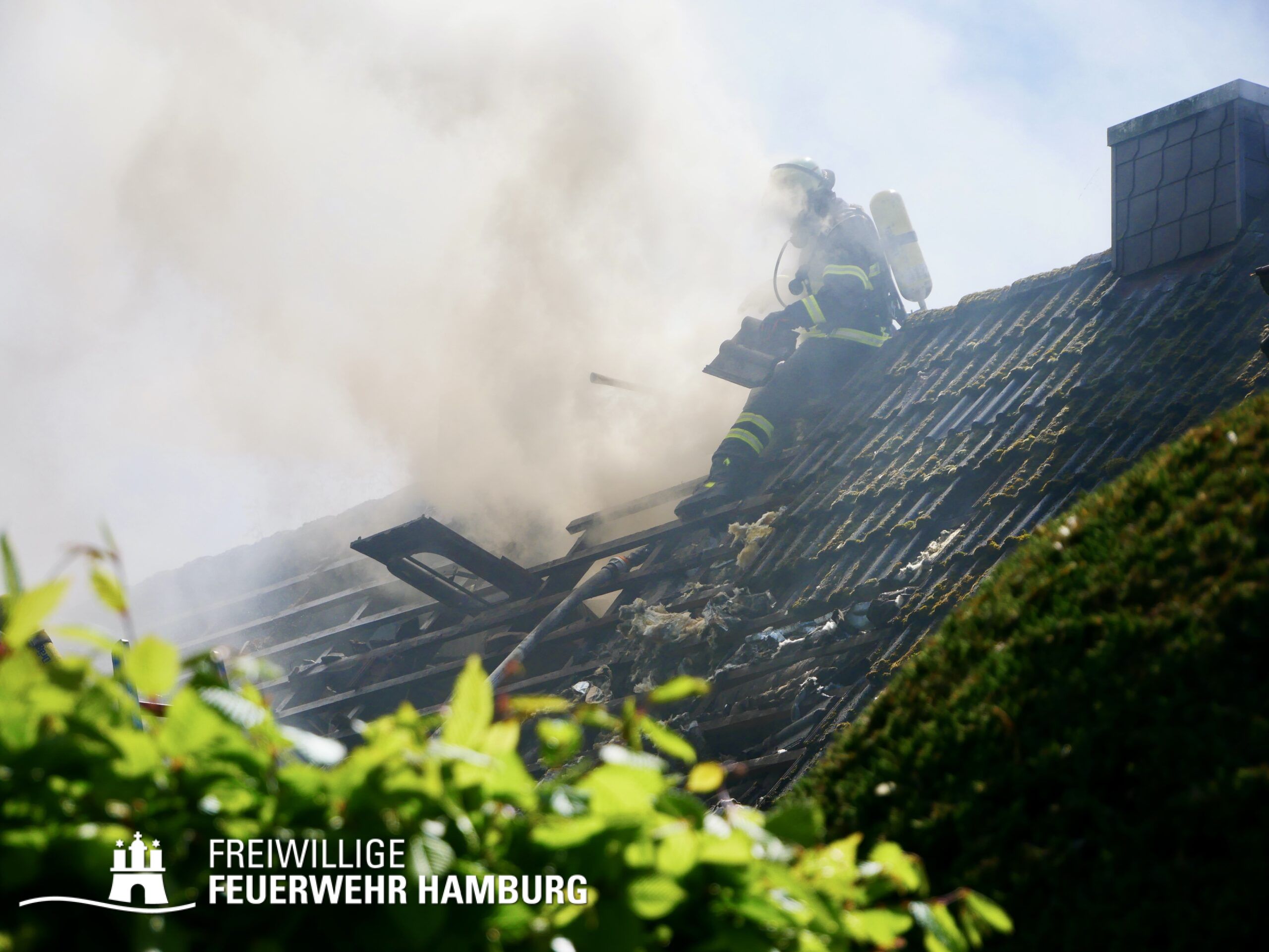 BF Sasel und der FF Sasel eintrafen, drang schon dichter Rauch aus dem Dachbereich der Doppelhaushälfte. Die Einsatzleitung vor Ort erhöhte daher umgehend das Alarmstichwort auf FEU2 (Feuer, 2 Löschzüge) und leitete die Brandbekämpfung