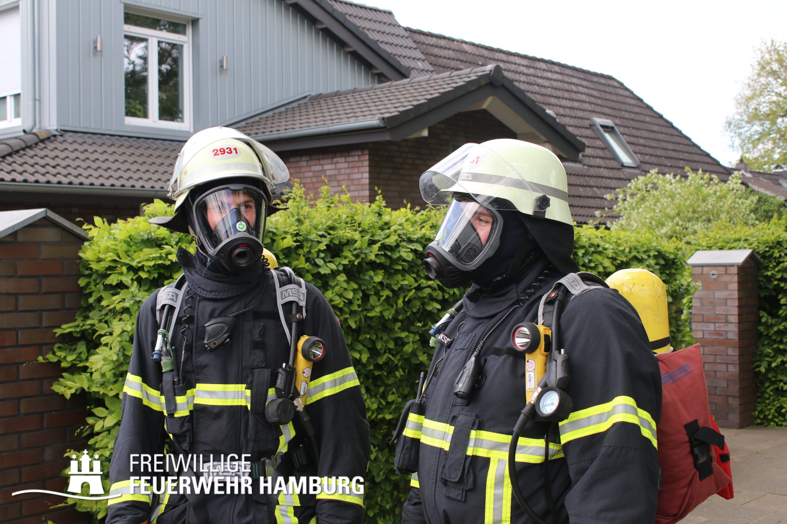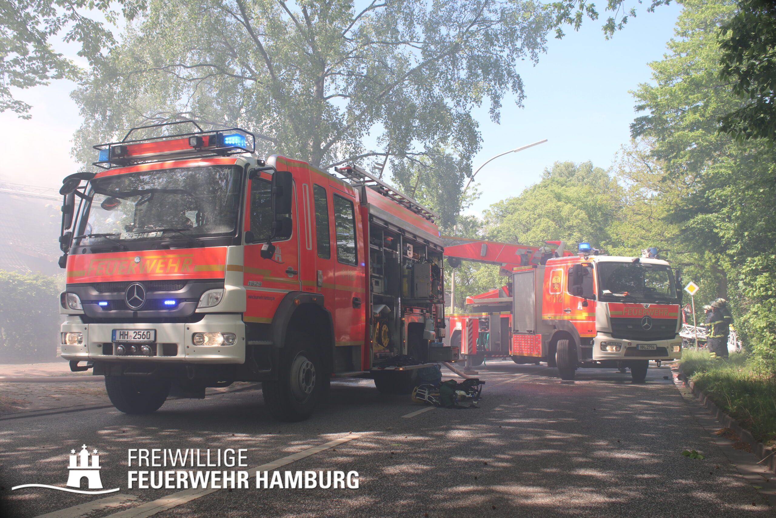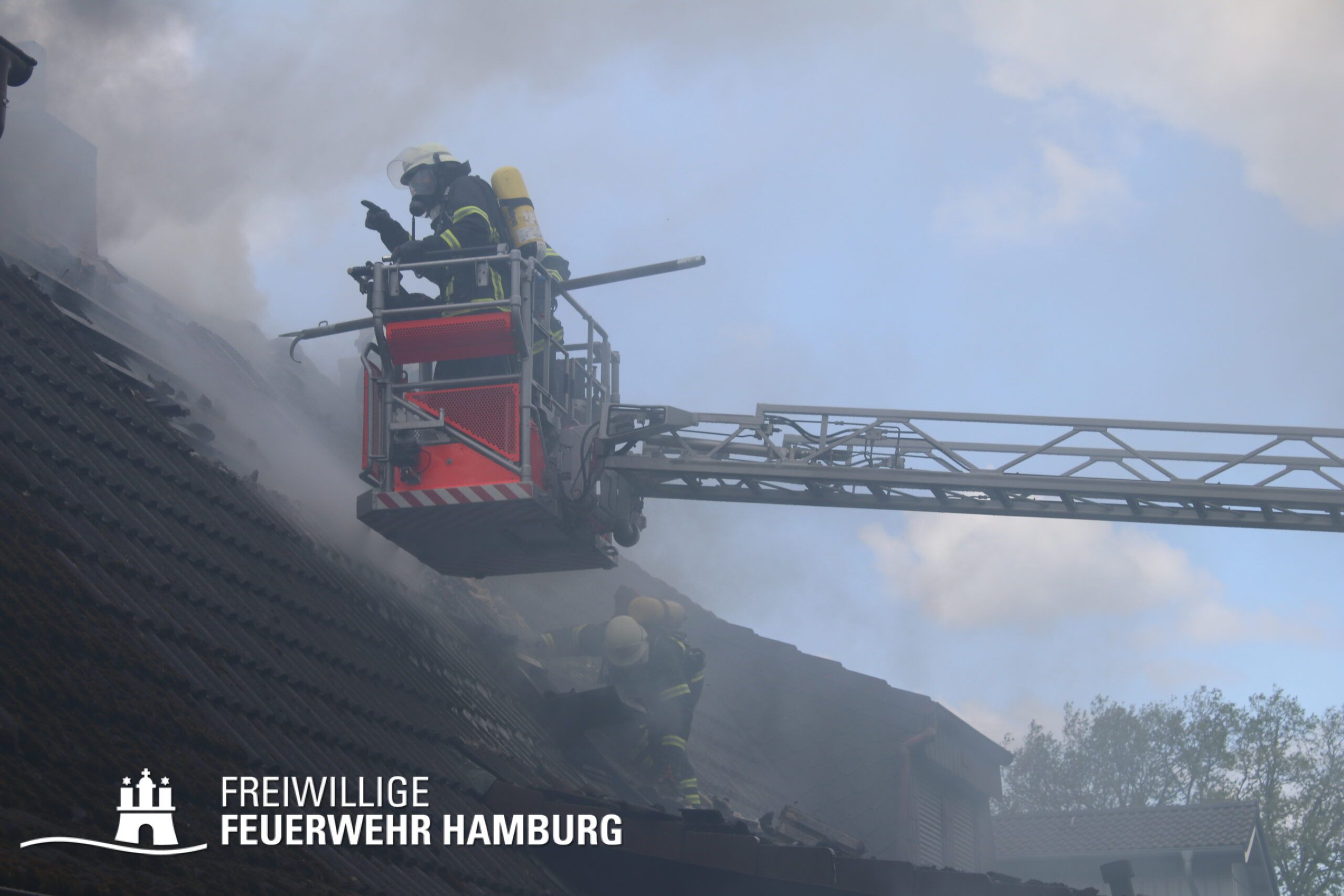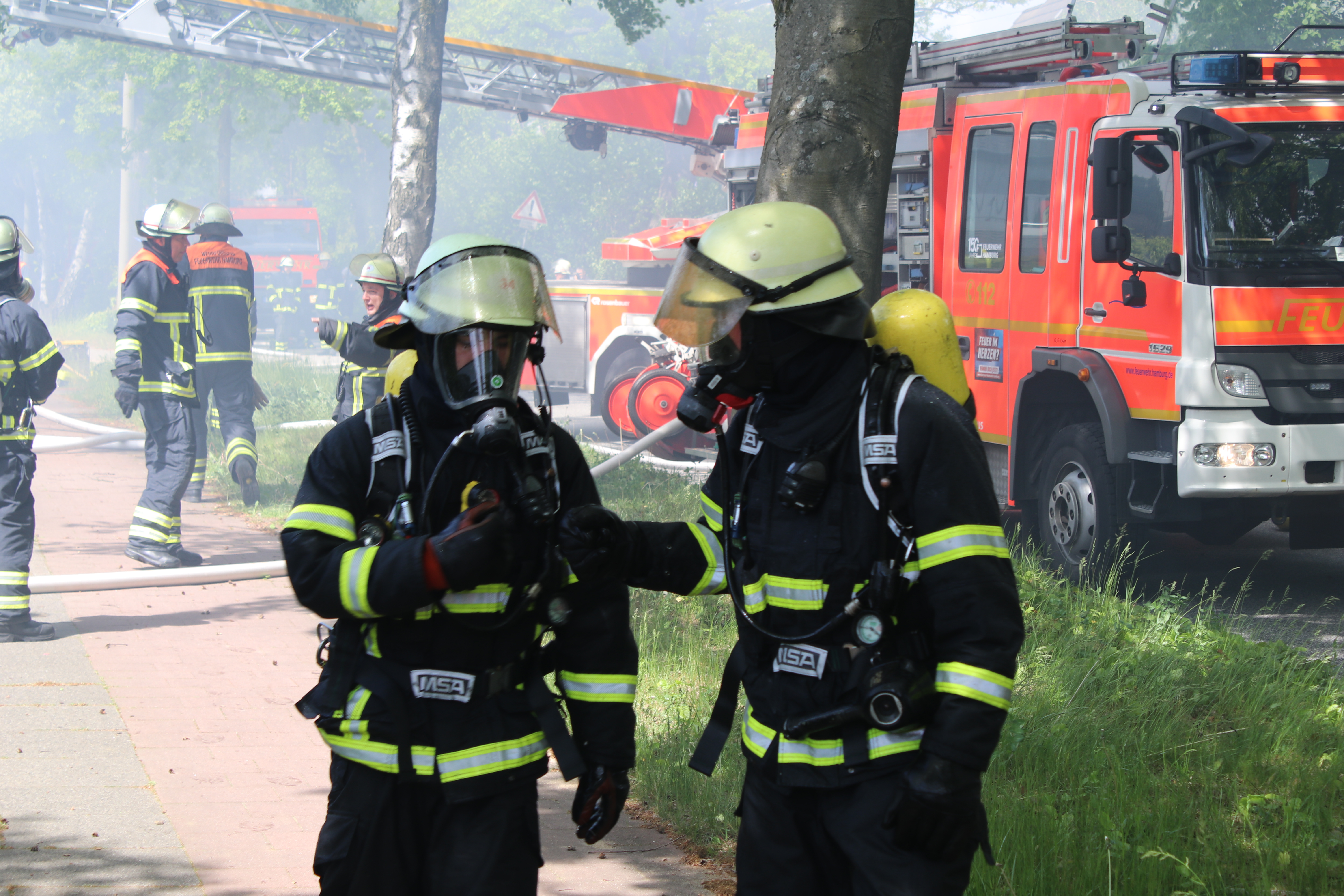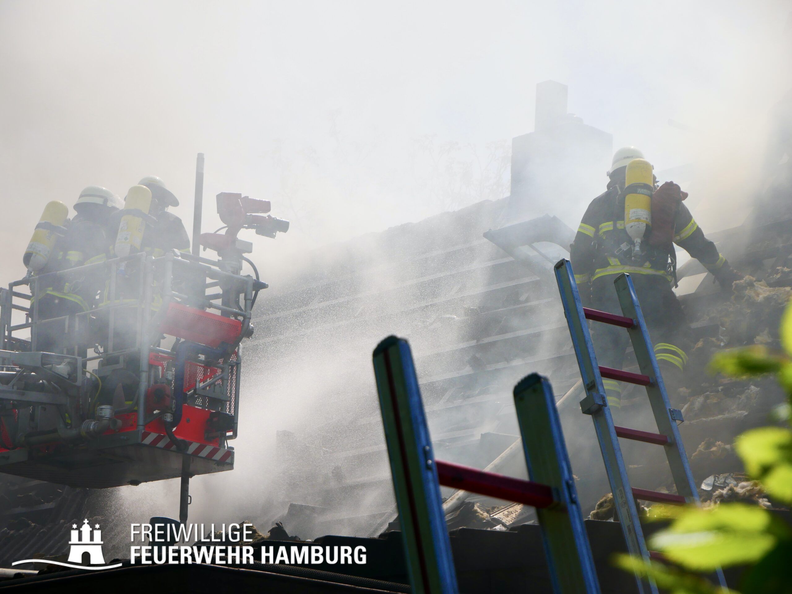 BF Sasel und der FF Sasel eintrafen, drang schon dichter Rauch aus dem Dachbereich der Doppelhaushälfte. Die Einsatzleitung vor Ort erhöhte daher umgehend das Alarmstichwort auf FEU2 (Feuer, 2 Löschzüge) und leitete die Brandbekämpfung