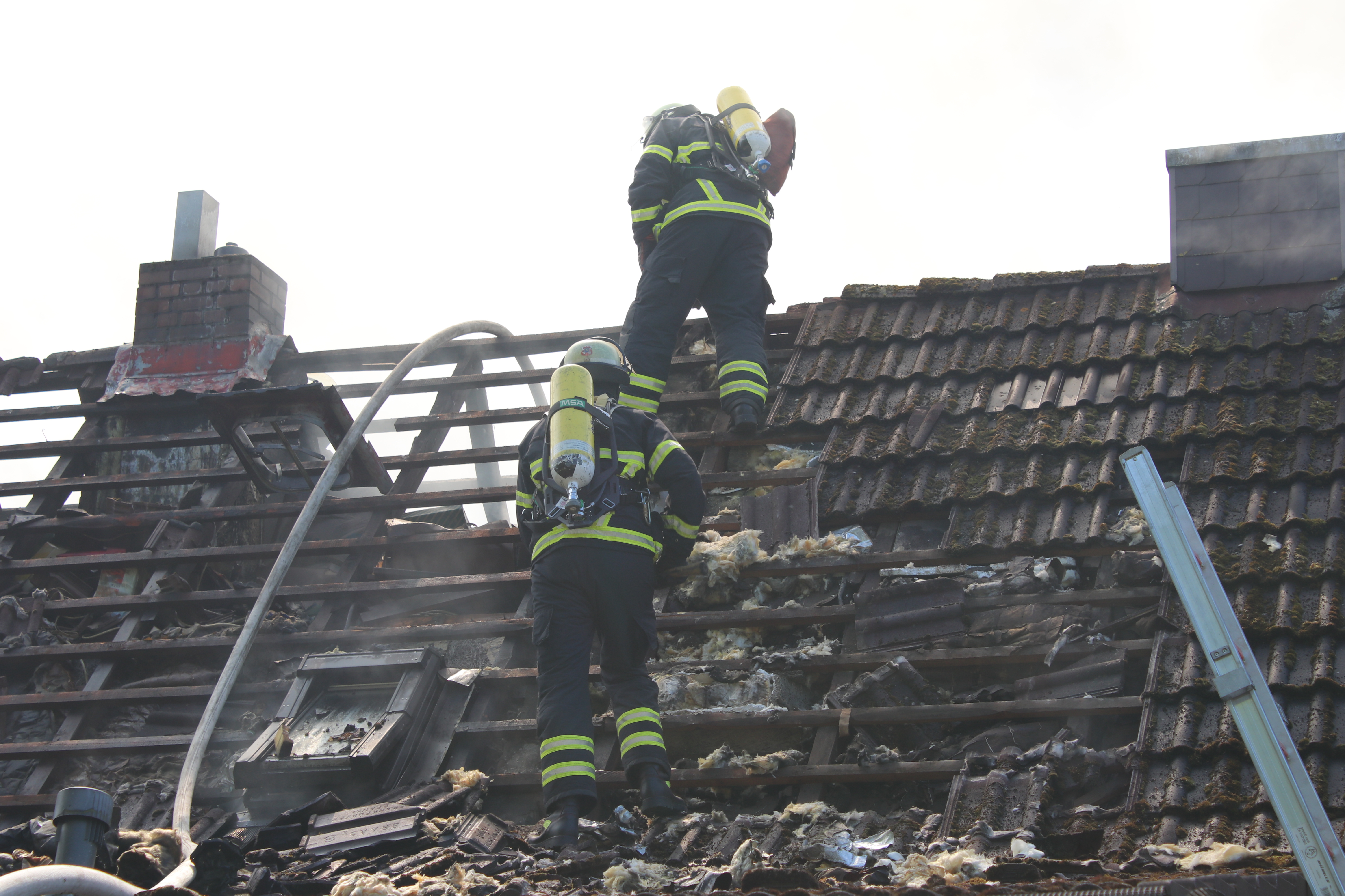 ein. Über den Hauseingang und den Garten wurden sofort mehrere C-Rohre aufgebaut. Über zwei Drehleitern und tragbare Leitern wurden Dachteile aufgenommen, um besser an das Feuer zu kommen. Insgesamt wurden 5 C-Rohre im Innen- und Außenangriff