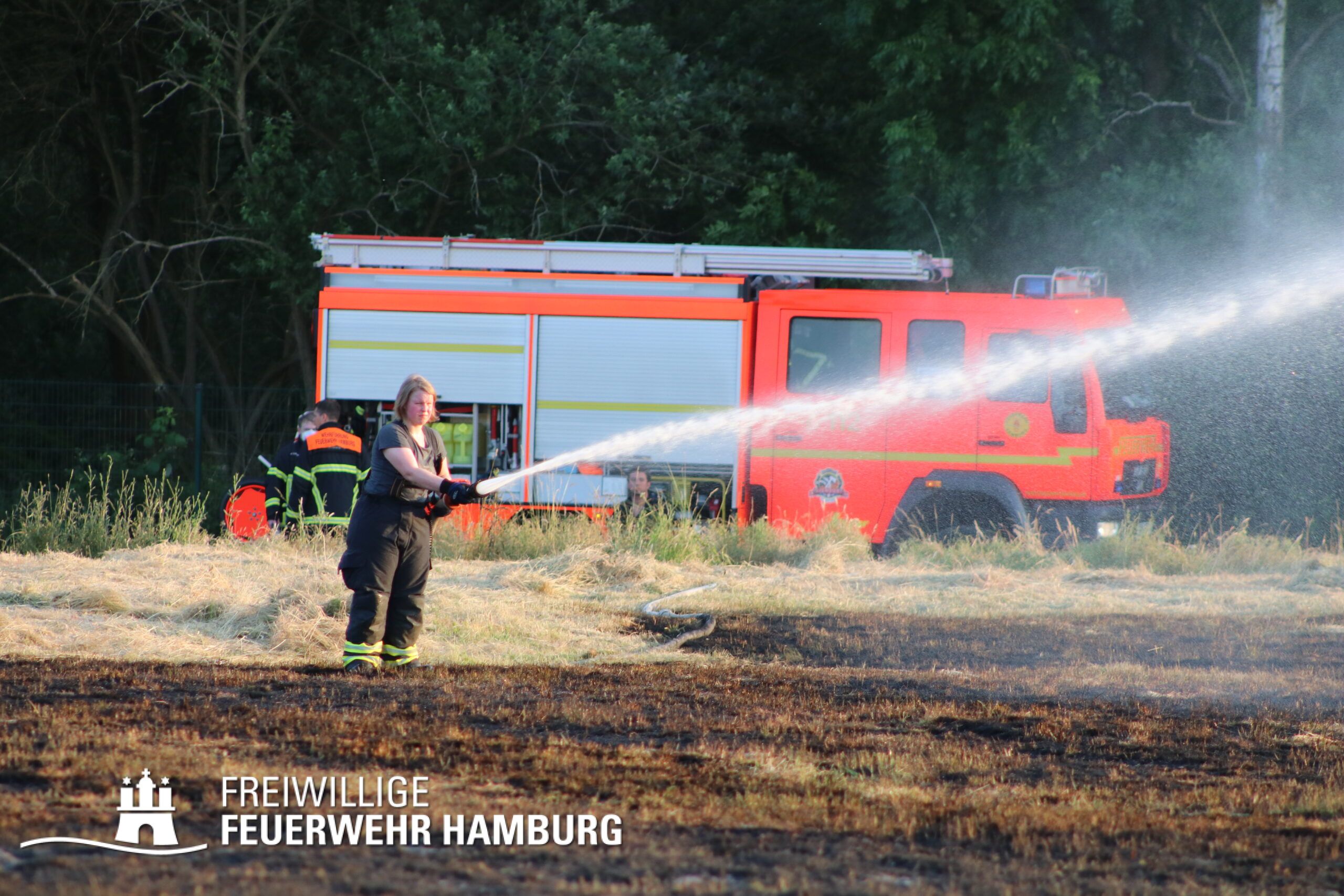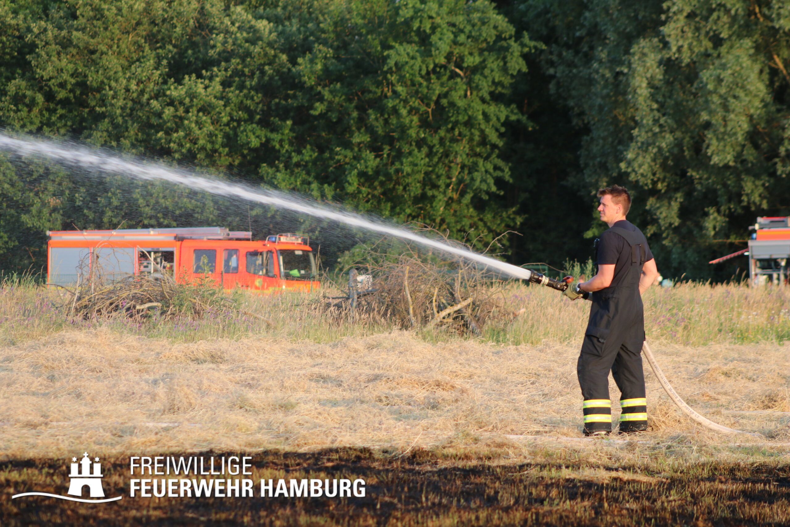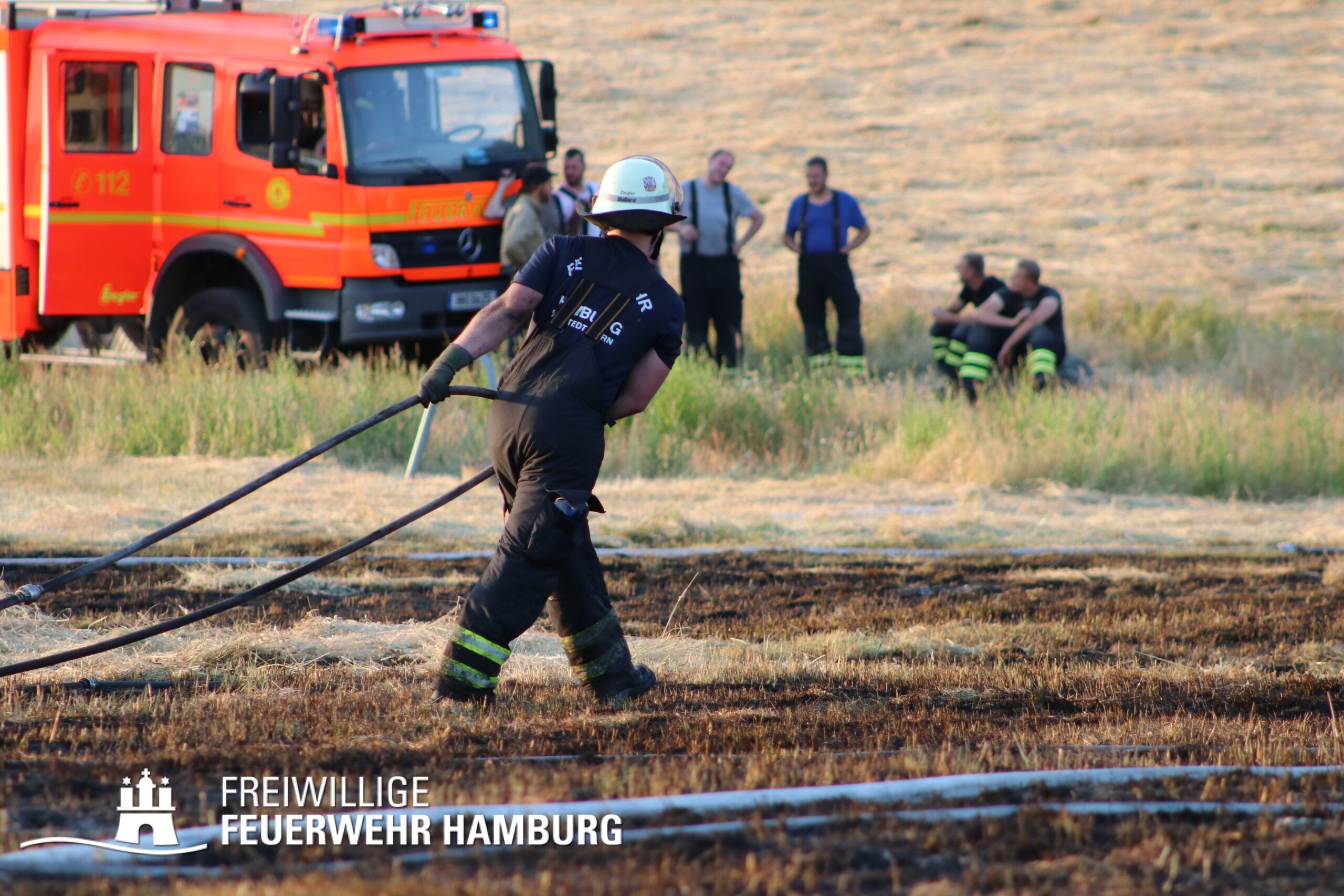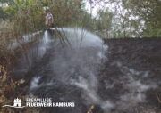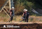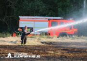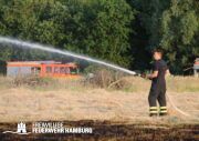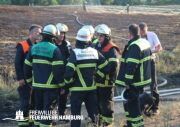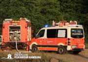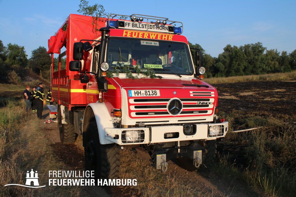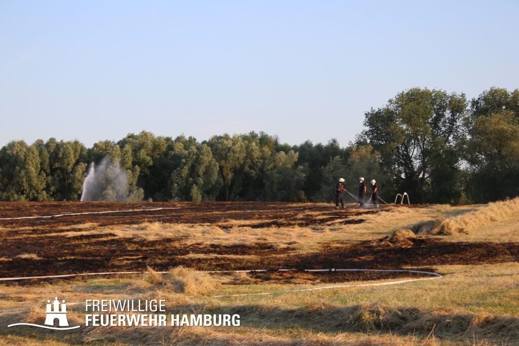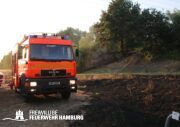 Die momentane Trockenheit und Hitze verlangt unseren Feuerwehren in Hamburg gerade viel ab. Immer wieder kommt es zu Bränden auf Wiesen oder in Wäldern. So auch heute gegen kurz vor 18 Uhr. Die Leitstelle alarmierte die zunächst die FF Kirchsteinbek gemeinsam mit der Löschgruppe der Berufsfeuerwehr Billstedt, ergänzt wurde das ganze durch den GW-R1 mit Waldbrandkomponente der FF Billstedt-Horn. Eine richtige Anfahrt gestaltete sich schwierig, so dass etwas länger die richtige Zuwegung gesucht werden musste. Vor Ort wurde ein Feuer auf einem Feld mit massiver Brandausbreitung vorgefunden. Sofort wurde ein Löschangriff vorgenommen und weitere Kräfte nachalarmiert. Das Feld brannte auf etwa 20 000qm und drohte sich weiter auszubreiten. Über einen Feldweg gab es einen Flammenüberschlag auf einen Wall sowie andere Teile eines Feldes.