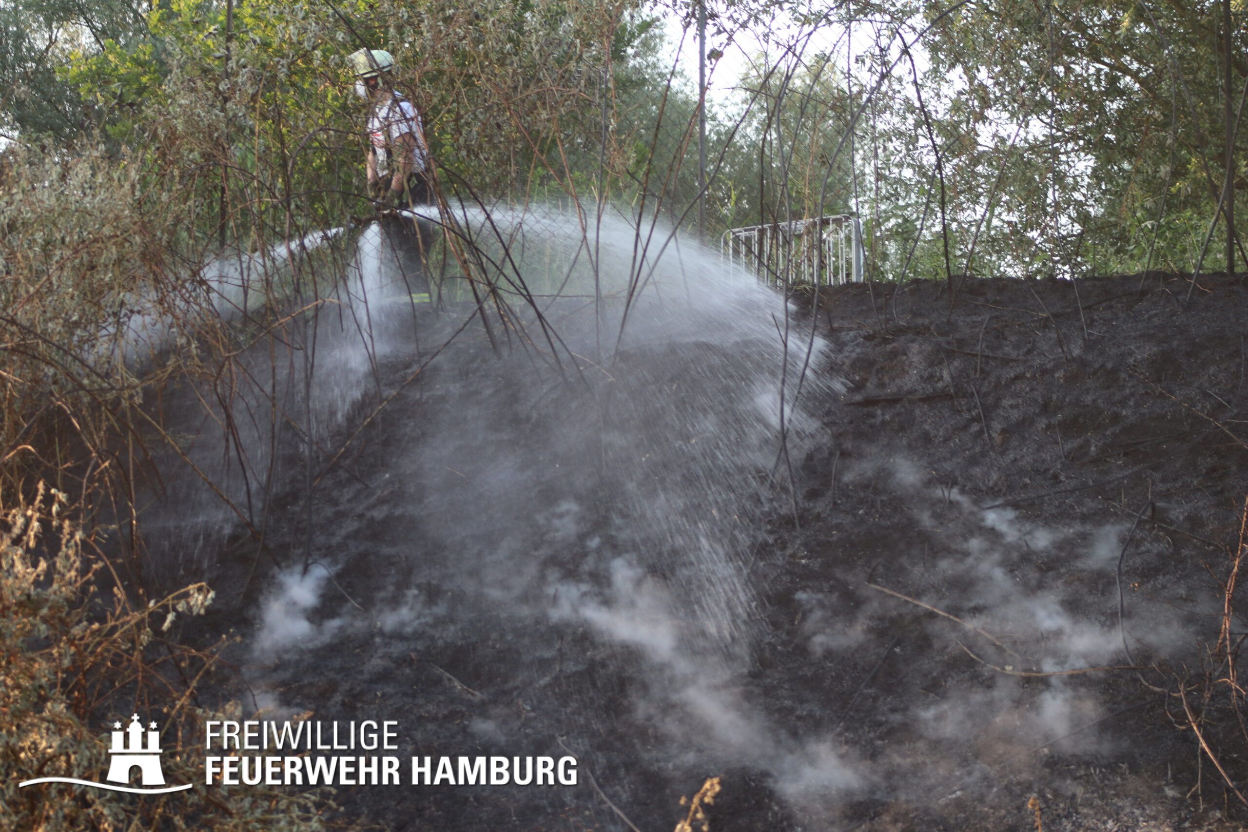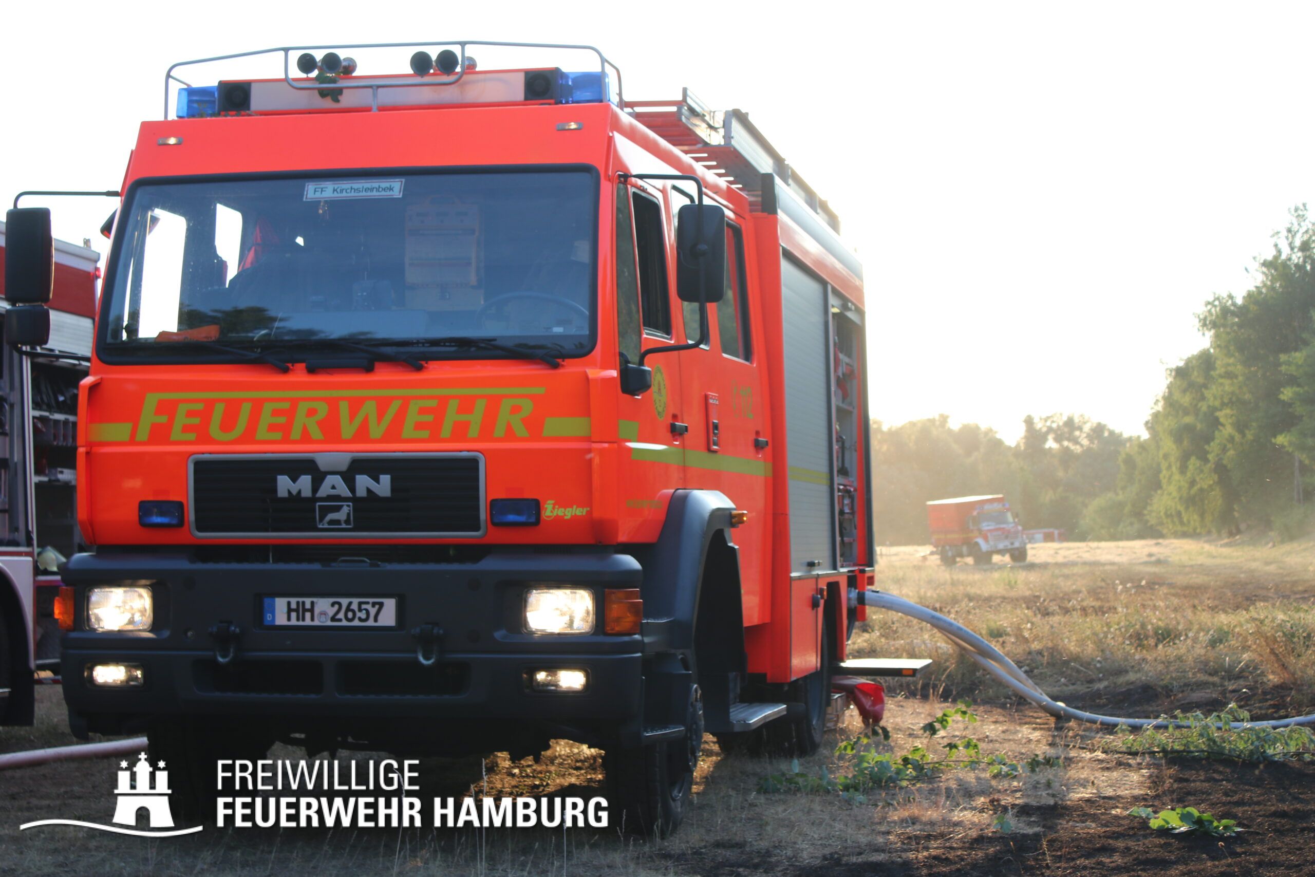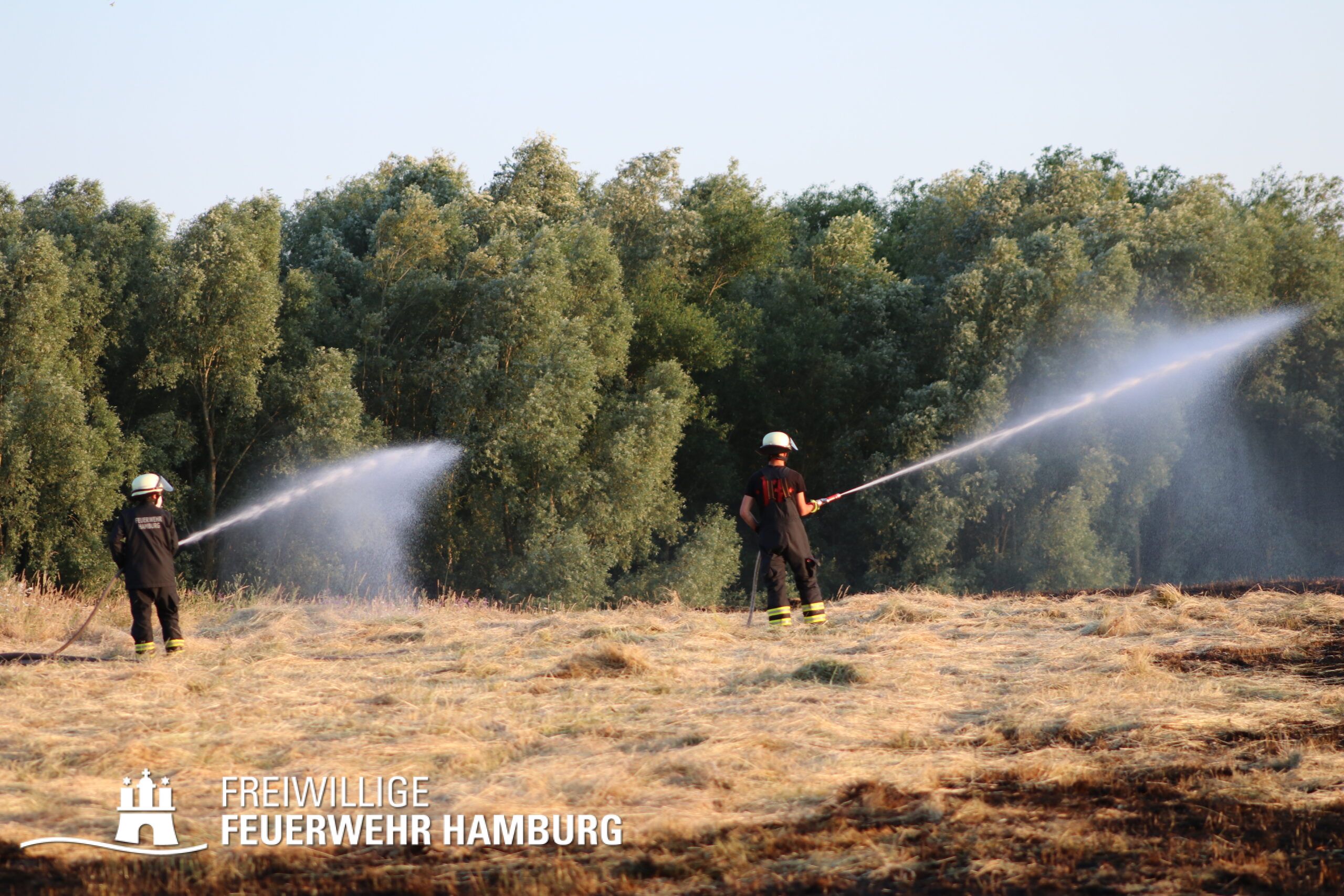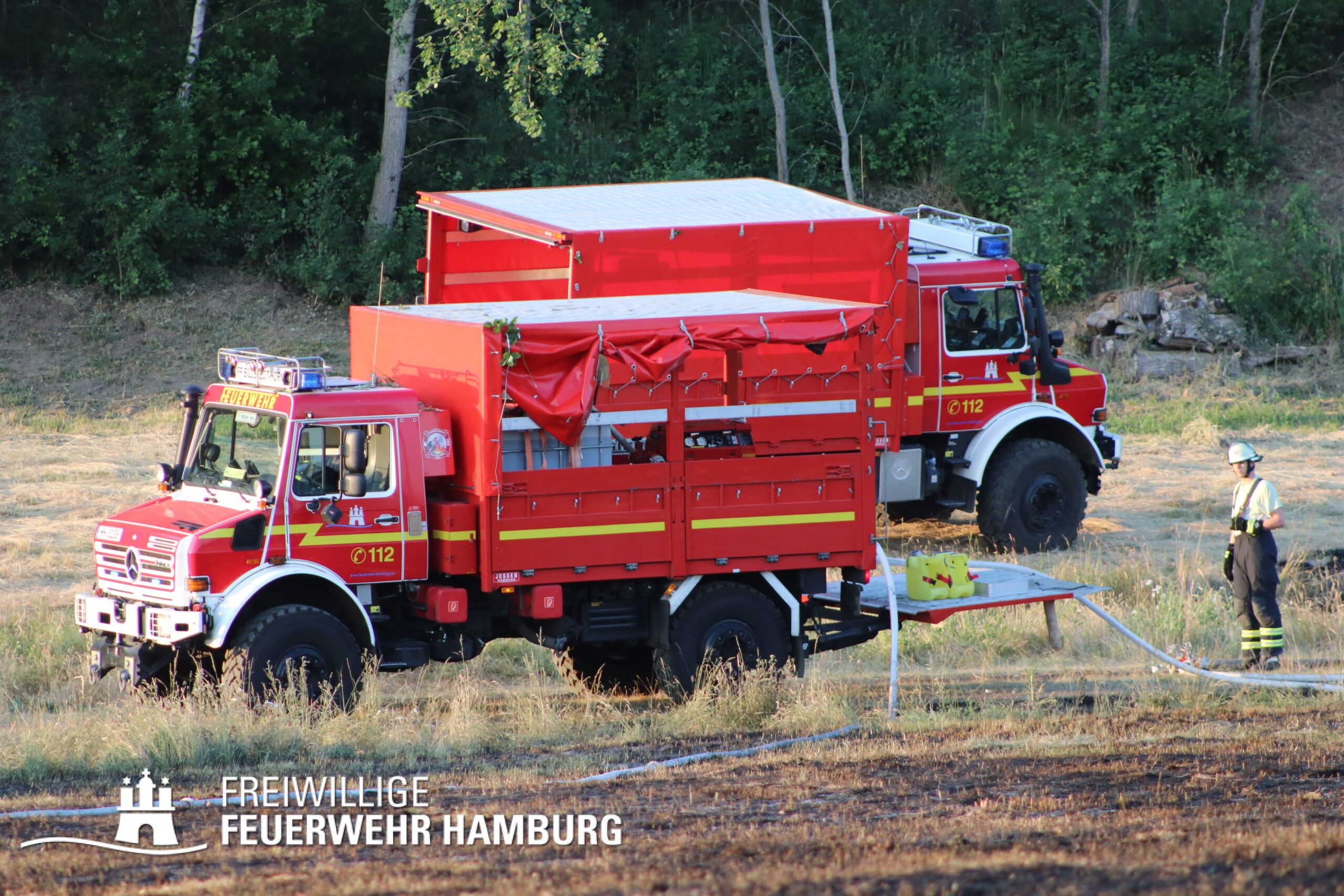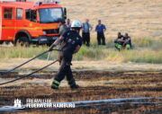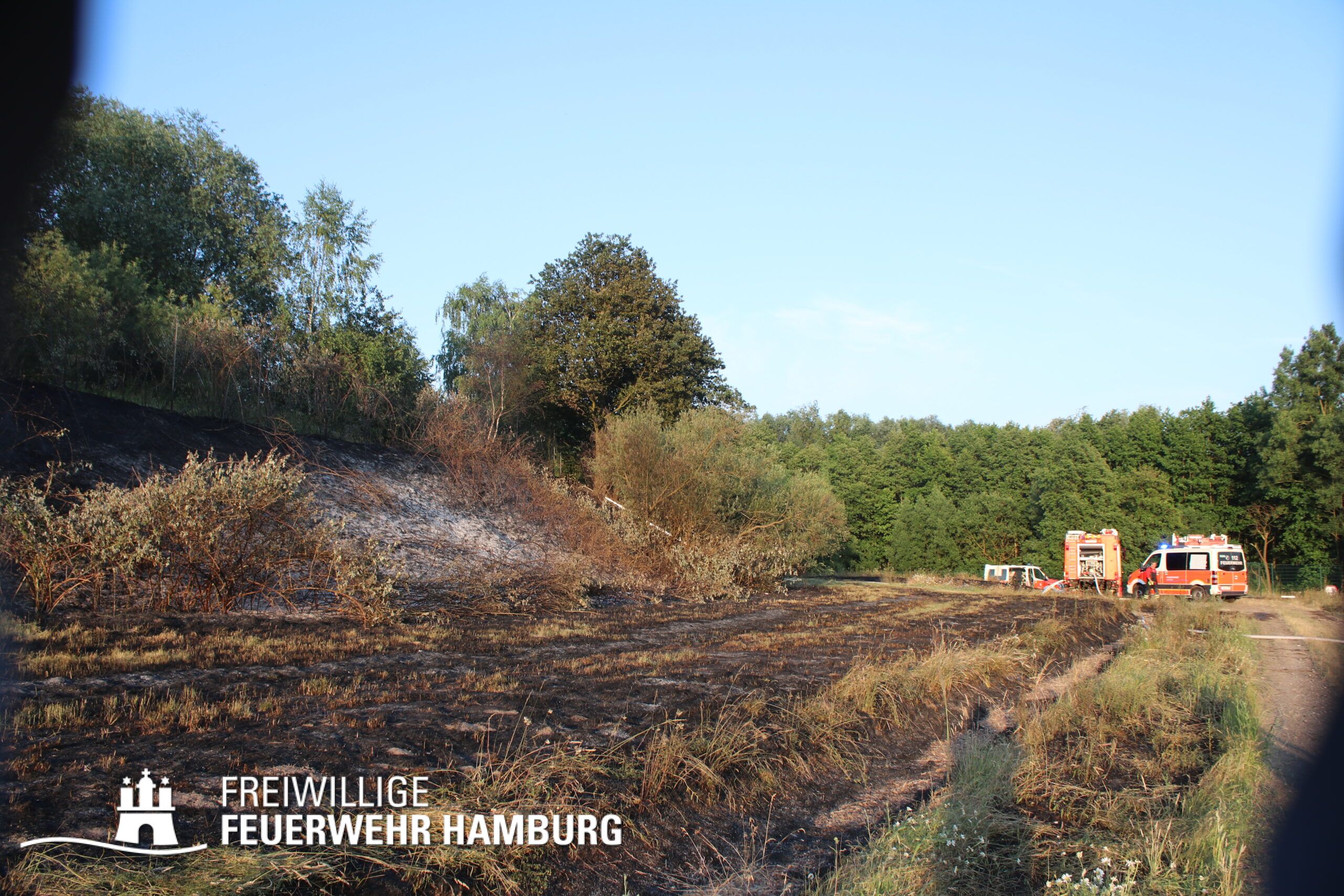 Die momentane Trockenheit und Hitze verlangt unseren Feuerwehren in Hamburg gerade viel ab. Immer wieder kommt es zu Bränden auf Wiesen oder in Wäldern. So auch heute gegen kurz vor 18 Uhr. Die Leitstelle alarmierte die zunächst die FF Kirchsteinbek gemeinsam mit der Löschgruppe der Berufsfeuerwehr Billstedt, ergänzt wurde das ganze durch den GW-R1 mit Waldbrandkomponente der FF Billstedt-Horn. Eine richtige Anfahrt gestaltete sich schwierig, so dass etwas länger die richtige Zuwegung gesucht werden musste. Vor Ort wurde ein Feuer auf einem Feld mit massiver Brandausbreitung vorgefunden. Sofort wurde ein Löschangriff vorgenommen und weitere Kräfte nachalarmiert. Das Feld brannte auf etwa 20 000qm und drohte sich weiter auszubreiten. Über einen Feldweg gab es einen Flammenüberschlag auf einen Wall sowie andere Teile eines Feldes.