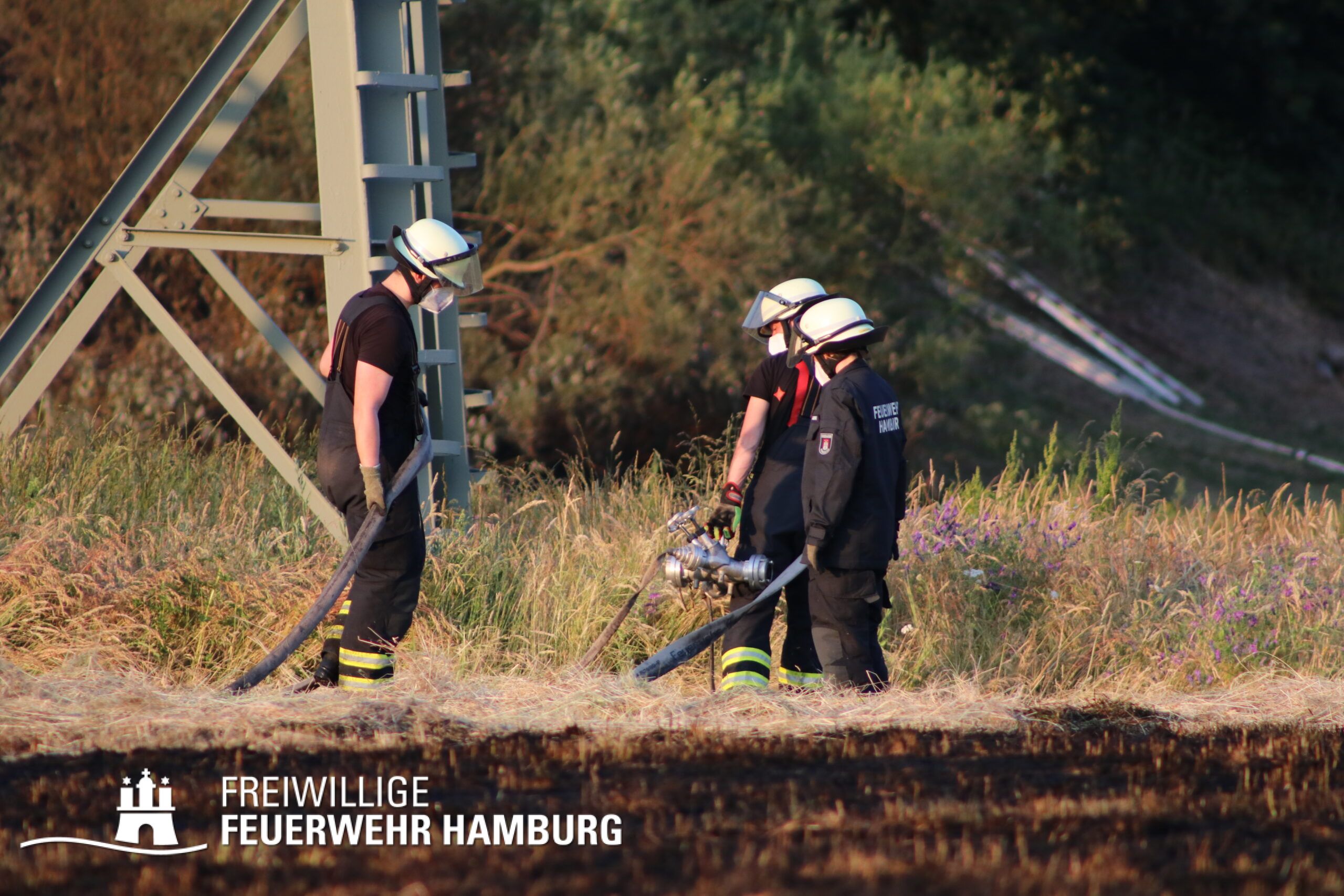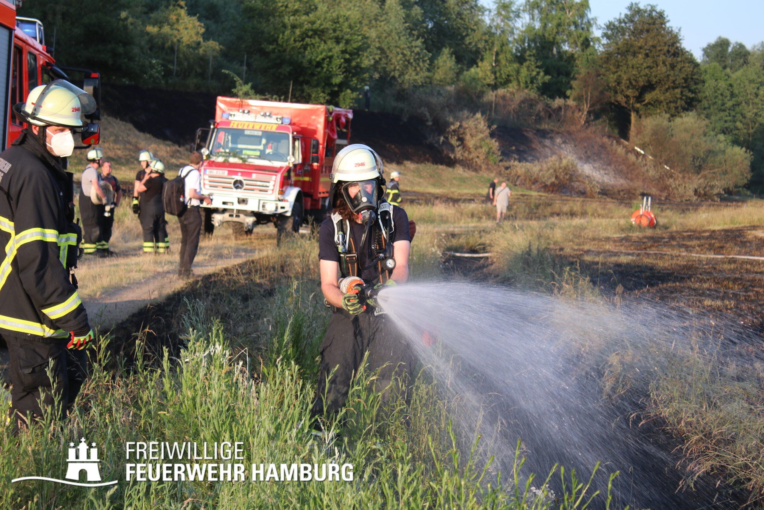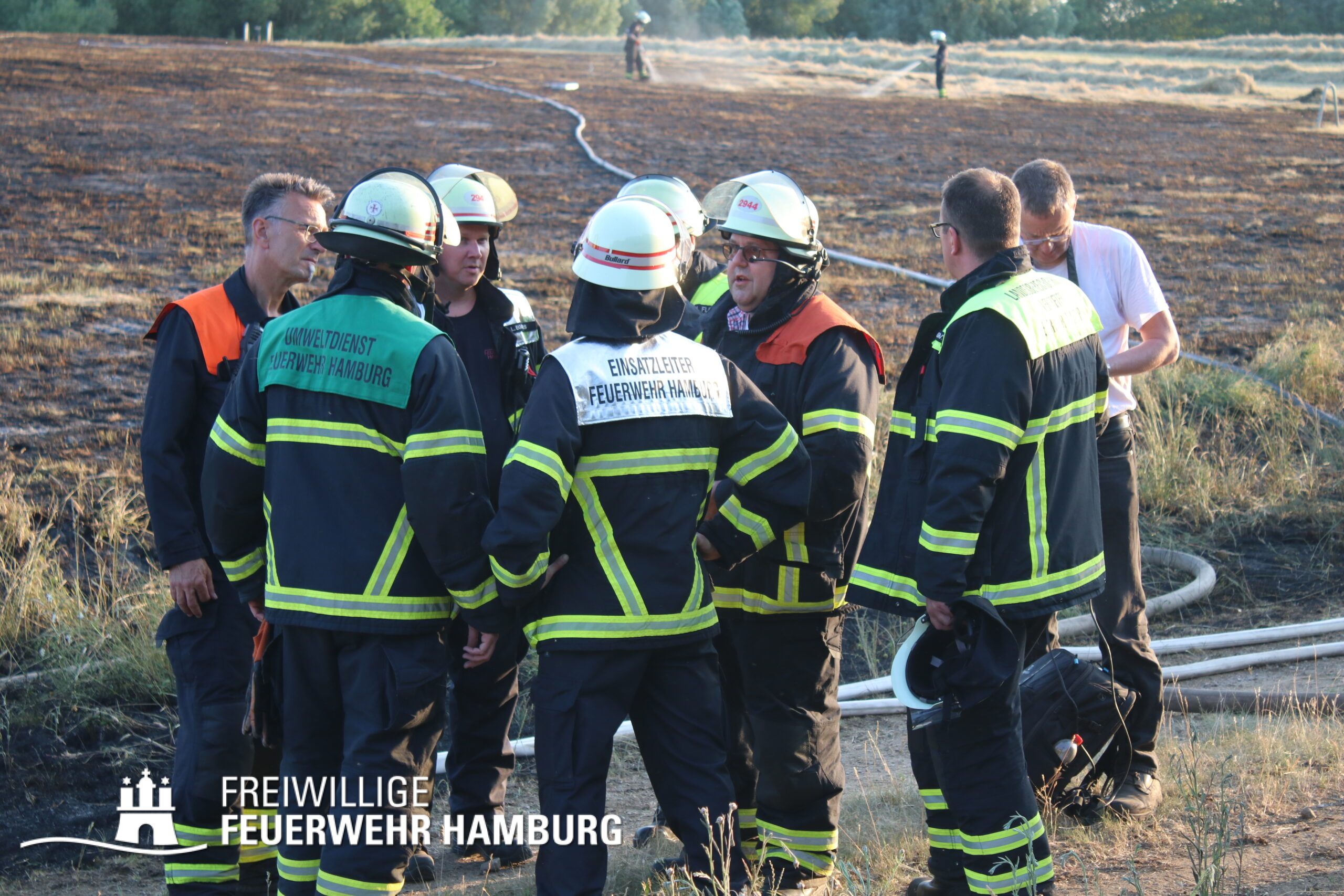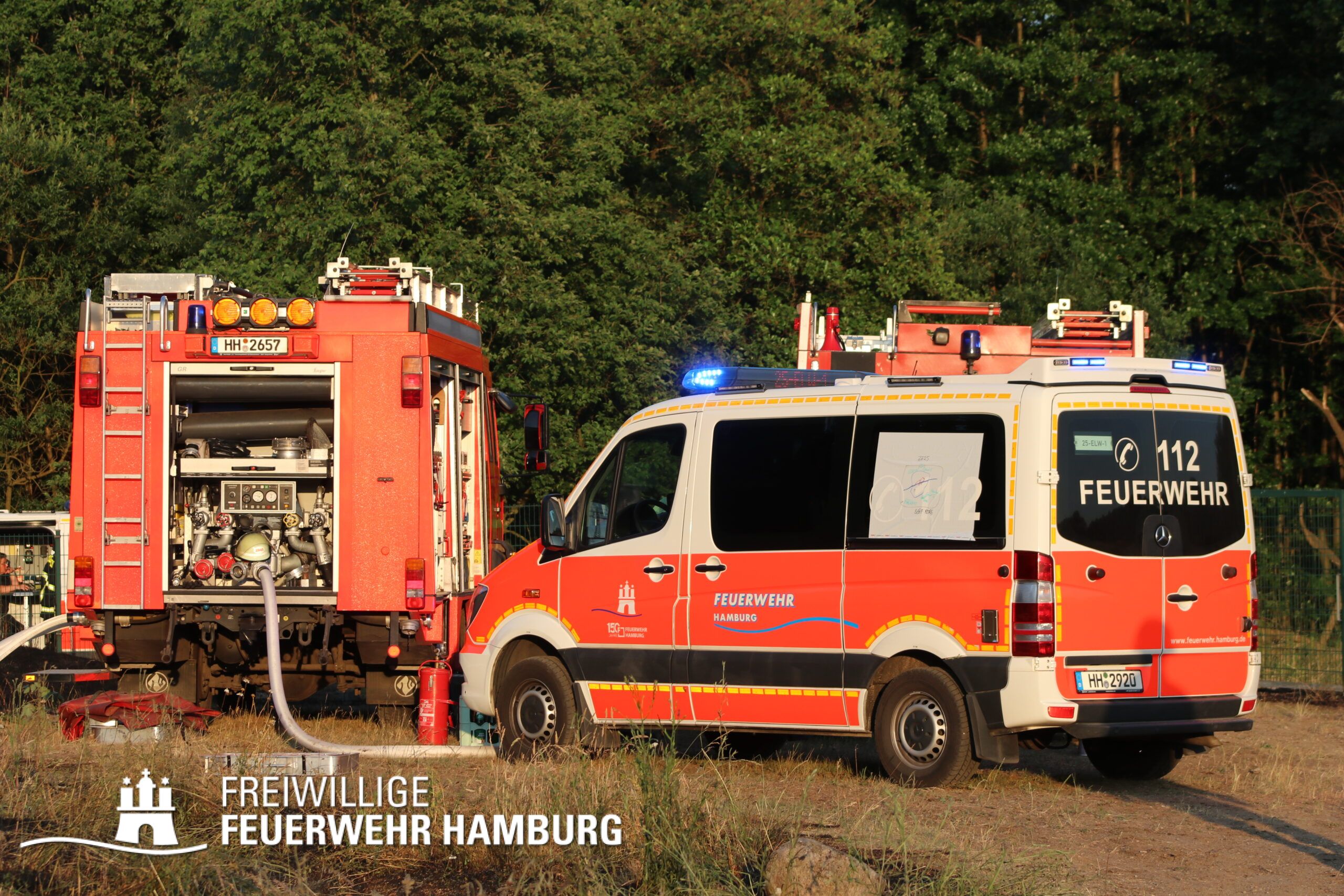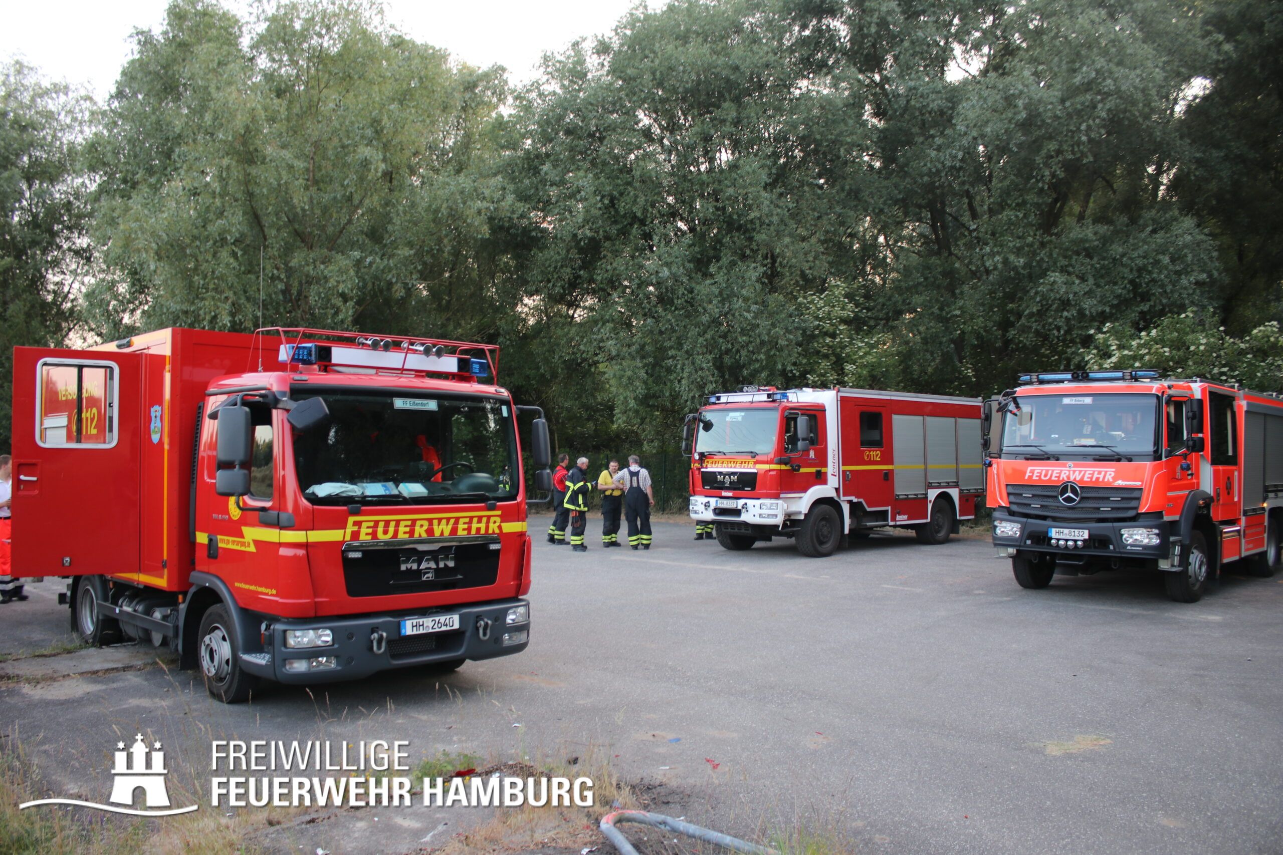 Schnell wurde die FF Billstedt-Horn mit beiden Löschfahrzeugen dem Einsatz zugeordnet, um einen umfangreichen Löschangriff zu starten. Ebenfalls wurde auch die FF Öjendorf sowie die FF Bille mit ihrem GW-FM alarmiert. Aufgrund der Größe des Feldes entschied sich die Einsatzleitung die FF Neudorf und FF Fuhlsbüttel ebenfalls mit ihren GW-R1 und der Waldbrandkomponente anzufordern.