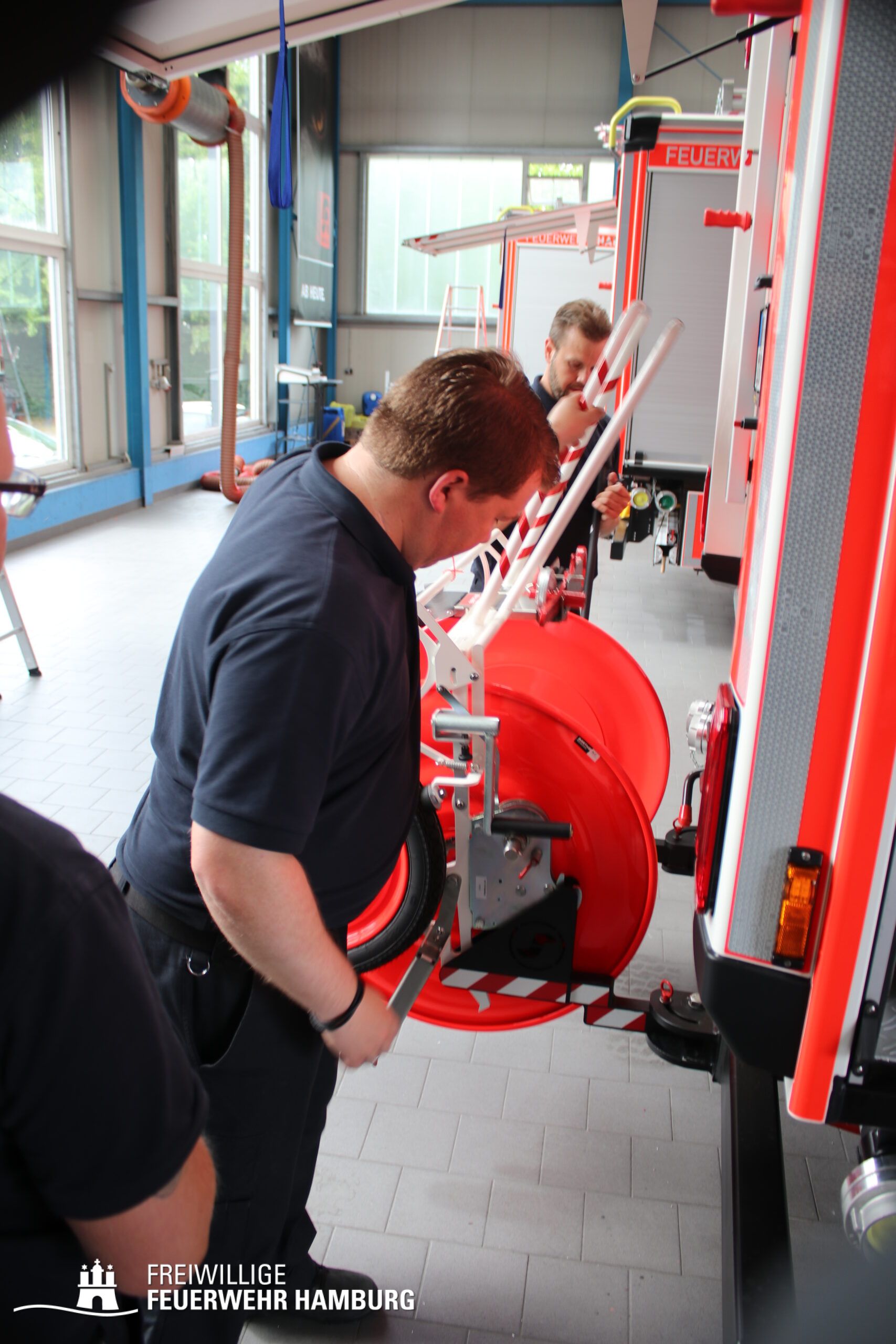 Der Mittwoch startete mit einem gemeinsamen Frühstück im Hotel. Danach ging es wieder zu den Fahrzeugen, an den die Firma Schlingmann die letzten Restarbeiten behoben hatte. Nach einer kurzen Kontrolle kamen schon die 3 Maschinisten der FF Kraul, FF Neudorf und FF Spadenland gemeinsam mit Sven Gerdau und Adrian Pajonk vom Stab FF03 aus Hamburg angereist. Nach einer kurzen Einweisung ging es für die Maschinisten schon an ihr Fahrzeug, um z. B. die Pumpeinrichtung zum Kippen des Führerhauses zu testen. Nach dieser schweißtreibenden Arbeit ging es zum Prüfen auf Vollständigkeit der Beladung. Gemeinsam mit je einem Kameraden aus dem Stab wurde mit Beladelisten jedes Fach des neuen HLF durchgeschaut und Geräte auf Funktion getestet. Da dieses Fahrzeug viele Neuerungen hat, durften neue Geräte auch gleich ausprobiert werden. Durch die umfangreiche Beladung dauerte dies schon bis in den späten Nachmittag. Abends wurden im Hotel beim Abendessen Fachgespräche ausgetauscht.