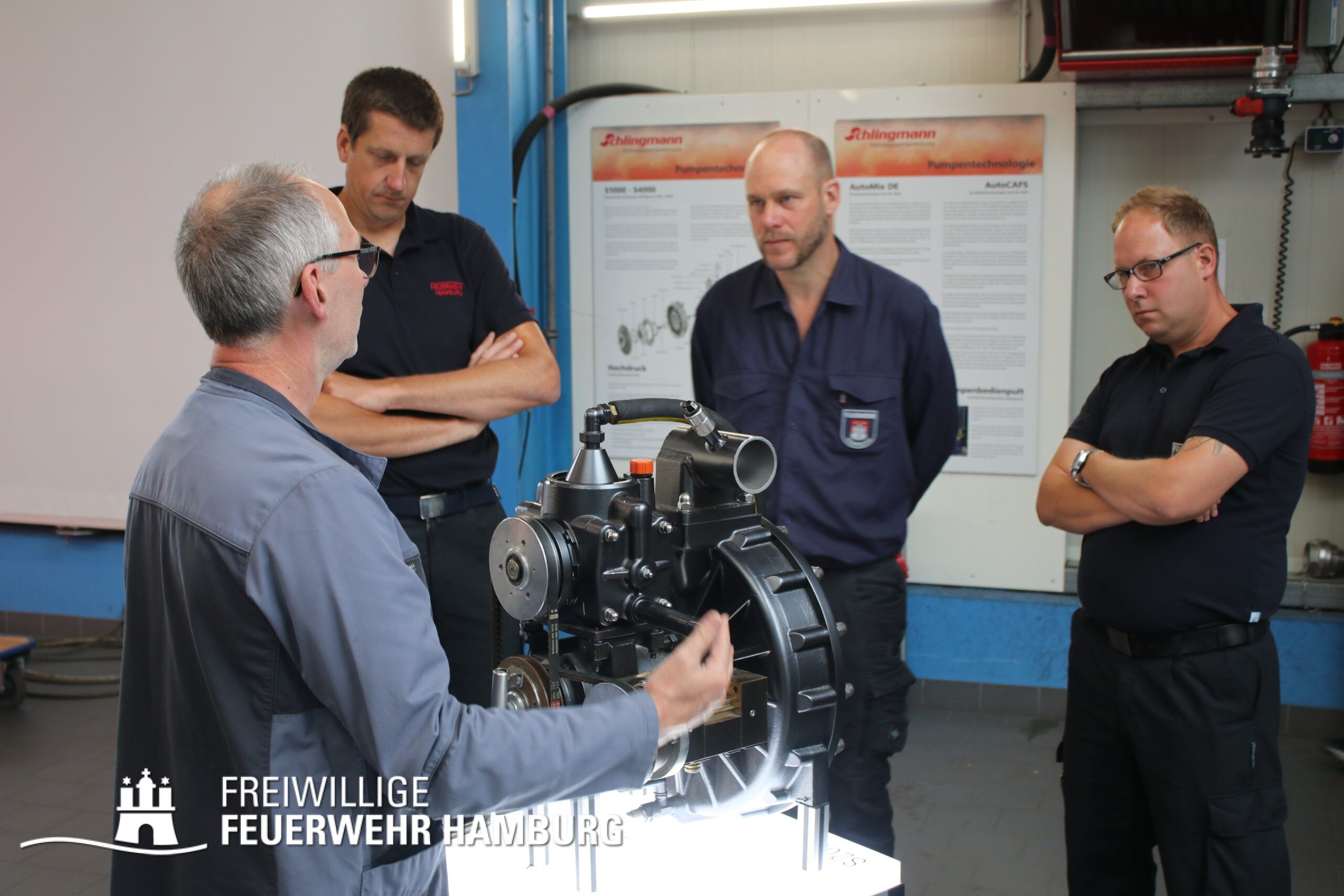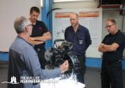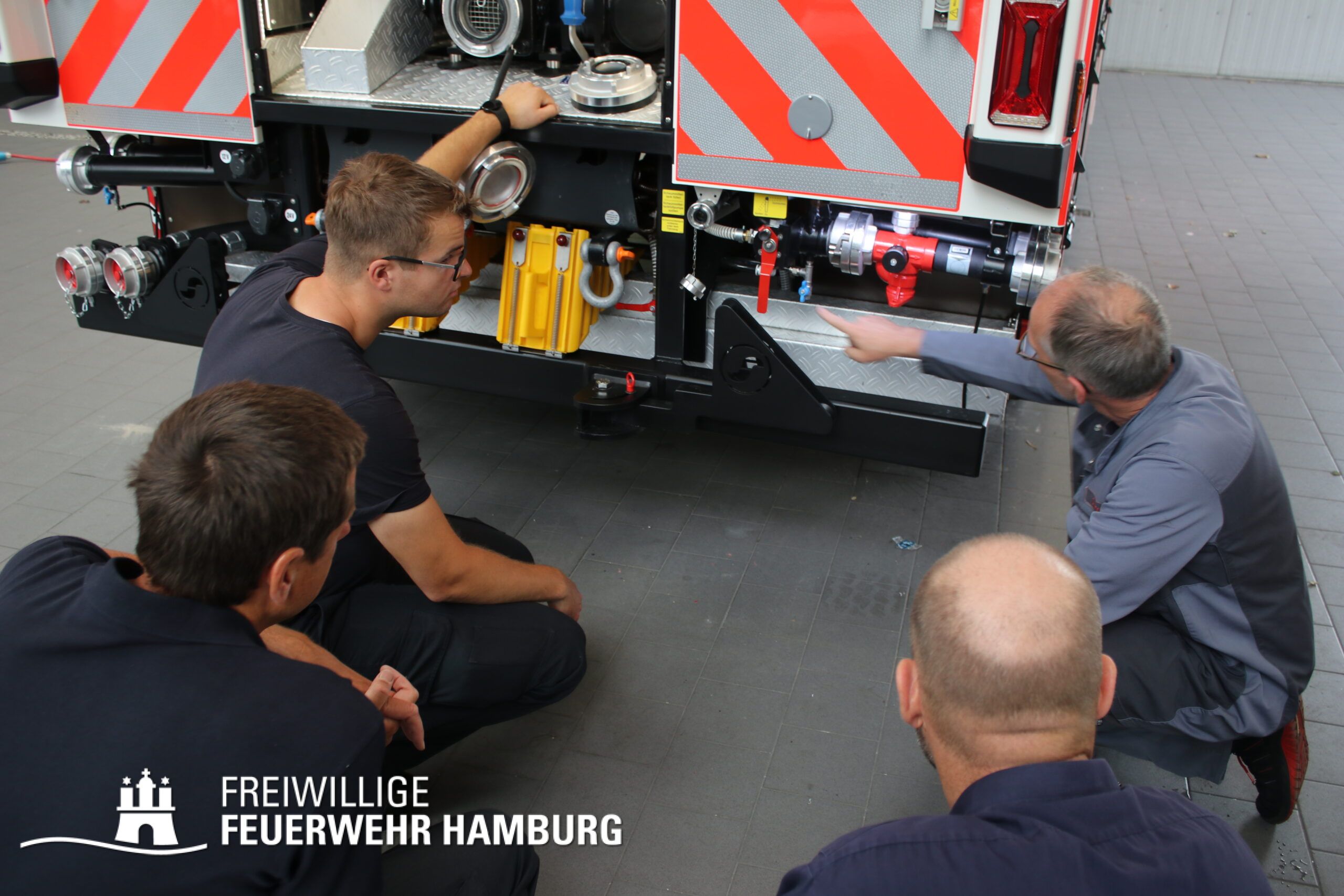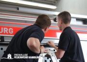 Der Donnerstag stand ganz im Zeichen der Einweisung. Hier ging es nach dem Frühstück los, sich mit der Technik der Kabine, sprich dem Mercedes Fahrgestell, auseinander zu setzen. Nach umfangreichen Erklärungen durch einen Mitarbeiter der Firma Schlingmann bekamen alle Maschinisten ihre Einweisung an die Pumpe des HLF20. Auch hier gibt es einige Neuerungen zu den alten Pumpen. Z.b. verfügt das Fahrzeug über einen fest verbauten 120L Schaumtank. Die Leitern können über eine Leiterentnahmehilfe vom Dach geholt werden, ohne das Dach zu betreten. Da die Maschinisten aus den Wehren ihre Wehr auf das Fahrzeug schulen müssen, ist diese Einweisung sehr wichtig. Gegen Mittag ging es dann aufgeteilt auf die Fahrzeuge in Richtung Hamburg. Hier wurden 2 Fahrzeuge bei Mercedes-Benz und 1 Fahrzeug beim Technikzentrum der Feuerwehr Hamburg abgestellt, um noch ein paar restliche kleine Arbeiten durchzuführen. Sobald die Fahrzeuge dort fertig sich, erfolgt am Technikzentrum eine Einweisung für alle Maschinisten der Wehren. Diese wird durch die Kameraden des Stabes FF03 begleitet und durchgeführt.