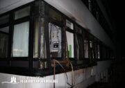 Brennender Müllcontainer Unterstand an einem Hotel.