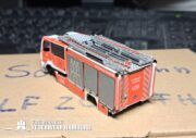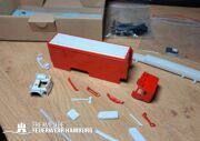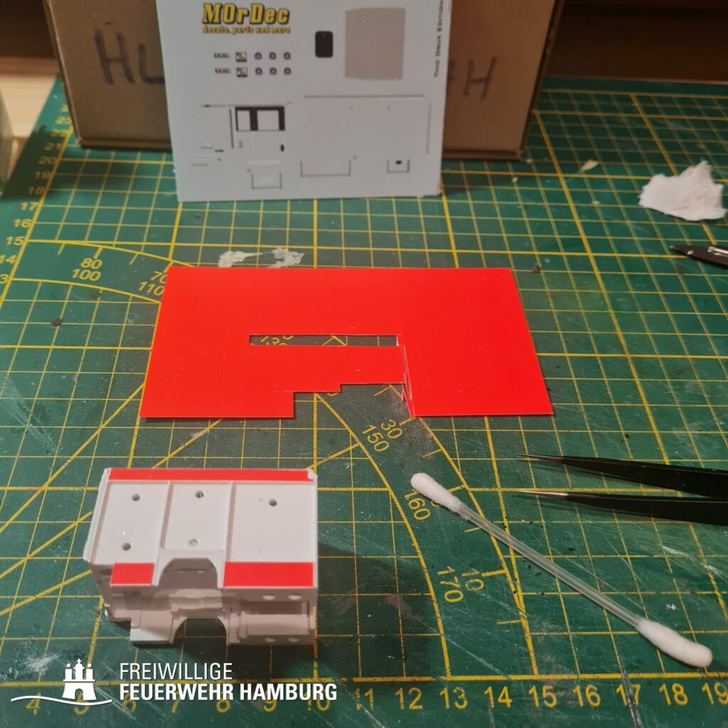 Nach etwas Planung und Suche nach Herstellern für die verschiedensten Teile konnte es dann endlich mit dem Bau losgehen. Nach den Lackierarbeiten an den Grundmodellen wurde die Beklebung umgesetzt. Die Modellfirma MOrDec – decals, parts and more übernahm als Sponsor die Herstellung der Beklebung der Modellfahrzeuge. Hierfür musste vorweg erst eine Genehmigung durch die Feuerwehr Hamburg erfolgen. Diese Aufkleber müssen einzeln in Wasser eingeweicht werden und können dann mittels Q-Tip und Weichmachern auf die Modelle aufgebracht werden. Auch bei dem ELW2 wurde dies so umgesetzt und später mit Klarlack versiegelt. Beide Modelle wurden durch Bauteile aus dem 3D Druck durch die Firma B&K Modellbau erstellt und super umgesetzt. Da das Miniatur-Wunderland die komplette Verkabelung übernahm, konnten die Modelle nicht komplett zusammengesetzt werden. Im Rohbau wurden beide Modelle nach etwa 30 Stunden Arbeitszeit an die richtigen Profis übergeben.
