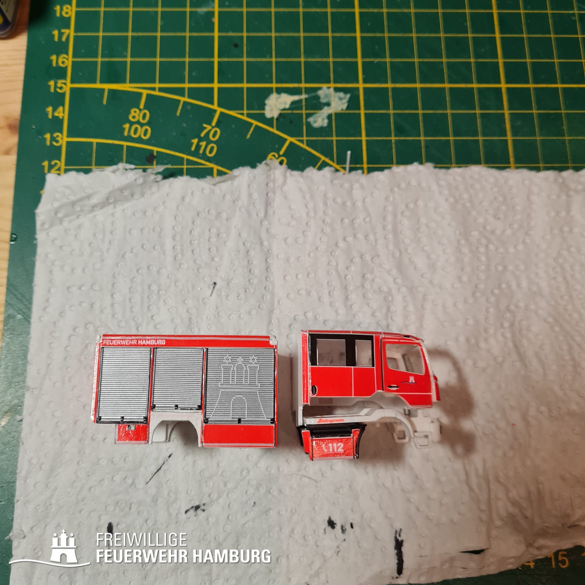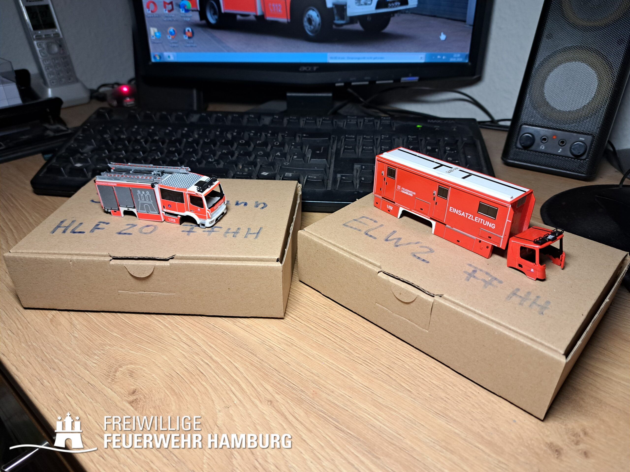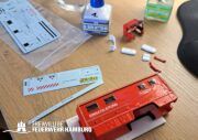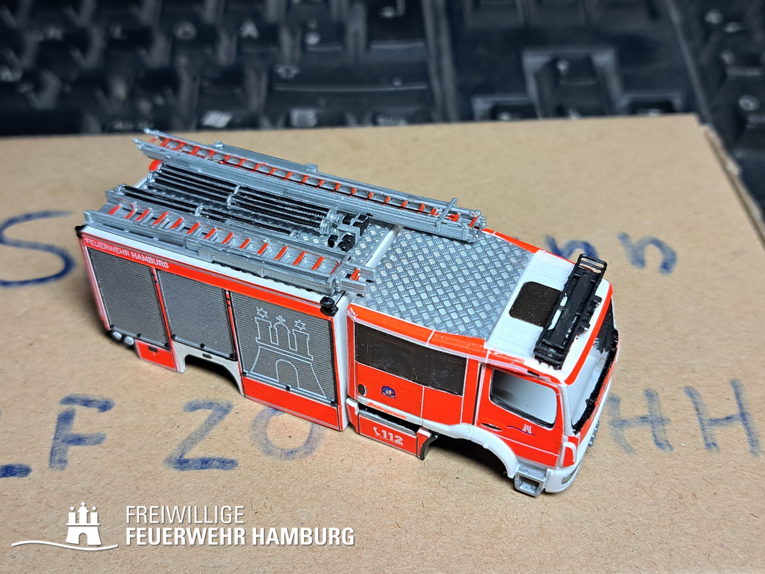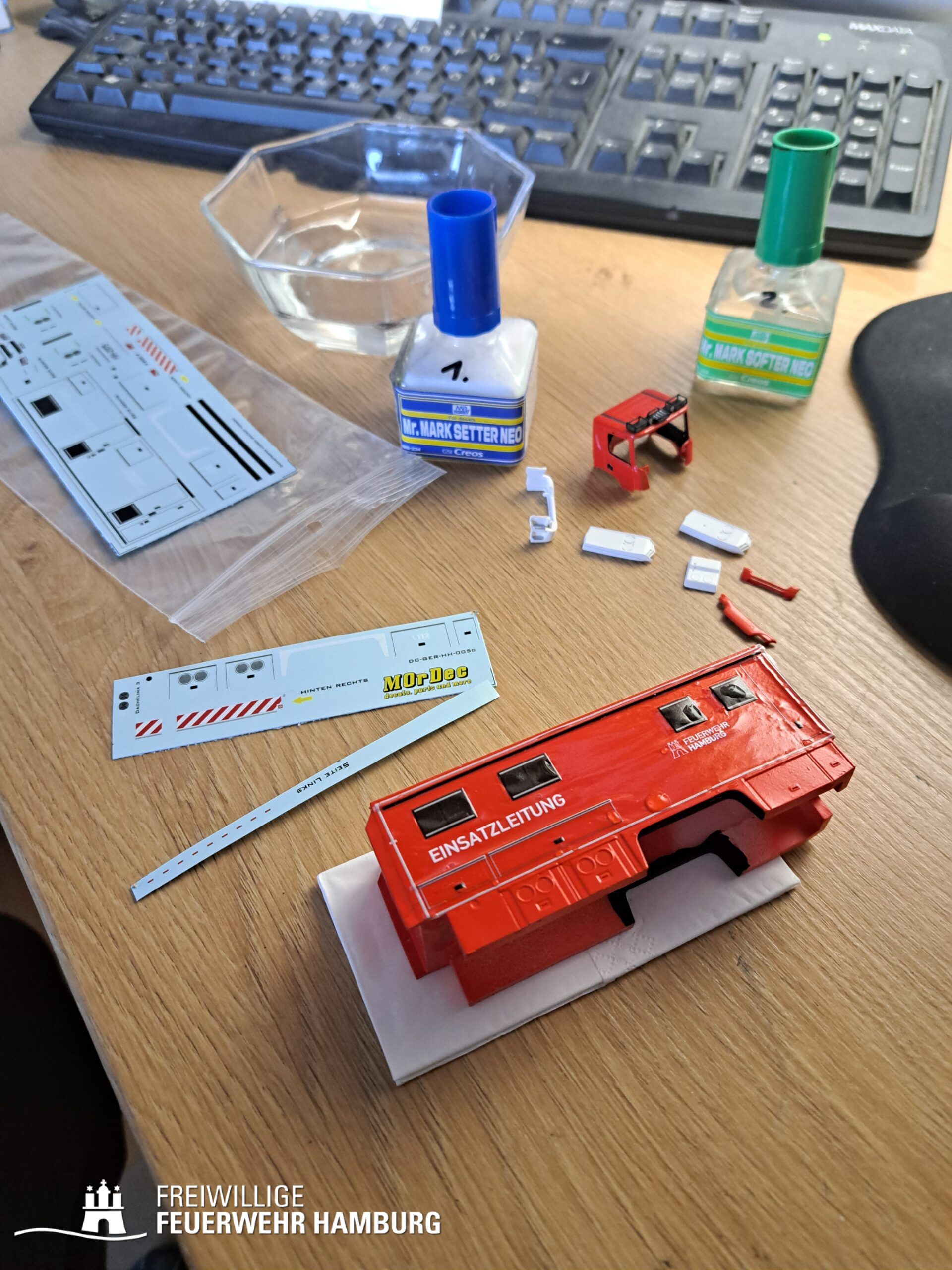 Nach etwas Planung und Suche nach Herstellern für die verschiedensten Teile konnte es dann endlich mit dem Bau losgehen. Nach den Lackierarbeiten an den Grundmodellen wurde die Beklebung umgesetzt. Die Modellfirma MOrDec – decals, parts and more übernahm als Sponsor die Herstellung der Beklebung der Modellfahrzeuge. Hierfür musste vorweg erst eine Genehmigung durch die Feuerwehr Hamburg erfolgen. Diese Aufkleber müssen einzeln in Wasser eingeweicht werden und können dann mittels Q-Tip und Weichmachern auf die Modelle aufgebracht werden. Auch bei dem ELW2 wurde dies so umgesetzt und später mit Klarlack versiegelt. Beide Modelle wurden durch Bauteile aus dem 3D Druck durch die Firma B&K Modellbau erstellt und super umgesetzt. Da das Miniatur-Wunderland die komplette Verkabelung übernahm, konnten die Modelle nicht komplett zusammengesetzt werden. Im Rohbau wurden beide Modelle nach etwa 30 Stunden Arbeitszeit an die richtigen Profis übergeben.