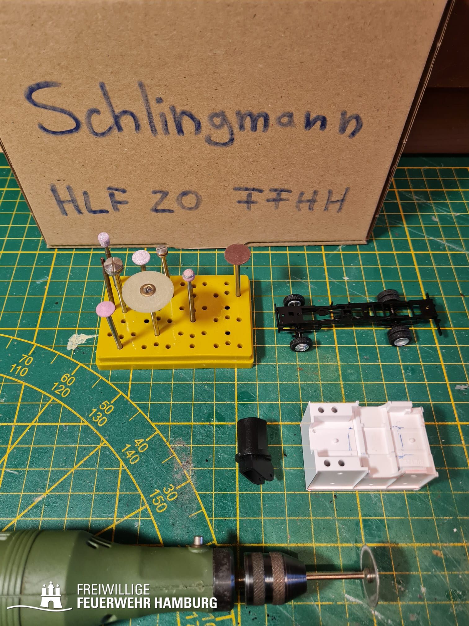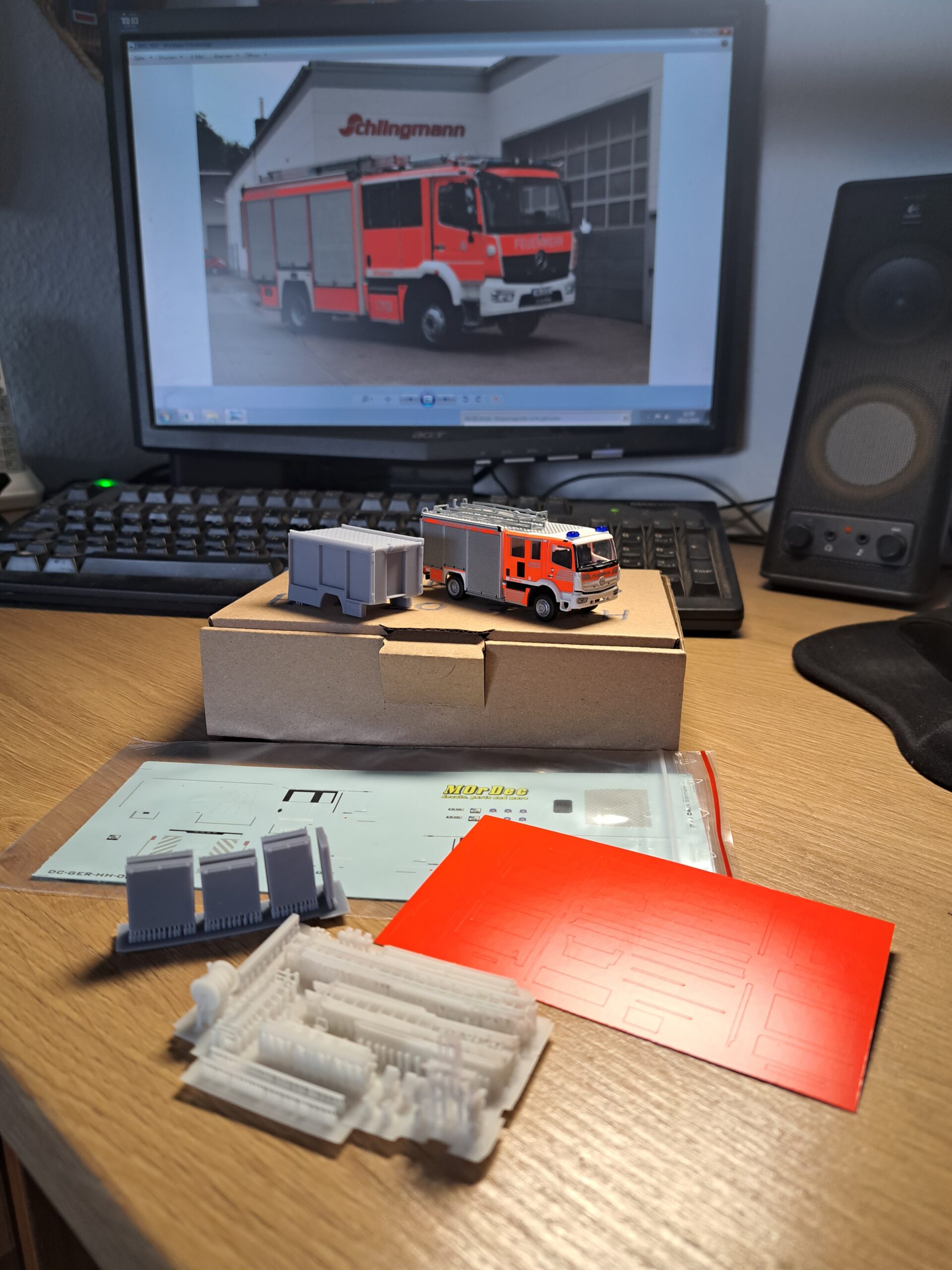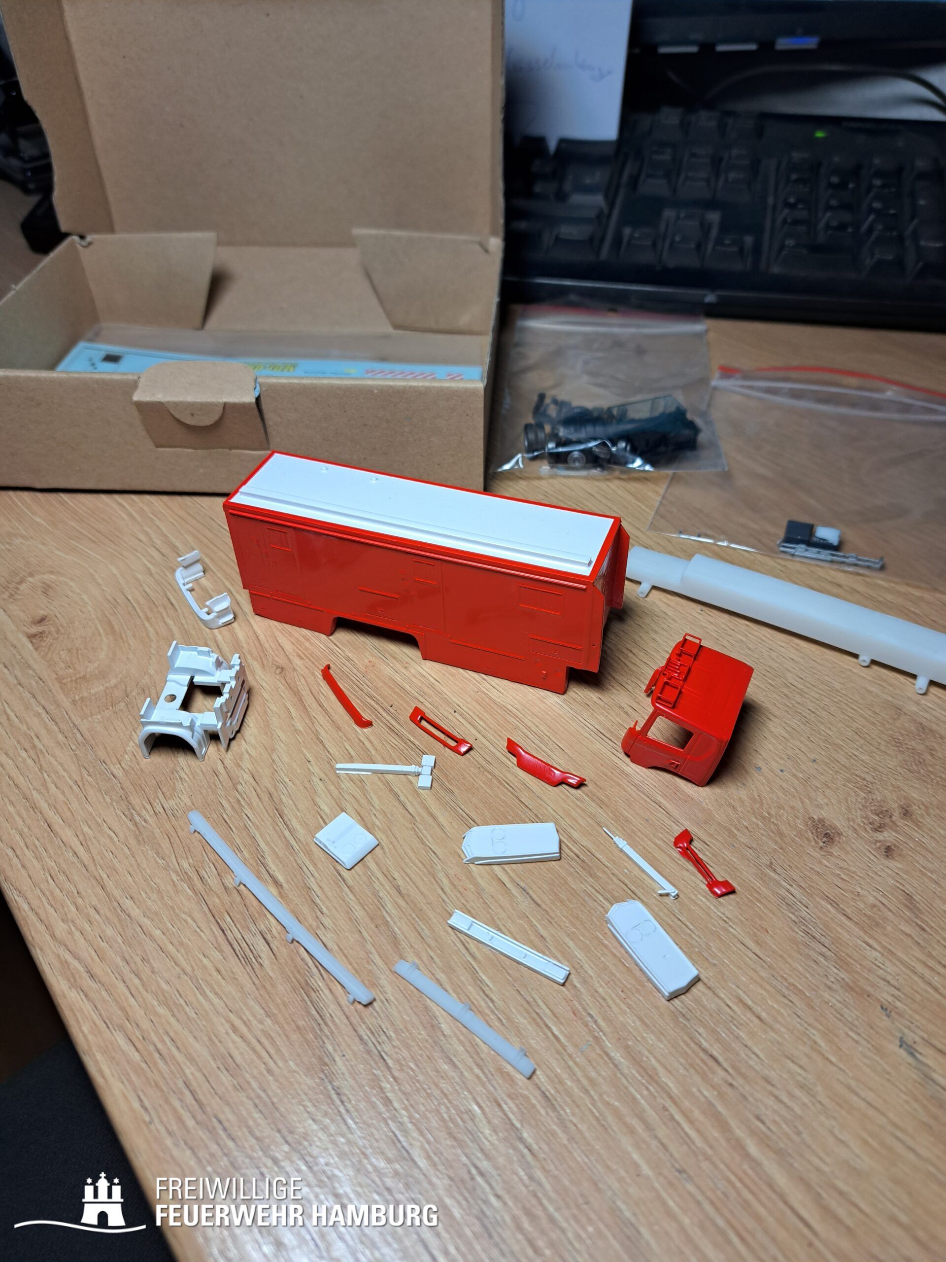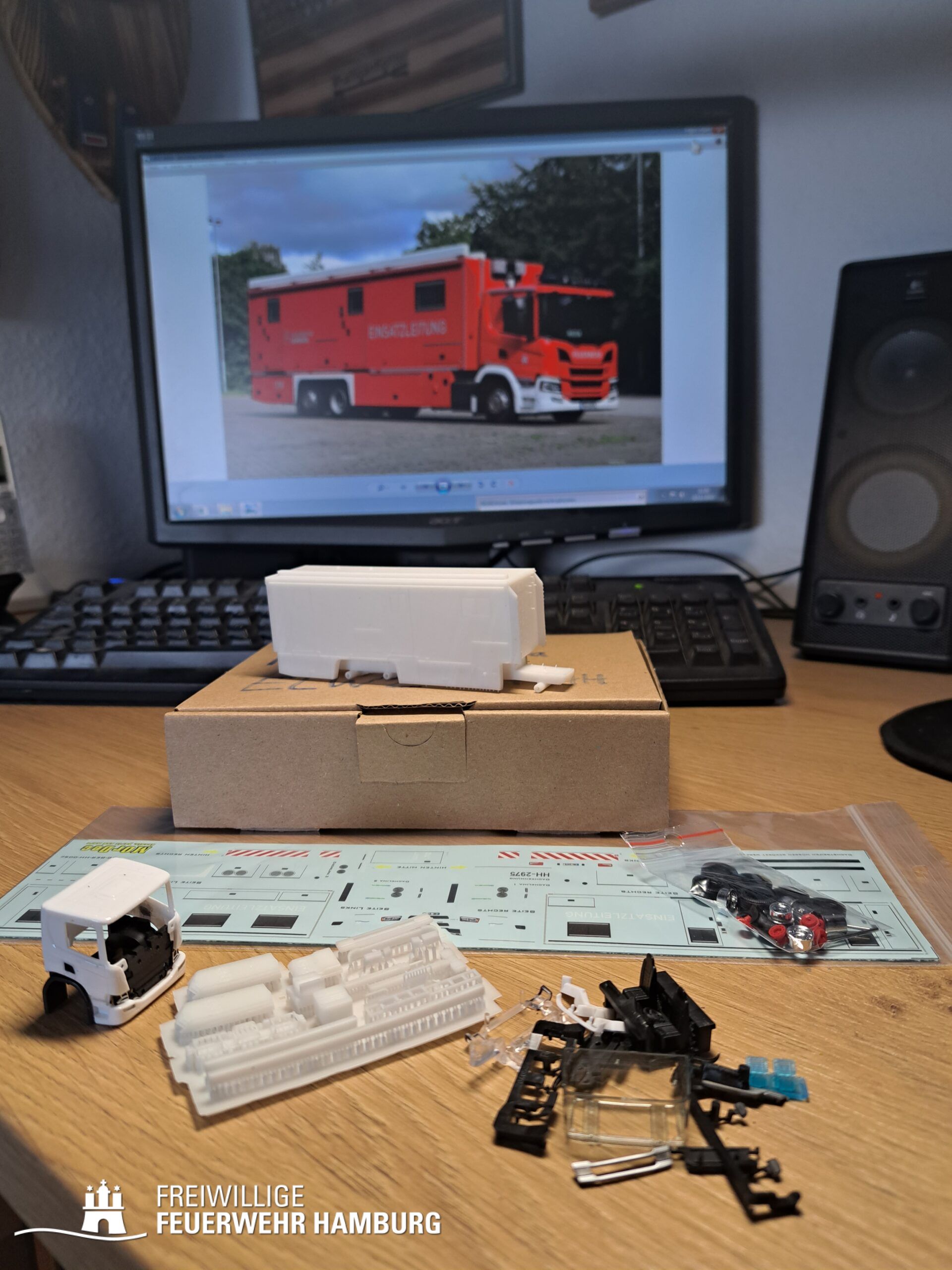 Nach etwas Planung und Suche nach Herstellern für die verschiedensten Teile konnte es dann endlich mit dem Bau losgehen. Nach den Lackierarbeiten an den Grundmodellen wurde die Beklebung umgesetzt. Die Modellfirma MOrDec – decals, parts and more übernahm als Sponsor die Herstellung der Beklebung der Modellfahrzeuge. Hierfür musste vorweg erst eine Genehmigung durch die Feuerwehr Hamburg erfolgen. Diese Aufkleber müssen einzeln in Wasser eingeweicht werden und können dann mittels Q-Tip und Weichmachern auf die Modelle aufgebracht werden. Auch bei dem ELW2 wurde dies so umgesetzt und später mit Klarlack versiegelt. Beide Modelle wurden durch Bauteile aus dem 3D Druck durch die Firma B&K Modellbau erstellt und super umgesetzt. Da das Miniatur-Wunderland die komplette Verkabelung übernahm, konnten die Modelle nicht komplett zusammengesetzt werden. Im Rohbau wurden beide Modelle nach etwa 30 Stunden Arbeitszeit an die richtigen Profis übergeben.