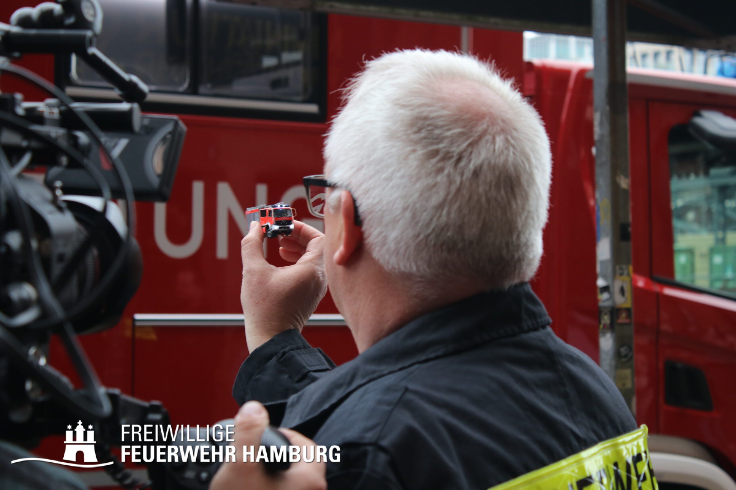 Über das Wunderland begleitete ein Fernsehteam von Spiegel TV die Übergabe und führte Interviews mit den Erbauern. Am 20.03.2024 gegen 16 Uhr war es dann so weit. Unser Landesbereichsführer Harald Burghart empfing mit dem Team vom Miniatur Wunderland das neue HLF20 und den ELW2. Lautes Presslufthorn ertönte vor dem Wunderland und das neue HLF 20 der FF Rissen sowie der ELW2 der FF Eimsbüttel fuhren vor. Gemeinsam wurden beide Originale und Modelle bestaunt und verglichen. Danach war es endlich so weit: beide Fahrzeuge konnten ihre Jungfernfahrt in Knuffingen starten, und kurz darauf auch schon den ersten gemeinsamen Dachstuhlbrand bekämpften.