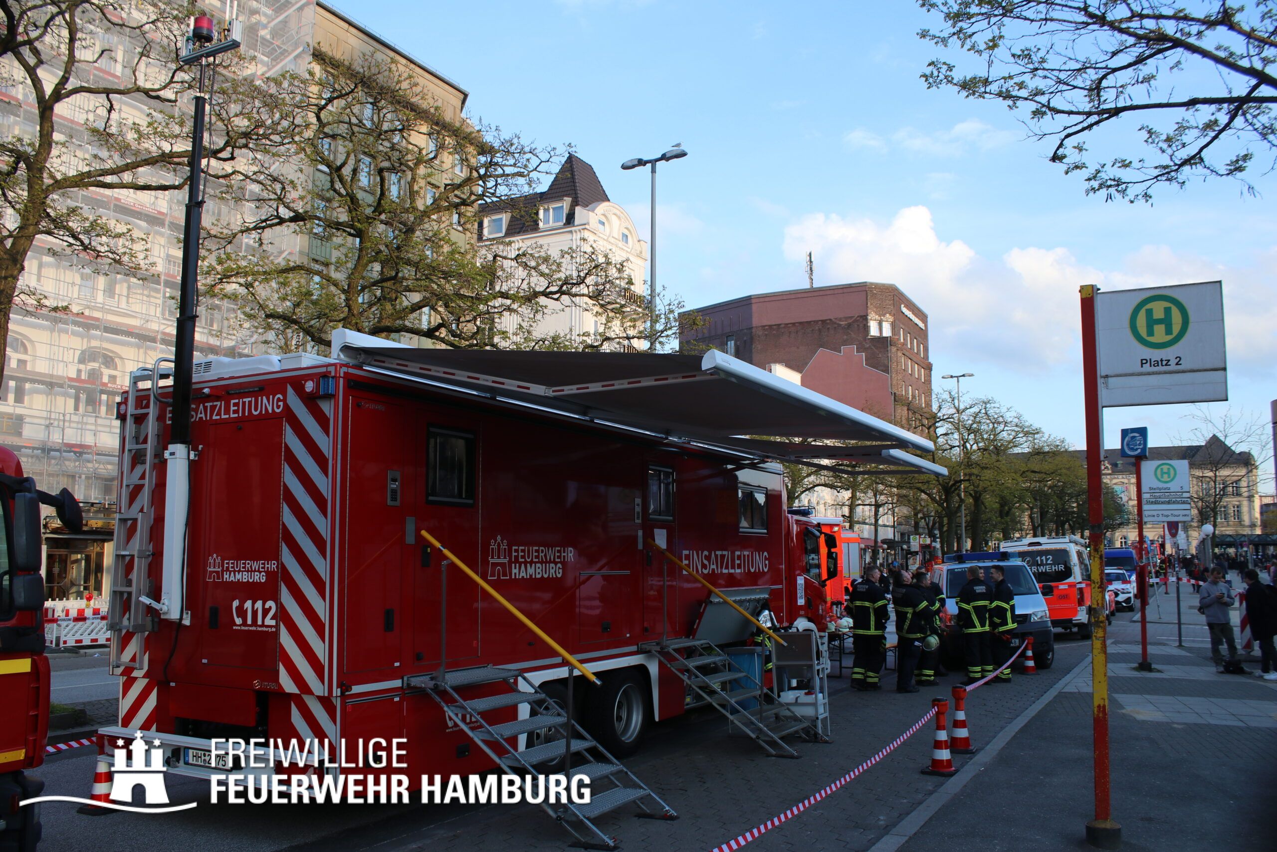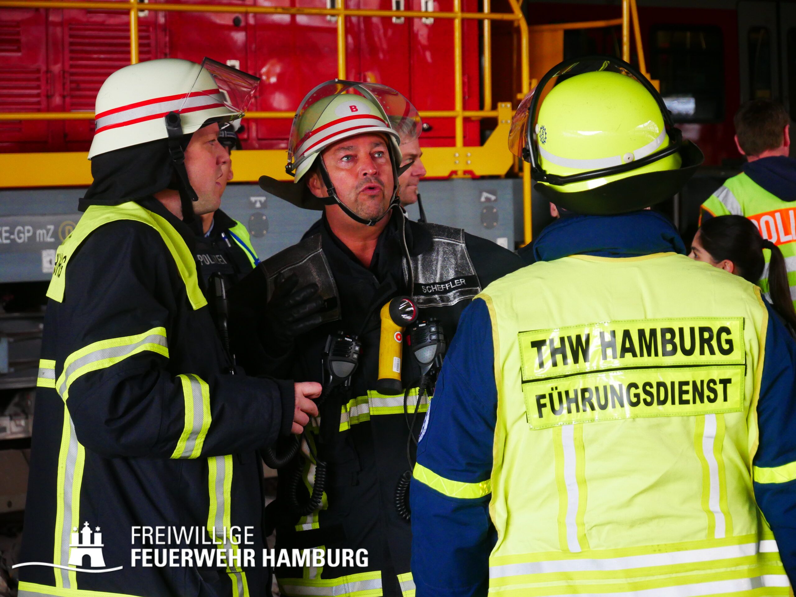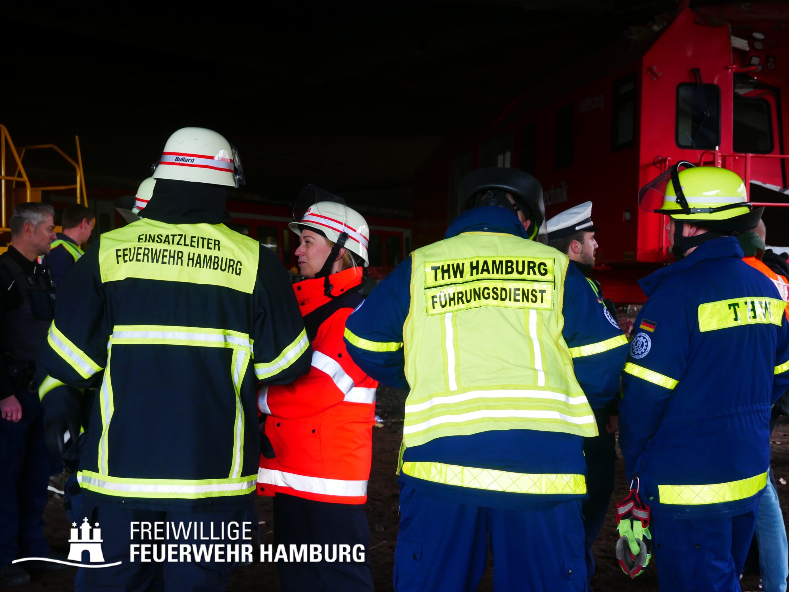 Da am Anfang auch mit austretenden Gefahrstoffen zu rechnen war, wurde ein CBRN-Zug alarmiert, dieser wurde durch den Bereichsführer Eimsbüttel geführt und bestand weiterhin aus dem Dekon-P und dem LF 16 KatS der FF Pöseldorf sowie dem CBRN-Erkkw und dem HLF20 der FF Bergedorf. Dieser Zug war vor Ort nicht erforderlich und konnte daher auf der Anfahrt abbrechen. Um die Einsatzleitung vor Ort zu organisieren wurde der ELW2 der FF Eimsbüttel sowie der GW-FM und der FüLa der FF Wandsbek-Marienthal alarmiert. Die FF Wandsbek-Marienthal ließ außerdem über ihre Drohne Aufnahmen der gesamten Einsatzstelle machen. Der Bereichsführer Wandsbek war vor Ort als Abschnittsleiter für die technische Einsatzleitung eingesetzt. Die FF Ottensen-Bahrenfeld versorgte alle Einsatzkräfte vor Ort mit Snacks und Getränken aus ihrem GW-VSG.