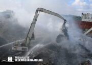 Über betriebseigene Bagger mit Greifarmen konnten Mitarbeiter in enger Zusammenarbeit mit der Feuerwehr die Schrotthaufen auseinander ziehen, damit diese gezielt abgelöscht werden konnten.