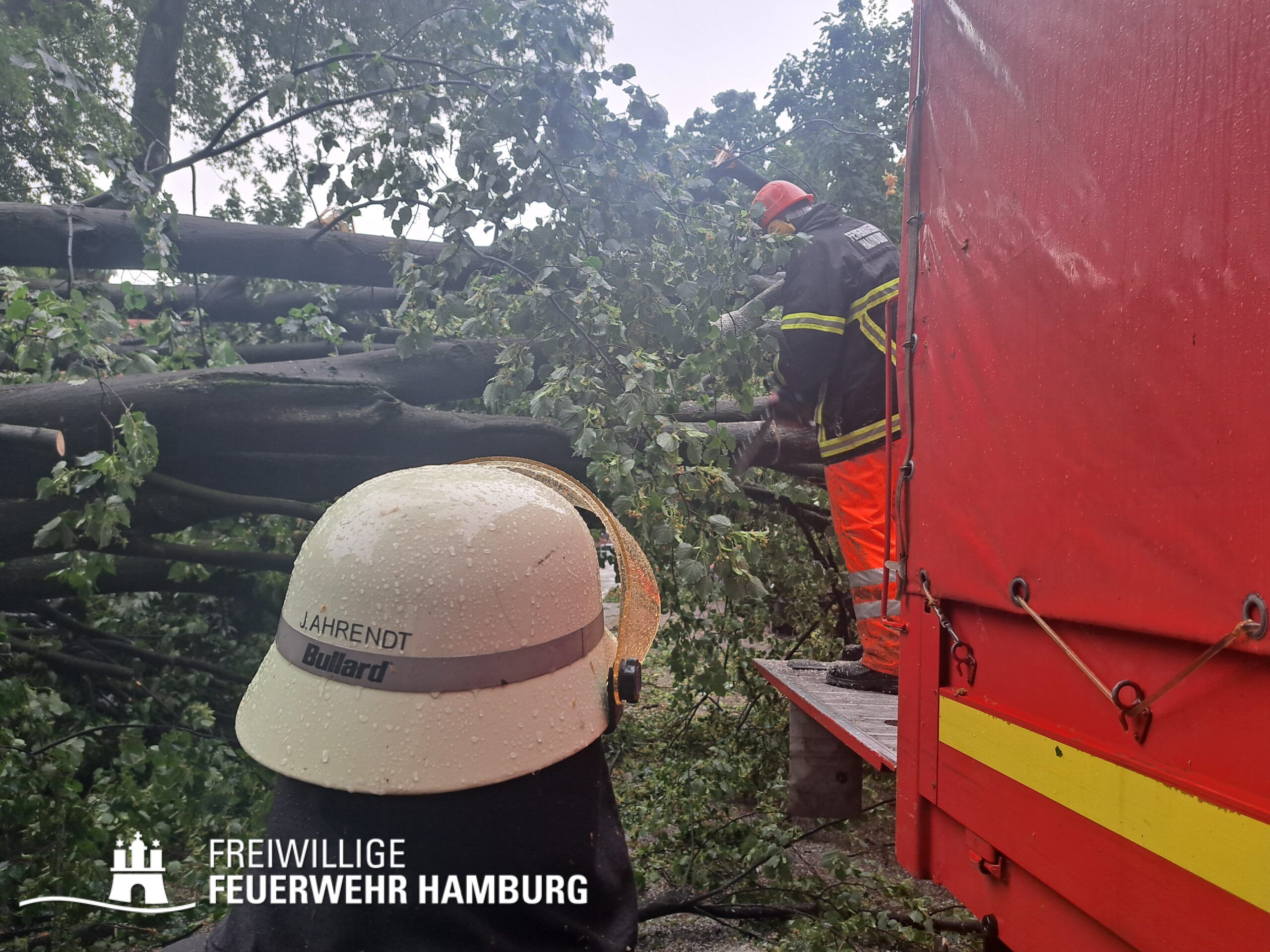 Besonders bemerkenswert war hier das flächendeckende Engagement der ehrenamtlichen Mitglieder: Aufgrund der großen Anzahl anfallender Einsätze, verteilt über fast das gesamte Stadtgebiet, wurde alle 85 Freiwilligen Feuerwehren in Hamburg (die 86. Freiwillige Feuerwehr Neuwerk liegt außerhalb des Kernstadtgebiets) im eigenen Feuerwehrhaus in Bereitschaft versetzt. Trotz aller Widrigkeiten im Hinblick auf das Wetter, konnten alle Freiwilligen Feuerwehren innerhalb von 25 Minuten ihre Einsatzbereitschaft melden. Zu diesem Zeitpunkt waren allerdings auch schon mehr als 35 Wehren im Einsatz. Weitere 30 Minuten später, waren alle zur Verfügung stehenden Einsatzfahrzeuge der 85 Freiwilligen Feuerwehren besetzt und damit sage und schreibe 1530 Mitglieder aktiviert. In den Einsatz ausgerückt sind über 80 Freiwillige Feuerwehren Hamburgs. So wurden im Zeitraum von 16:54Uhr und 22:15Uhr Uhr im sogenannten Betriebszustand Ausnahme, insgesamt über 800 wetterbedingte Einsätze, zum größten Teil durch Kameradinnen und Kameraden der Freiwilligen Feuerwehr Hamburg abgearbeitet.
