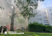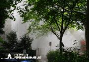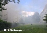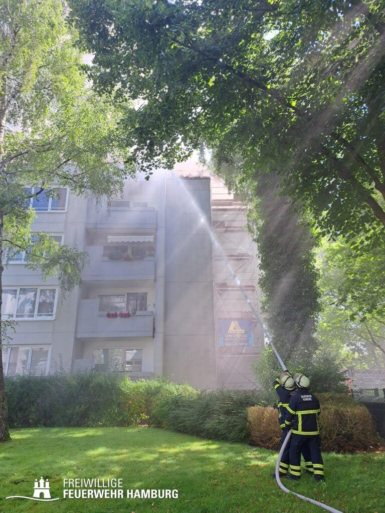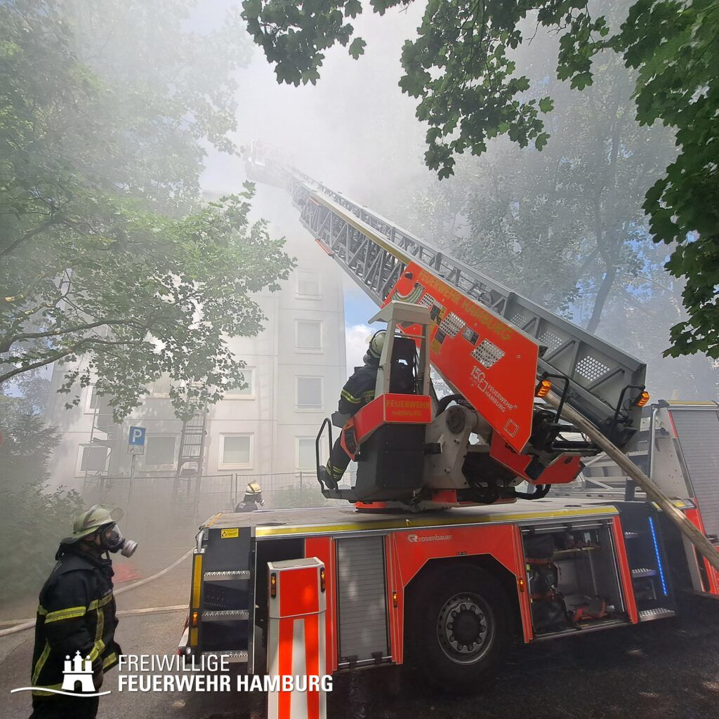 Am Montagmittag gegen 11 Uhr kam es zum Brand eines Teils der Dachfläche eines 4-geschossigen Mehrfamilienhauses in Hummelsbüttel. Die Einsatzkräfte vor Ort erhöhten zügig auf das Alarmstichwort FEU2, was später auf FEU3MANV5 (Feuer, 3 Löschzüge, Massenanfall von Verletzten, mind. 5 betroffene Personen) erhöht wurde. Das Feuer hatte sich im Zwischenraum von Dachfläche und oberster Geschoßdecke festgesetzt.