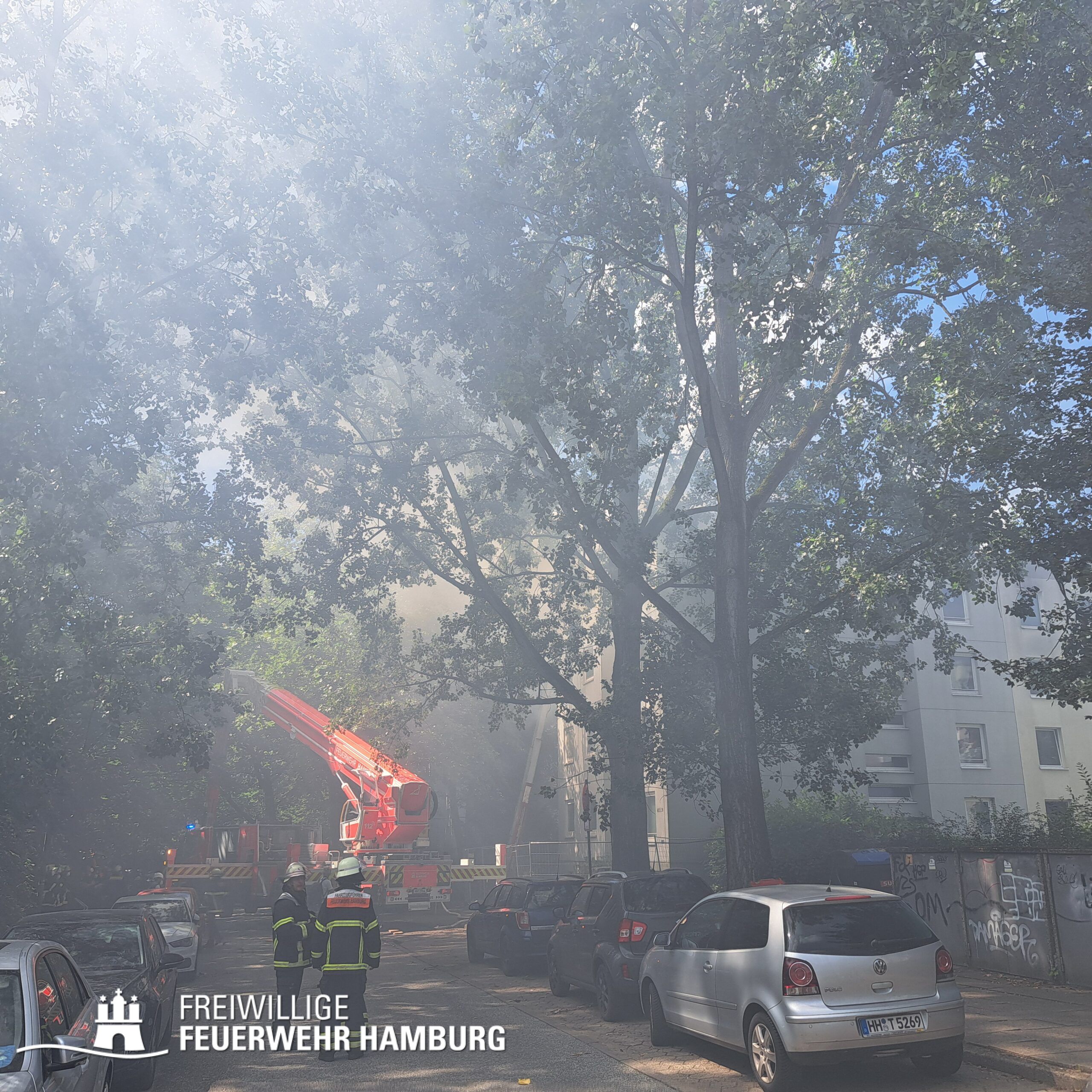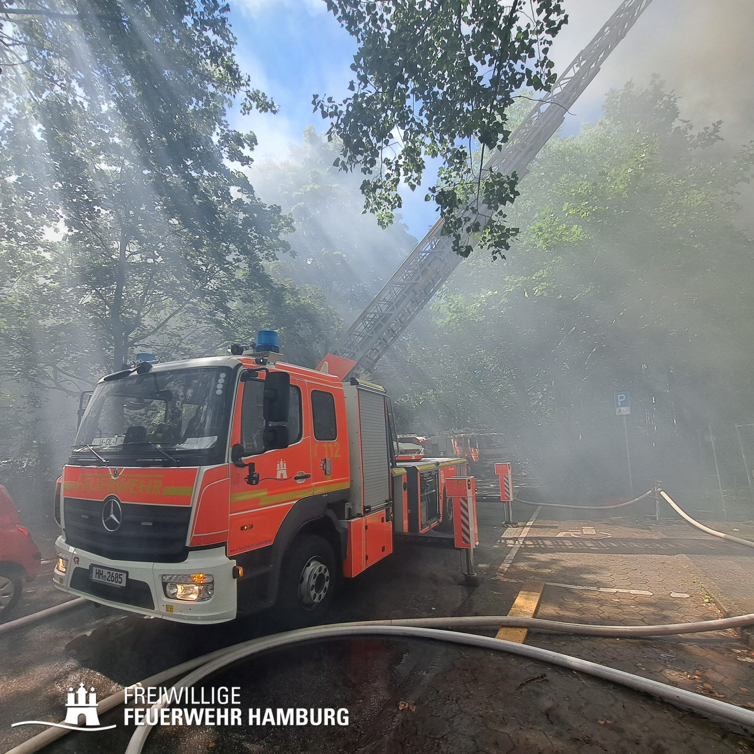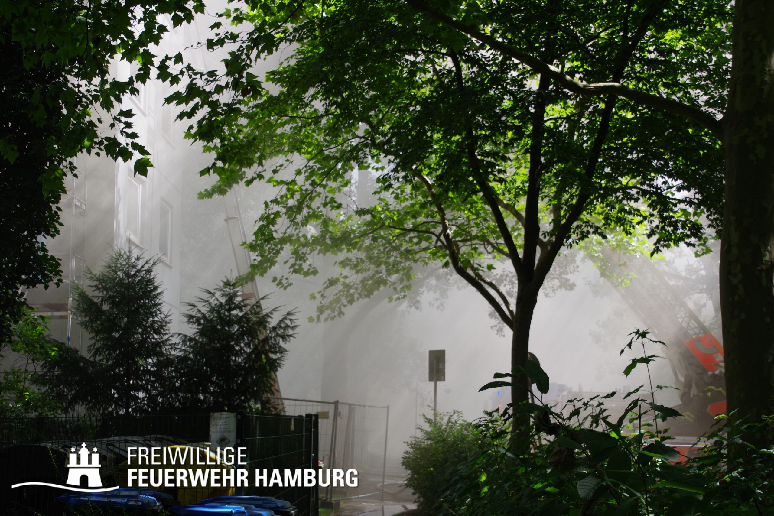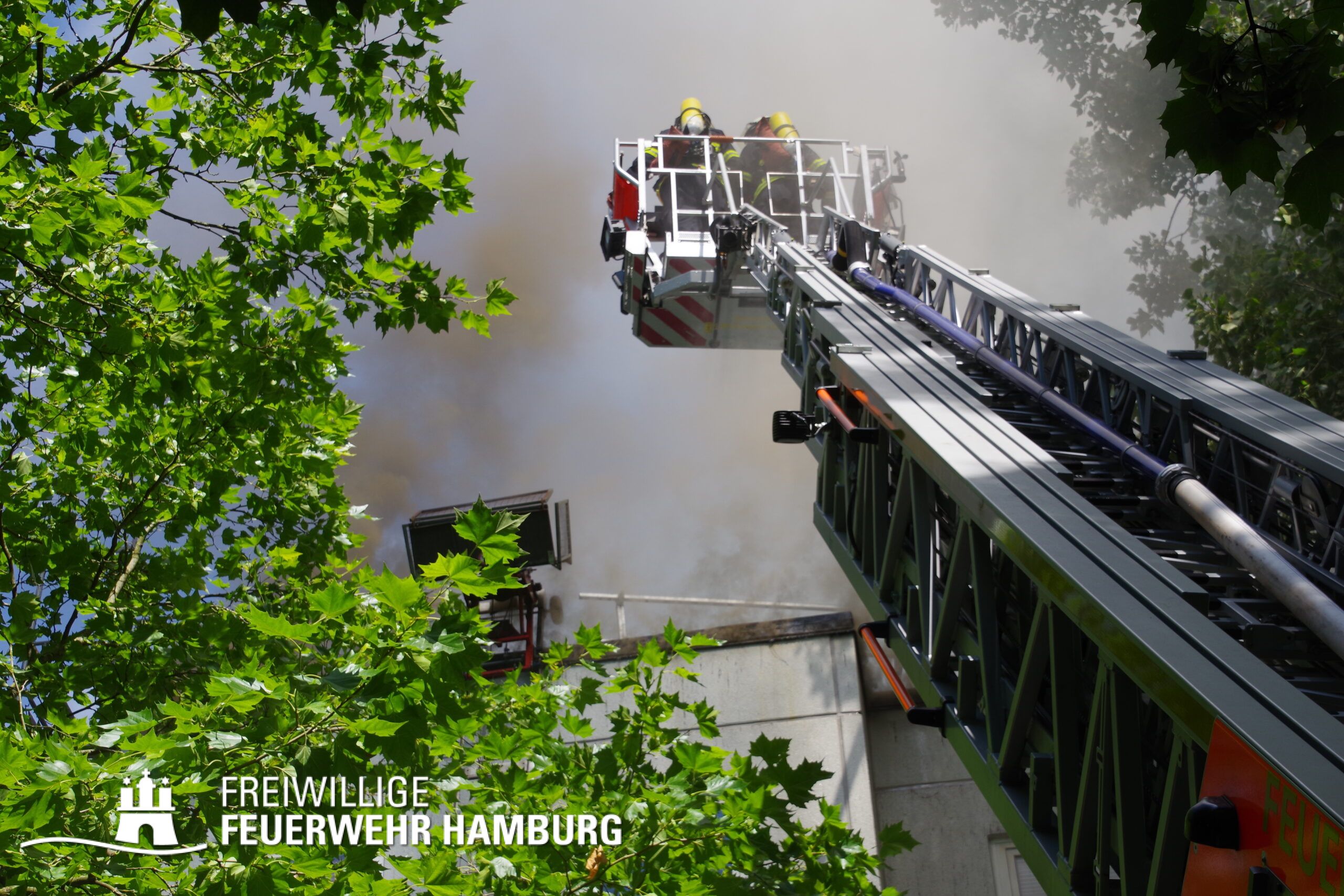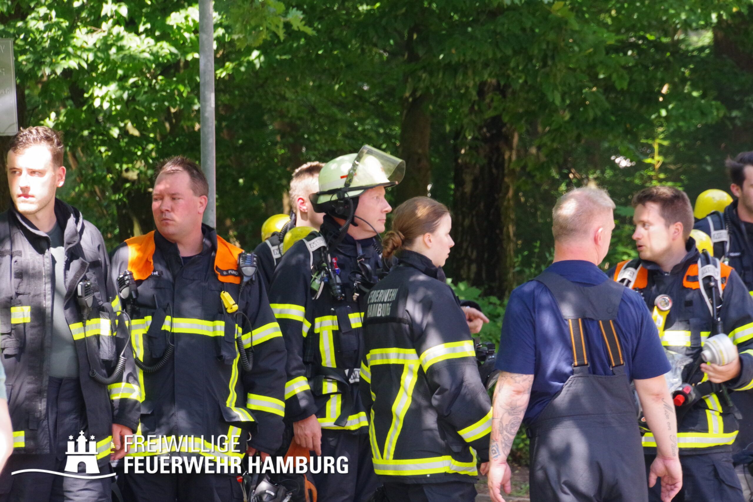 Der Bereichsführer Alstertal wurde bei dem Alarmstichwort FEU2 für die Einsatzleitung der Freiwilligen Feuerwehr alarmiert. Der Bereichsführer Nord unterstützte die Einsatzleitung als Abschnittsleiter im ELW2 der FF Eimsbüttel. Die FF Altona bildete mit ihrem GW-FM sowie dem FüLa den Technischen Teil der Einsatzleitung vor Ort. Der Bereichsführer Walddörfer wurde im späteren Verlauf als Ablösung hinzugezogen. Die FF Fuhlsbüttel, FF Groß Borstel und FF Wellingsbüttel waren zum Anfang mit der Berufsfeuerwehr bei einer umfangreichen Brandbekämpfung eingesetzt. Im weiteren Verlauf wurden hierfür als Ablösung und für Nachlösch- und Aufräumarbeiten die FF Bergstedt, FF Volksdorf, FF Sasel und FF Bramfeld alarmiert. Die FF Lokstedt wurde mit ihrem SW2000 für die Wasserversorgung des TMF70 (Teleskopmastfahrzeug mit Arbeitshöhe von 70 m) angefordert und unterstützte außerdem bei dem Aufbau einer zusätzlichen Wasserversorgung an der Einsatzstelle. Im weiteren Verlauf wurde auch hierfür eine Ablösung alarmiert, die FF Barmbek war dann aber kurz nach Alarmierung nicht mehr erforderlich. Die FF Eppendorf wurde durch die SEG Höhenrettung der Berufsfeuerwehr auf dem Dach gesichert und konnte so eine Dachhautöffnung mit Kettensägen und Trennschleifern durchführen. Außerdem wurde auch über das TMF70 gearbeitet, um Dachteile aufzunehmen. Die FF Ottensen-Bahrenfeld sorgte mit Softgetränken, Kaffee und Snacks für die Verpflegung der Einsatzkräfte. Auch hier wurde später abgelöst, dafür kam die FF Lemsahl-Mellingstedt an die Einsatzstelle.