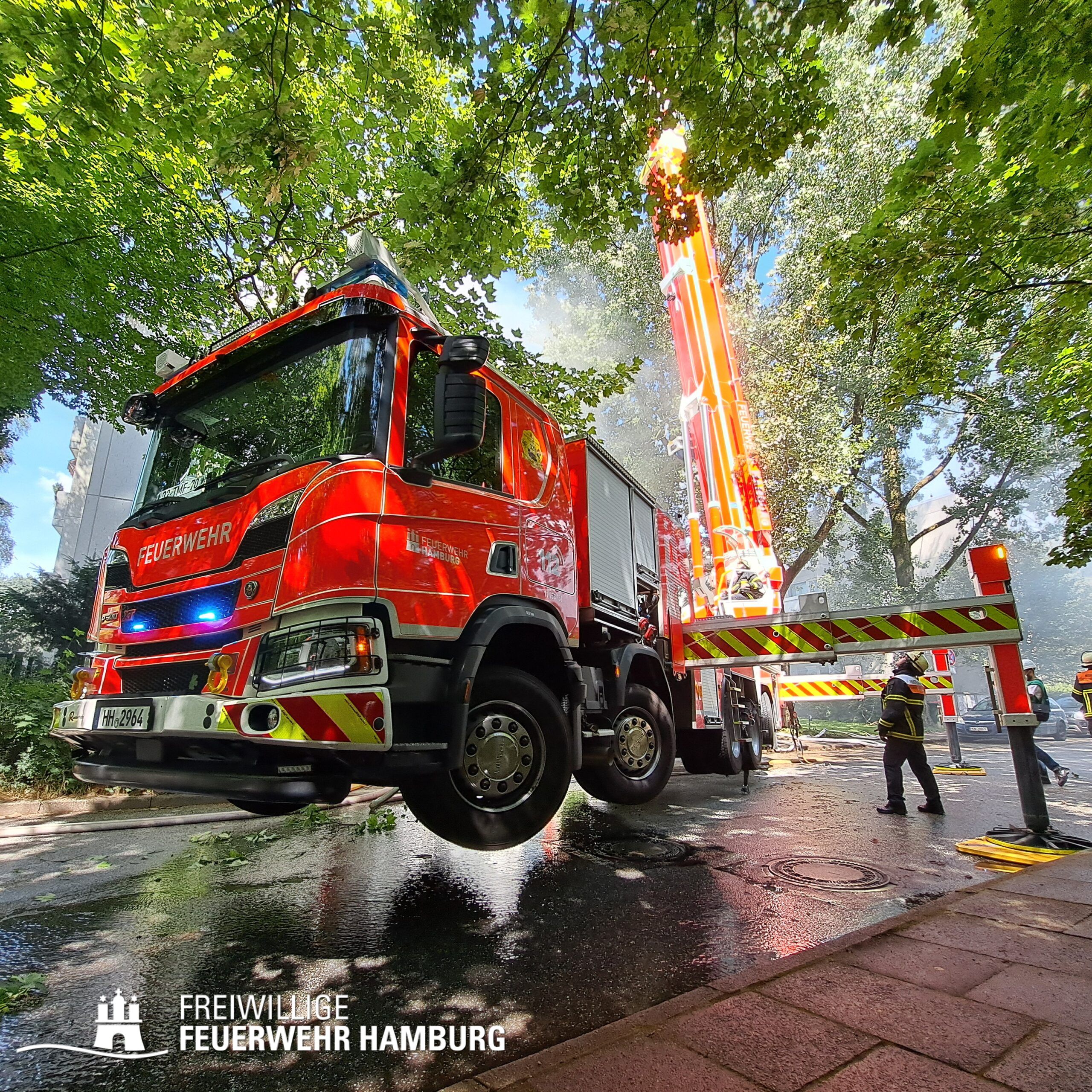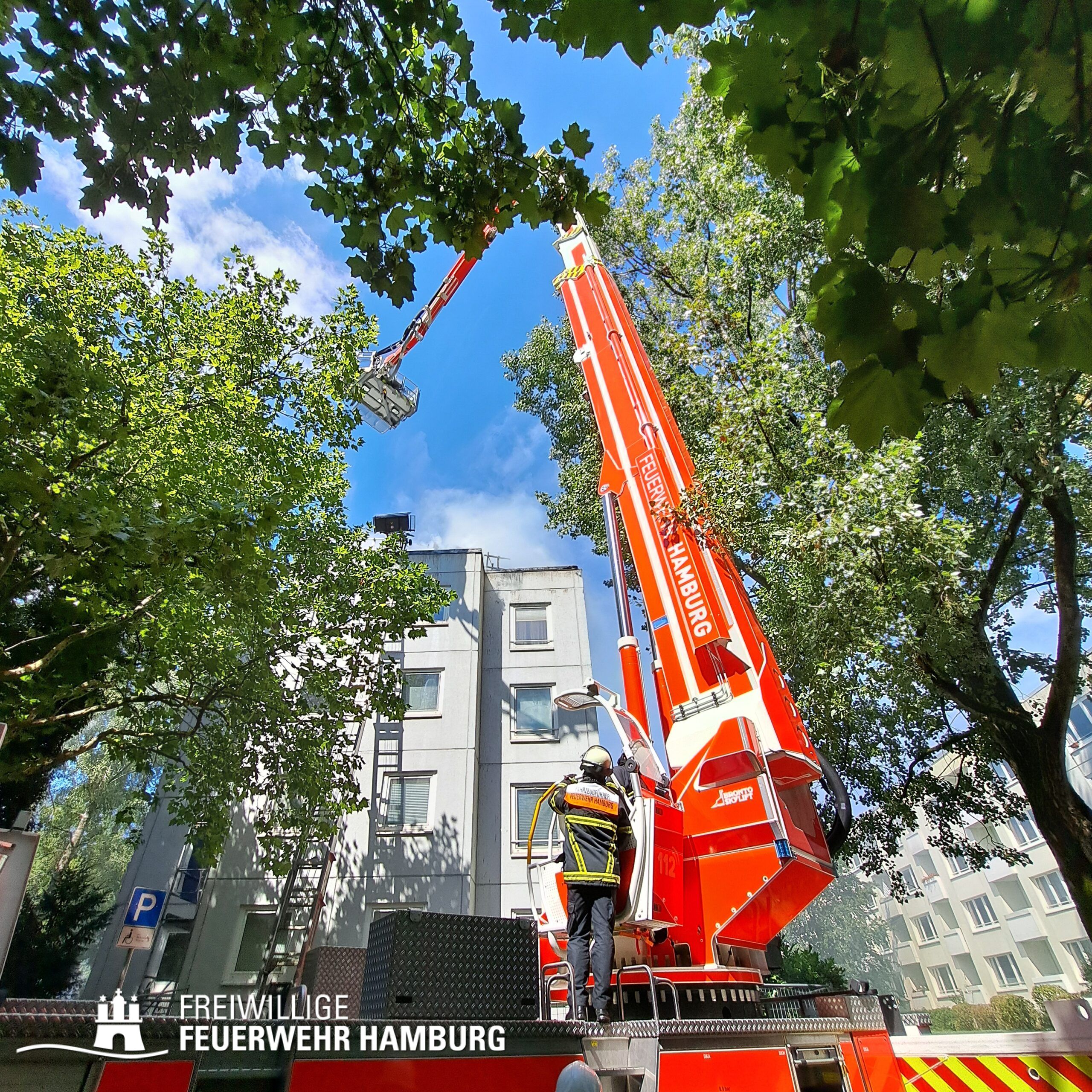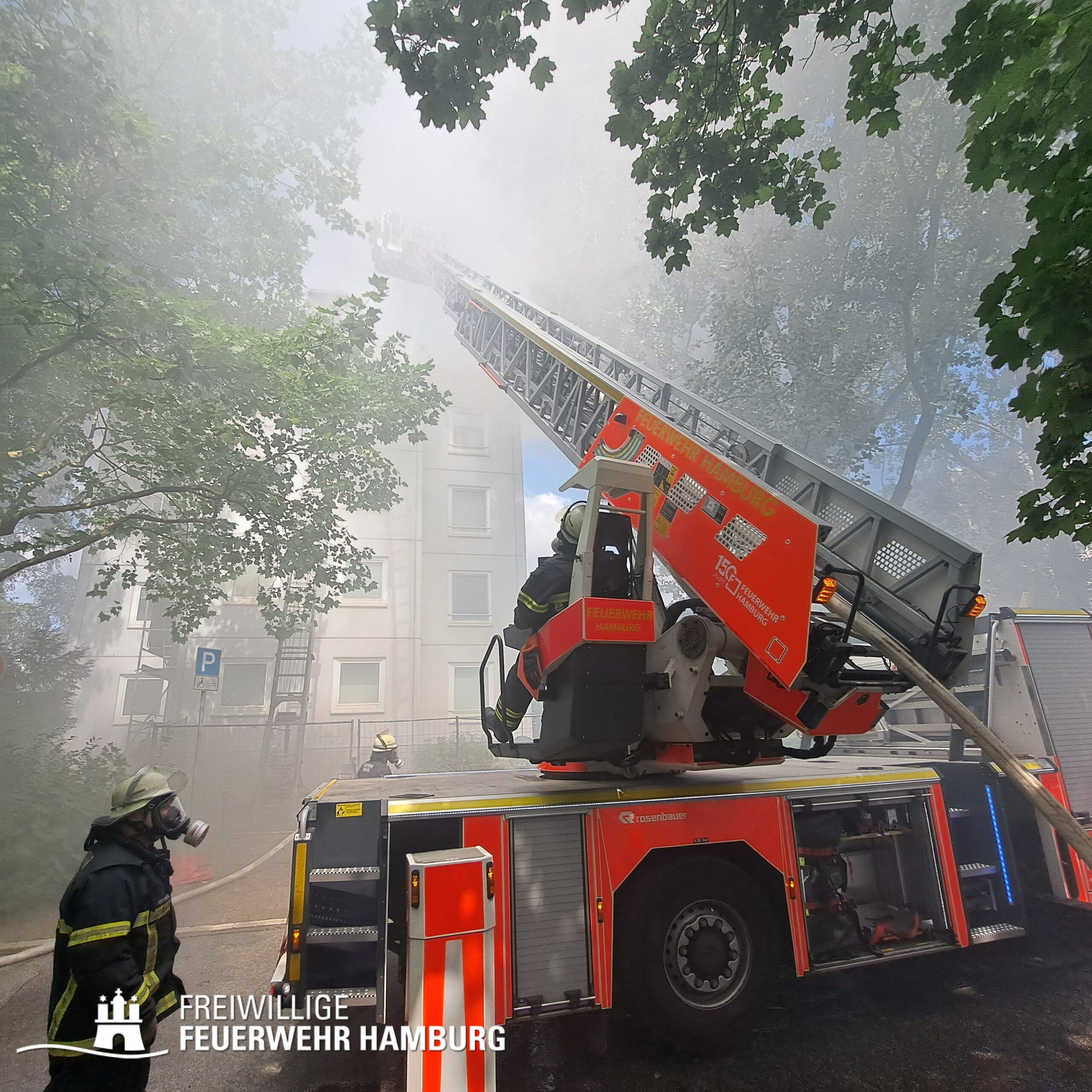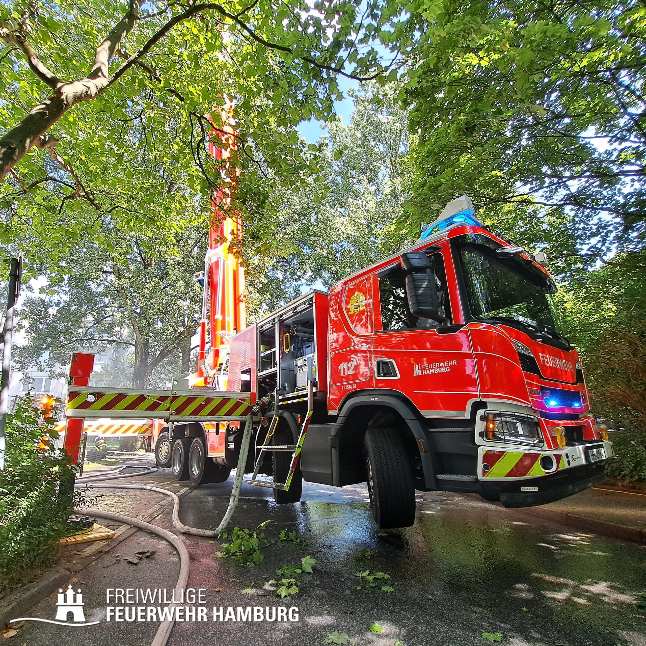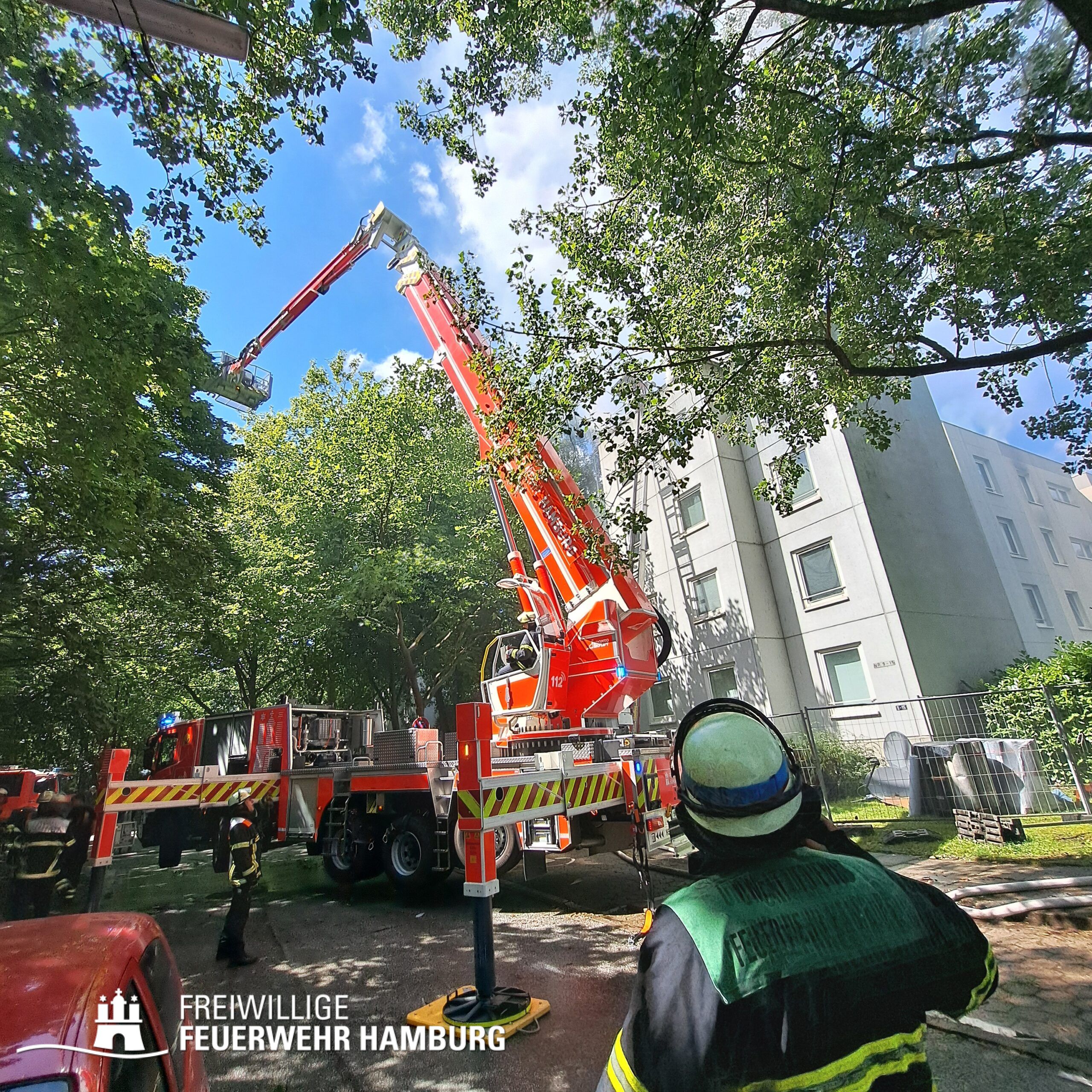 Der Bereichsführer Alstertal wurde bei dem Alarmstichwort FEU2 für die Einsatzleitung der Freiwilligen Feuerwehr alarmiert. Der Bereichsführer Nord unterstützte die Einsatzleitung als Abschnittsleiter im ELW2 der FF Eimsbüttel. Die FF Altona bildete mit ihrem GW-FM sowie dem FüLa den Technischen Teil der Einsatzleitung vor Ort. Der Bereichsführer Walddörfer wurde im späteren Verlauf als Ablösung hinzugezogen. Die FF Fuhlsbüttel, FF Groß Borstel und FF Wellingsbüttel waren zum Anfang mit der Berufsfeuerwehr bei einer umfangreichen Brandbekämpfung eingesetzt. Im weiteren Verlauf wurden hierfür als Ablösung und für Nachlösch- und Aufräumarbeiten die FF Bergstedt, FF Volksdorf, FF Sasel und FF Bramfeld alarmiert. Die FF Lokstedt wurde mit ihrem SW2000 für die Wasserversorgung des TMF70 (Teleskopmastfahrzeug mit Arbeitshöhe von 70 m) angefordert und unterstützte außerdem bei dem Aufbau einer zusätzlichen Wasserversorgung an der Einsatzstelle. Im weiteren Verlauf wurde auch hierfür eine Ablösung alarmiert, die FF Barmbek war dann aber kurz nach Alarmierung nicht mehr erforderlich. Die FF Eppendorf wurde durch die SEG Höhenrettung der Berufsfeuerwehr auf dem Dach gesichert und konnte so eine Dachhautöffnung mit Kettensägen und Trennschleifern durchführen. Außerdem wurde auch über das TMF70 gearbeitet, um Dachteile aufzunehmen. Die FF Ottensen-Bahrenfeld sorgte mit Softgetränken, Kaffee und Snacks für die Verpflegung der Einsatzkräfte. Auch hier wurde später abgelöst, dafür kam die FF Lemsahl-Mellingstedt an die Einsatzstelle.