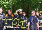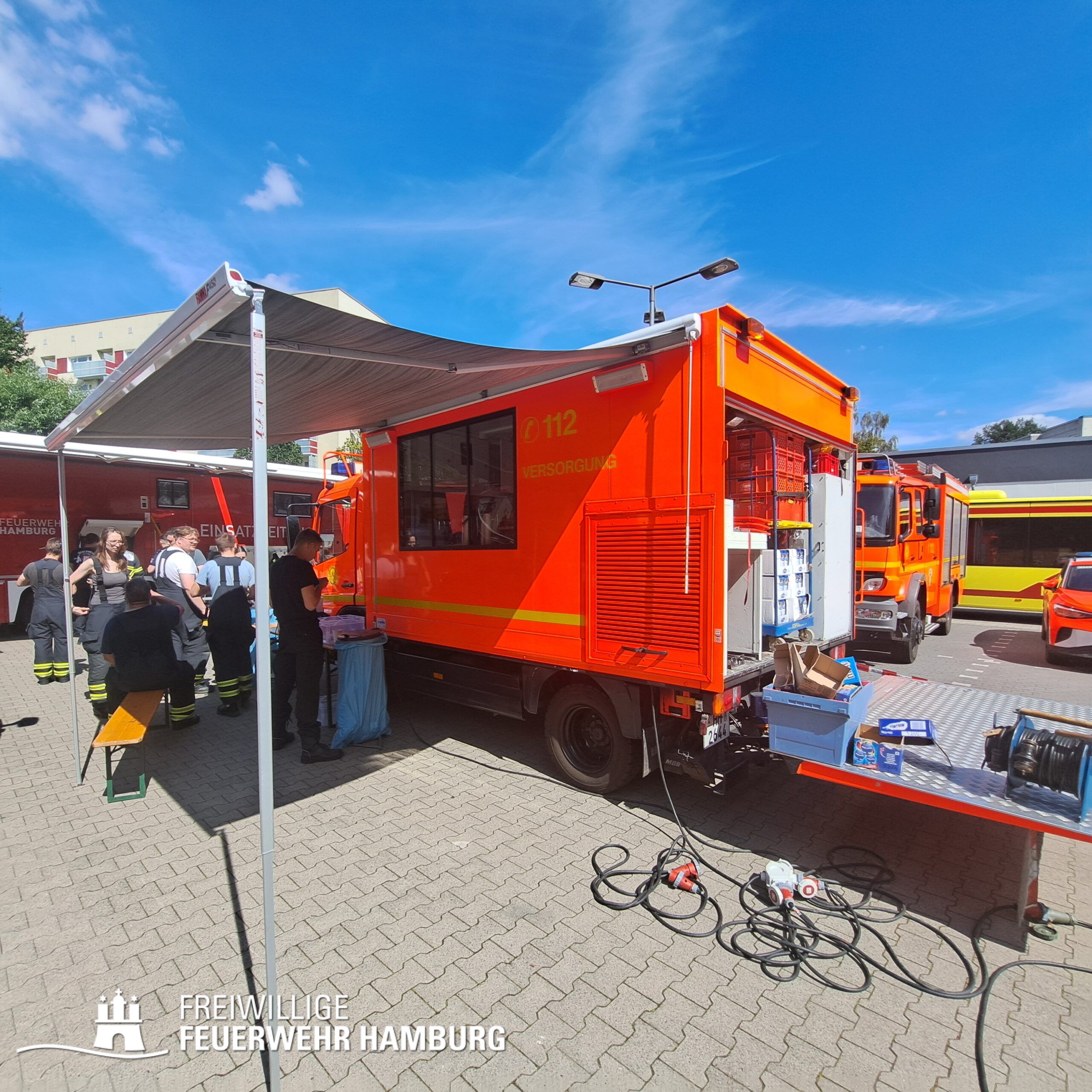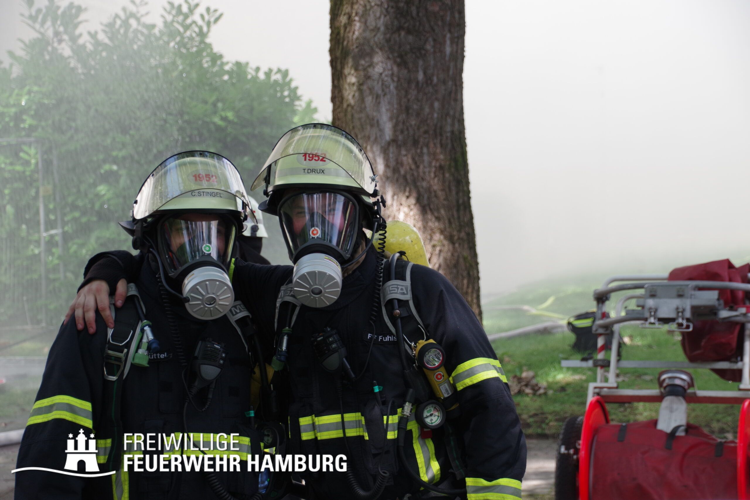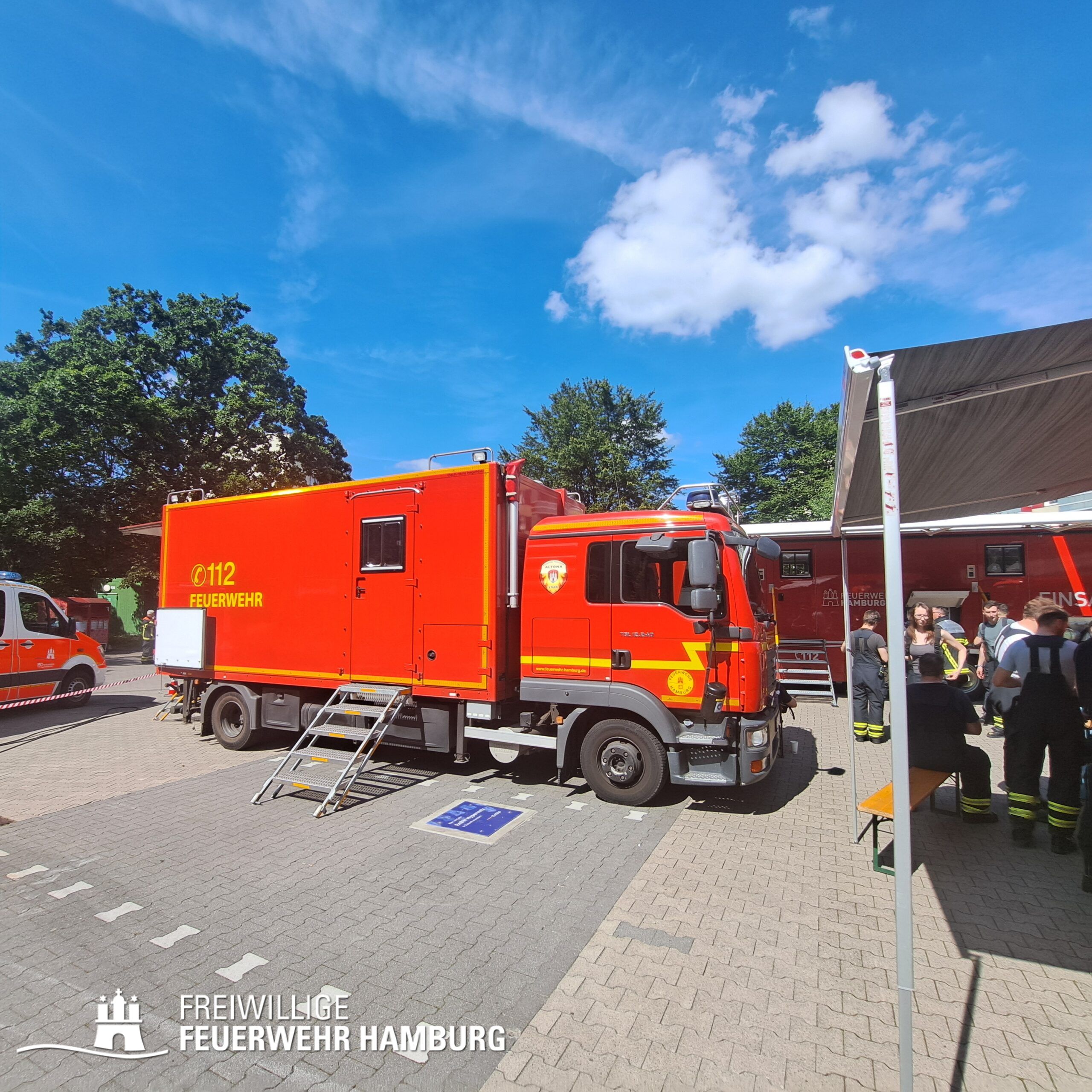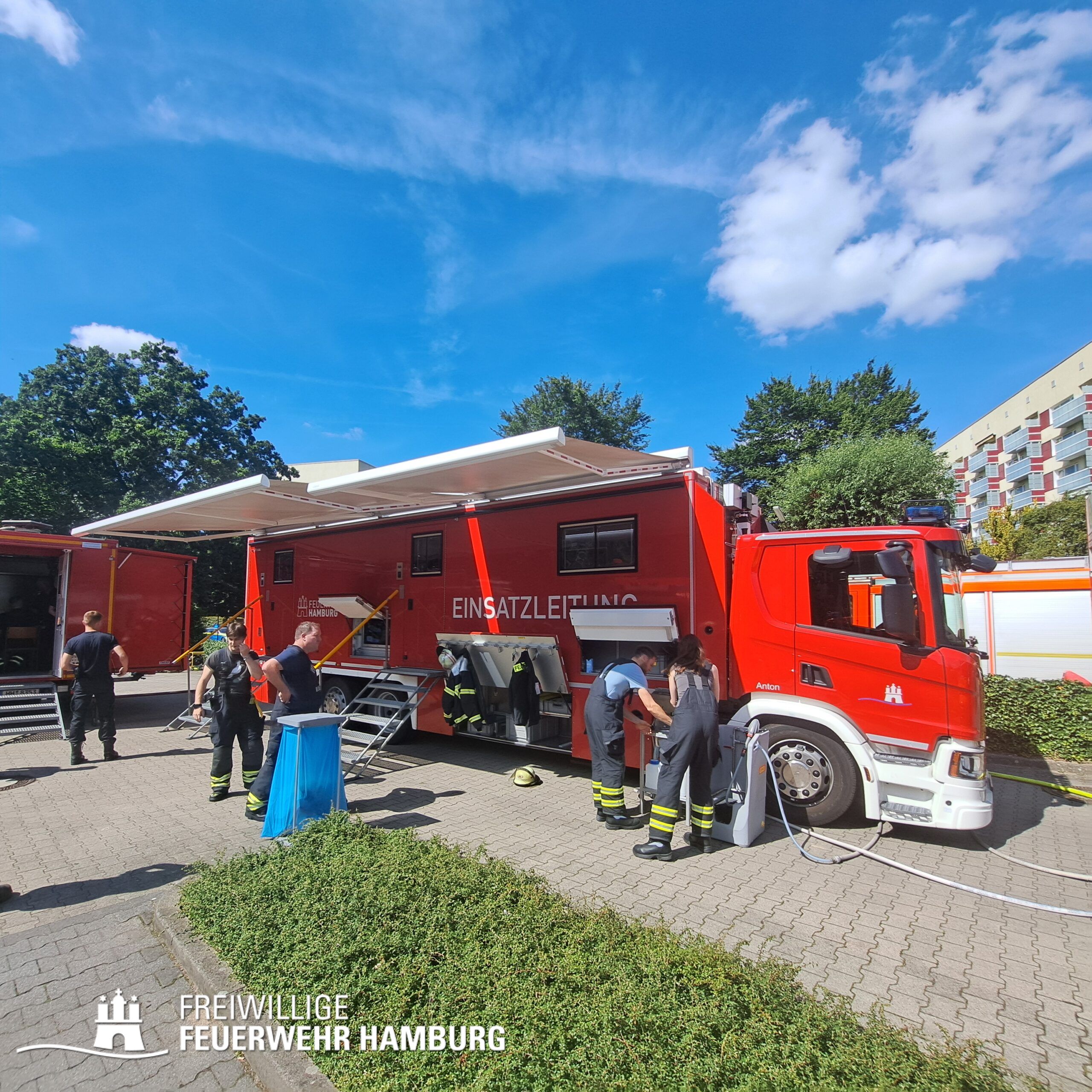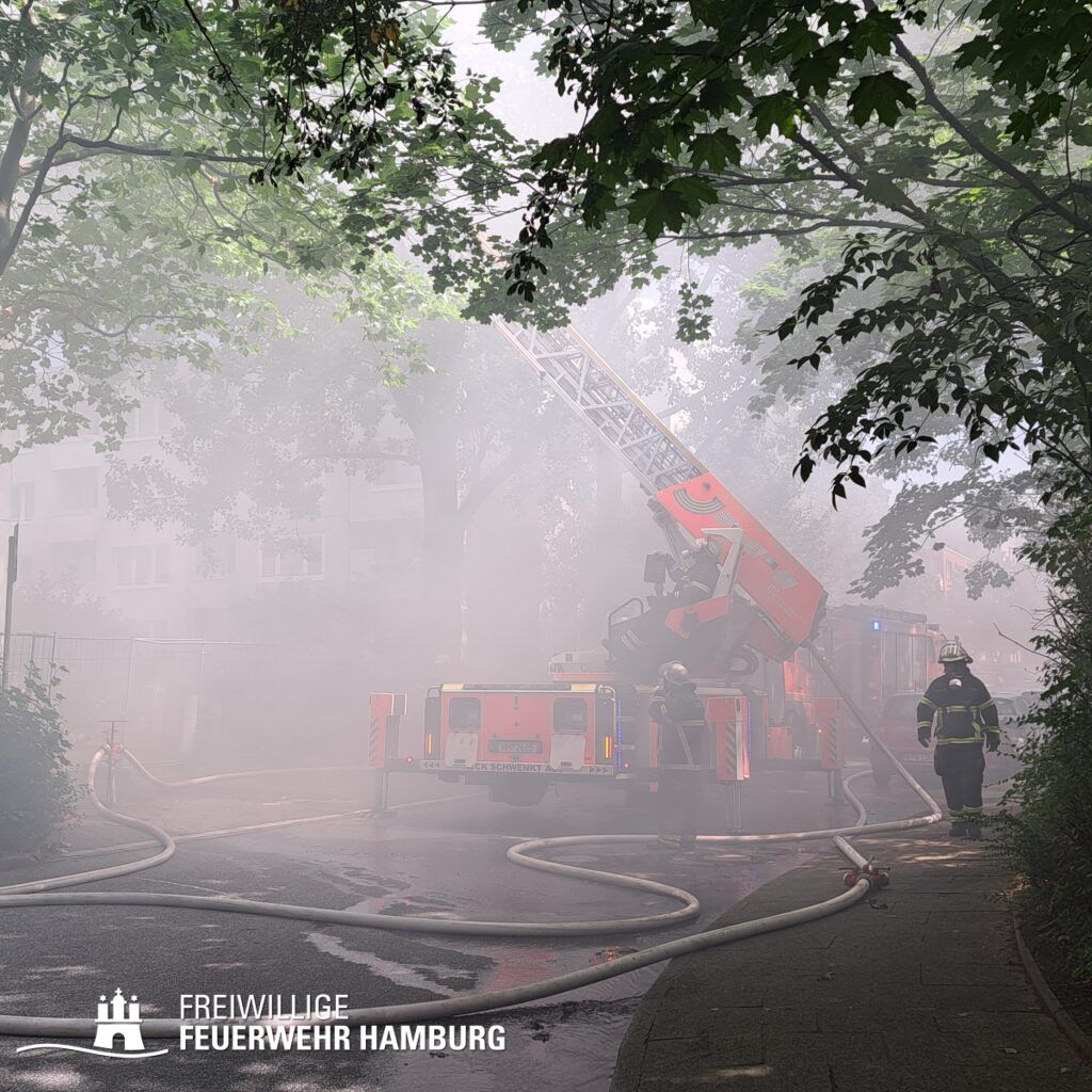 Der Bereichsführer Alstertal wurde bei dem Alarmstichwort FEU2 für die Einsatzleitung der Freiwilligen Feuerwehr alarmiert. Der Bereichsführer Nord unterstützte die Einsatzleitung als Abschnittsleiter im ELW2 der FF Eimsbüttel. Die FF Altona bildete mit ihrem GW-FM sowie dem FüLa den Technischen Teil der Einsatzleitung vor Ort. Der Bereichsführer Walddörfer wurde im späteren Verlauf als Ablösung hinzugezogen. Die FF Fuhlsbüttel, FF Groß Borstel und FF Wellingsbüttel waren zum Anfang mit der Berufsfeuerwehr bei einer umfangreichen Brandbekämpfung eingesetzt. Im weiteren Verlauf wurden hierfür als Ablösung und für Nachlösch- und Aufräumarbeiten die FF Bergstedt, FF Volksdorf, FF Sasel und FF Bramfeld alarmiert. Die FF Lokstedt wurde mit ihrem SW2000 für die Wasserversorgung des TMF70 (Teleskopmastfahrzeug mit Arbeitshöhe von 70 m) angefordert und unterstützte außerdem bei dem Aufbau einer zusätzlichen Wasserversorgung an der Einsatzstelle. Im weiteren Verlauf wurde auch hierfür eine Ablösung alarmiert, die FF Barmbek war dann aber kurz nach Alarmierung nicht mehr erforderlich. Die FF Eppendorf wurde durch die SEG Höhenrettung der Berufsfeuerwehr auf dem Dach gesichert und konnte so eine Dachhautöffnung mit Kettensägen und Trennschleifern durchführen. Außerdem wurde auch über das TMF70 gearbeitet, um Dachteile aufzunehmen. Die FF Ottensen-Bahrenfeld sorgte mit Softgetränken, Kaffee und Snacks für die Verpflegung der Einsatzkräfte. Auch hier wurde später abgelöst, dafür kam die FF Lemsahl-Mellingstedt an die Einsatzstelle.