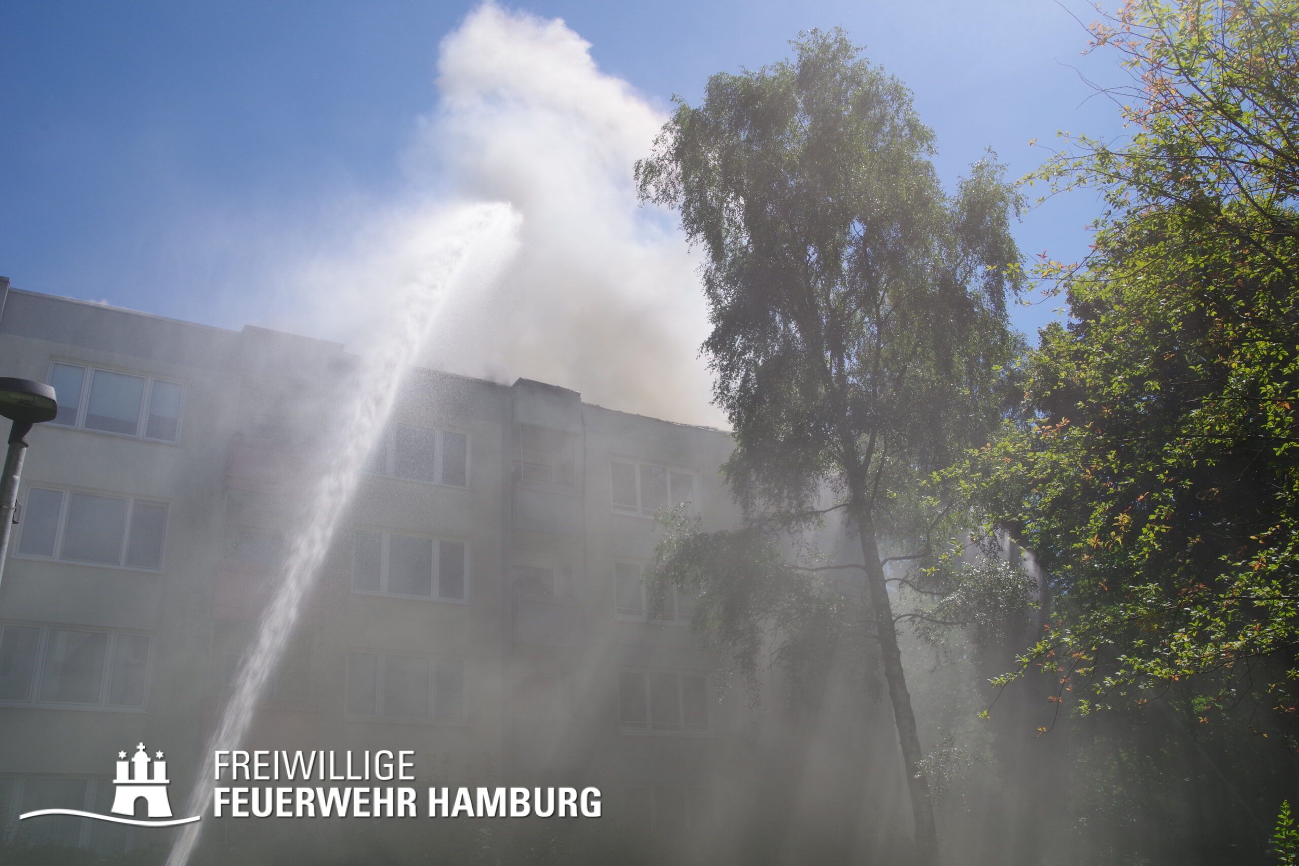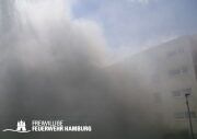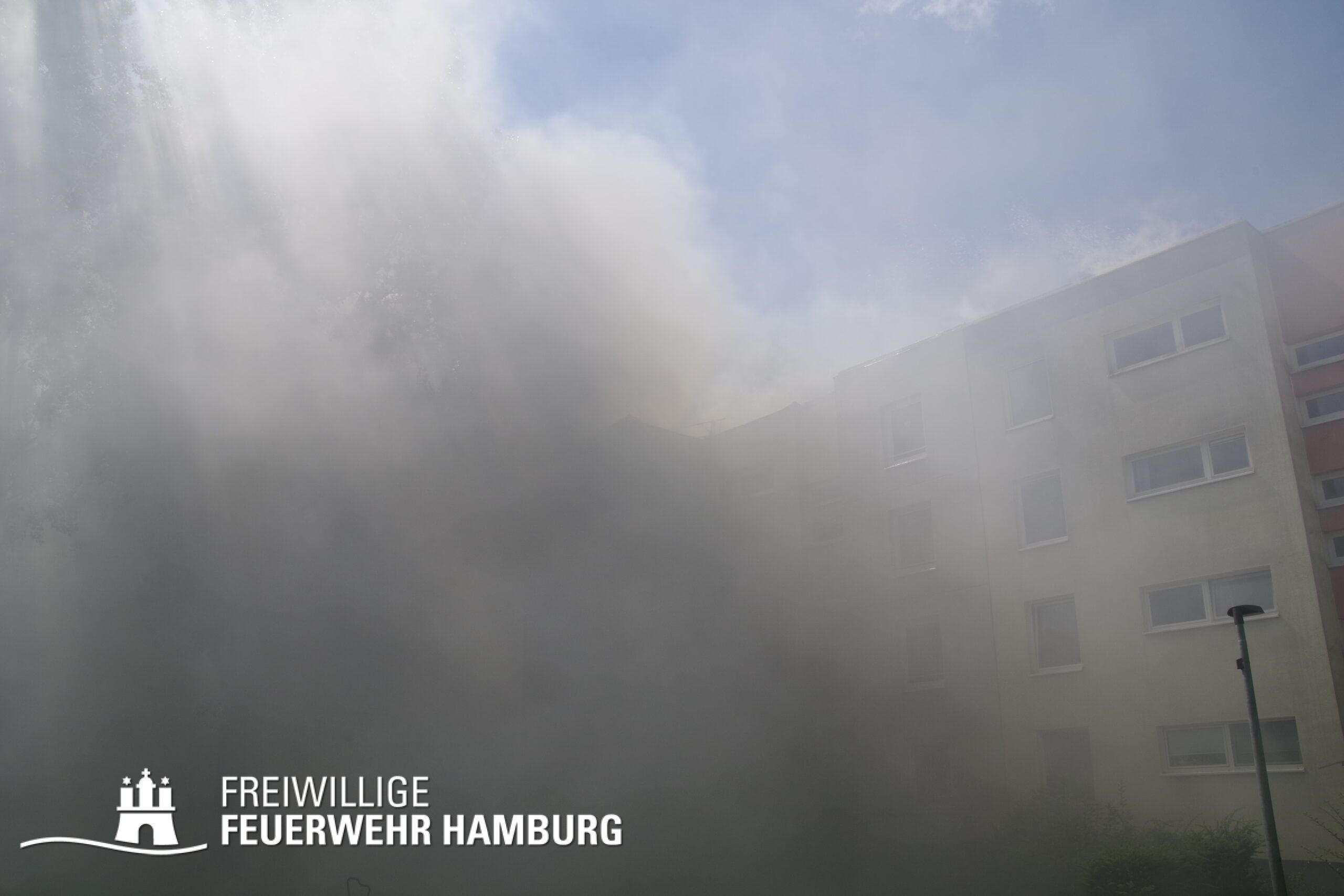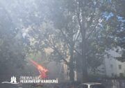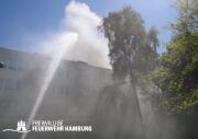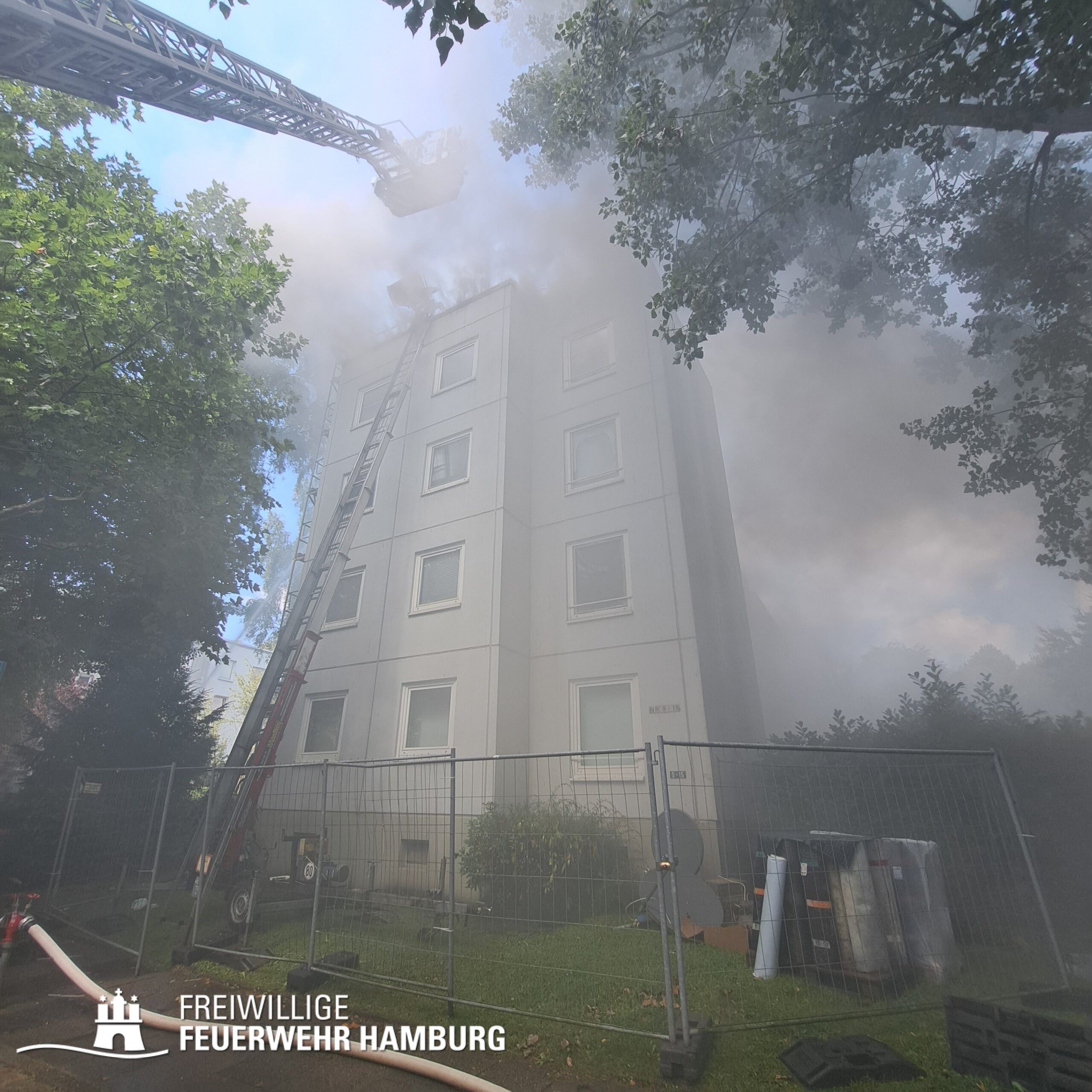 Am Montagmittag gegen 11 Uhr kam es zum Brand eines Teils der Dachfläche eines 4-geschossigen Mehrfamilienhauses in Hummelsbüttel. Die Einsatzkräfte vor Ort erhöhten zügig auf das Alarmstichwort FEU2, was später auf FEU3MANV5 (Feuer, 3 Löschzüge, Massenanfall von Verletzten, mind. 5 betroffene Personen) erhöht wurde. Das Feuer hatte sich im Zwischenraum von Dachfläche und oberster Geschoßdecke festgesetzt.