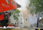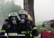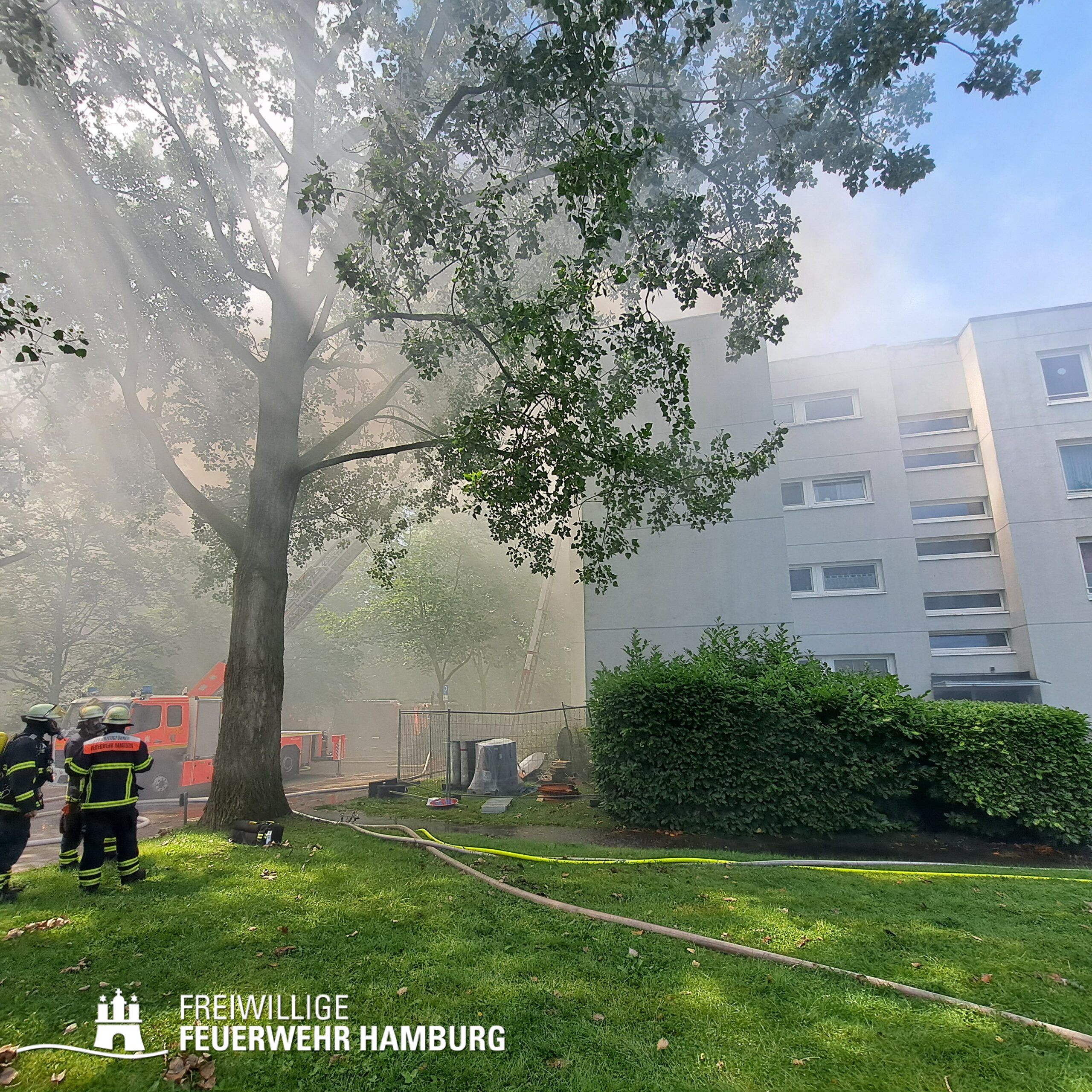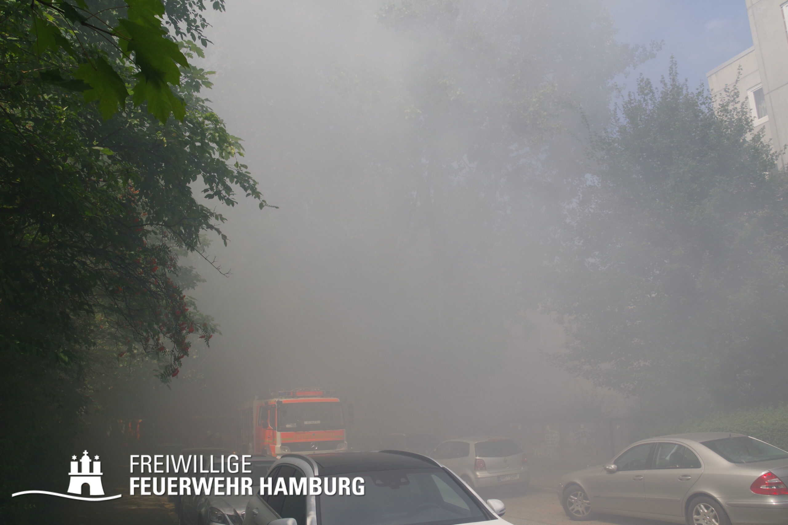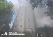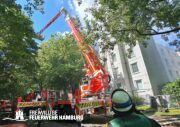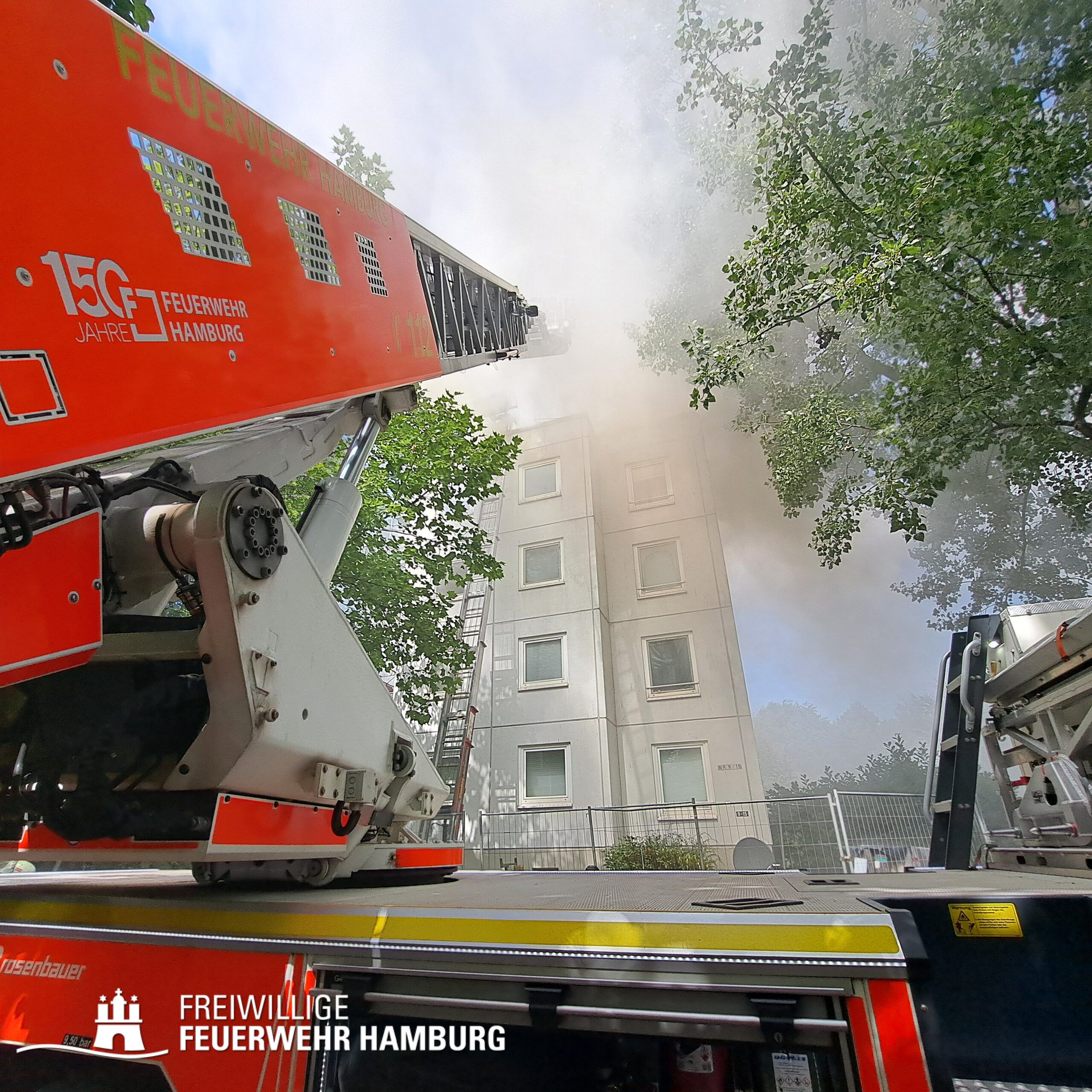 Am Montagmittag gegen 11 Uhr kam es zum Brand eines Teils der Dachfläche eines 4-geschossigen Mehrfamilienhauses in Hummelsbüttel. Die Einsatzkräfte vor Ort erhöhten zügig auf das Alarmstichwort FEU2, was später auf FEU3MANV5 (Feuer, 3 Löschzüge, Massenanfall von Verletzten, mind. 5 betroffene Personen) erhöht wurde. Das Feuer hatte sich im Zwischenraum von Dachfläche und oberster Geschoßdecke festgesetzt.