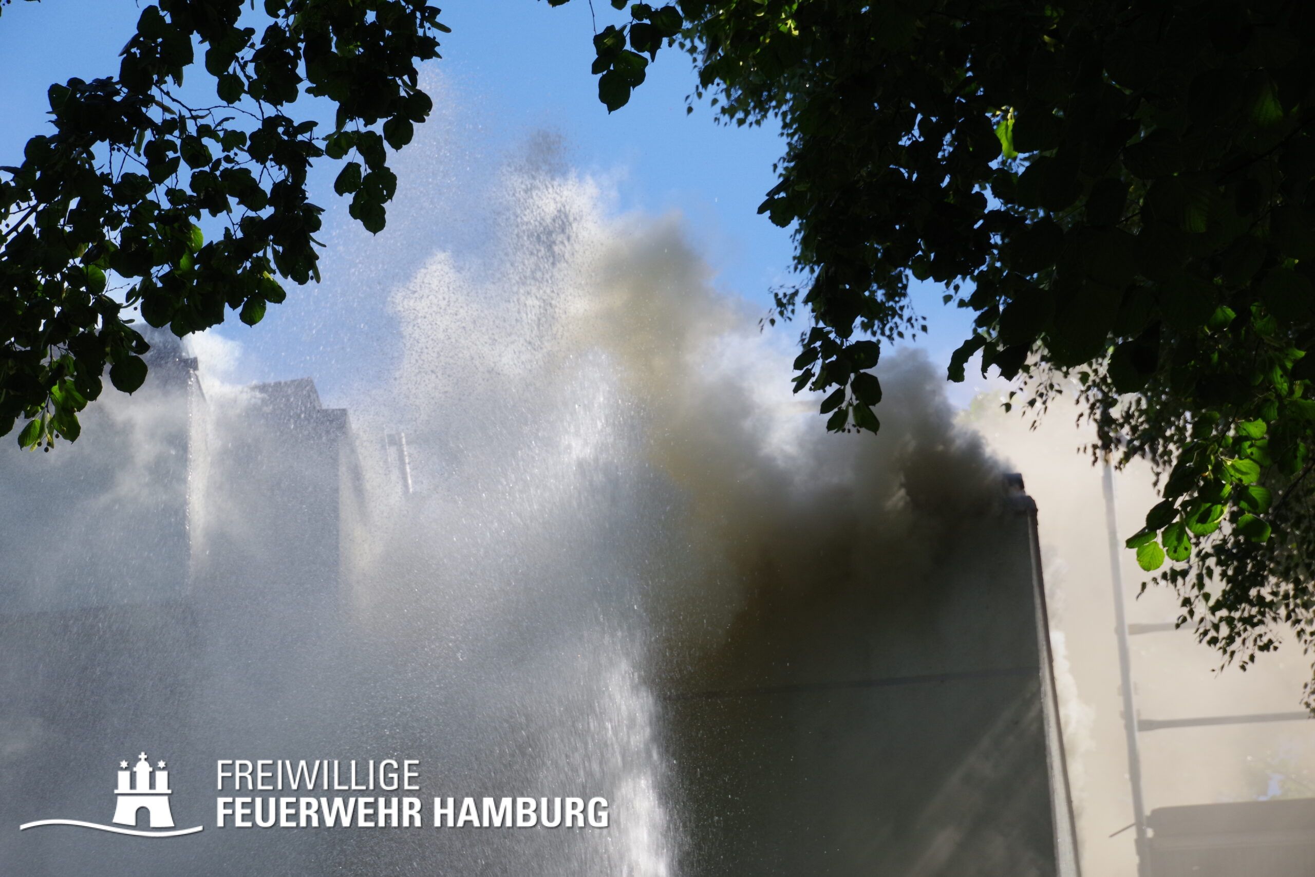 Das Flachdach brannte auf einer Fläche von ca. 200 qm. Vom Boden aus wurden zwei B-Rohre als Riegelstellung betrieben und 3 C-Rohre wurden über eine Drehleiter sowie zwei Treppenaufgänge in den Einsatz gebracht. Dadurch konnte eine weitere Ausbreitung auf die gesamte Dachfläche verhindert werden. Das Feuer konnte durch den Einsatz sog. Fognails (Löschnägel), die durch die Dachhaut in den Zwischenraum geschlagen wurden, eingedämmt werden. Dazu kam neben dem Teleskopmastfahrzeug 70 auch die FF Eppendorf und die Höhenrettungsgruppe der Berufsfeuerwehr zum Einsatz um eine gesicherte Dachhautöffnung durchzuführen.