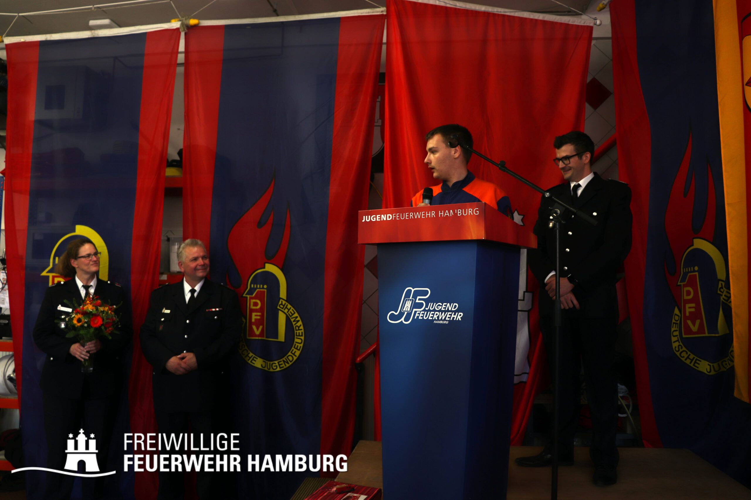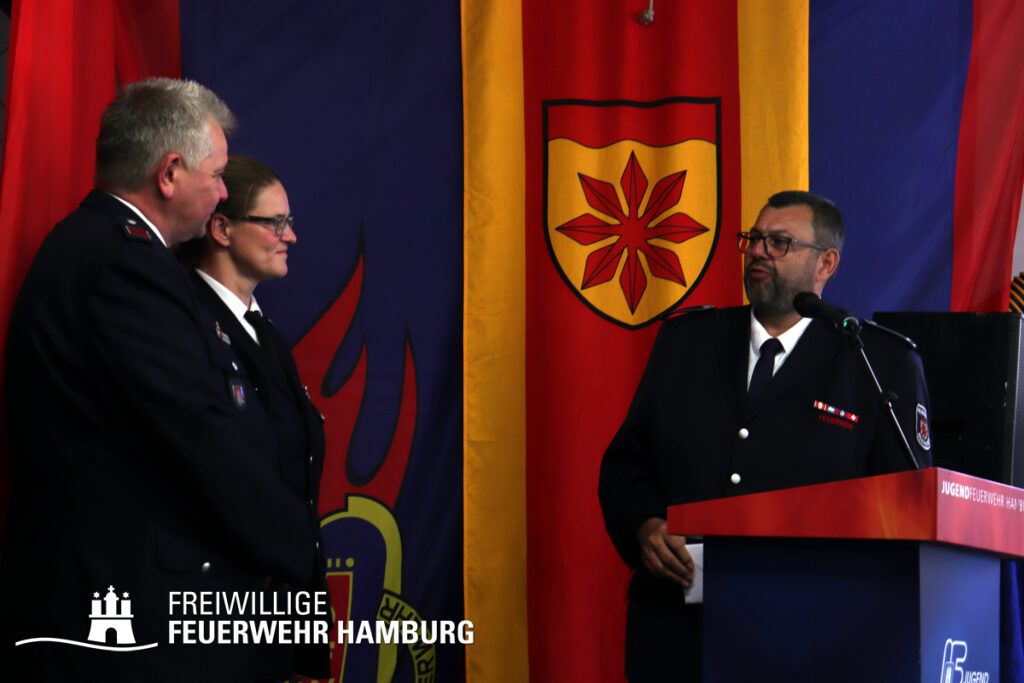 Dass dies erfolgreich gelingt, zeigen die vielen Gäste, welche von fern und nah angereist sind, um das Jubiläum gebührend zu feiern. Neben allen aktuellen Mitgliedern der Fuhlsbütteler Jugendgruppe waren vor allem ehemalige Angehörige und natürlich Wegbegleiter des letzten halben Jahrhunderts eingeladen. Dazu gehörten auch Angehörige befreundeter Wehren wie der Feuerwehr Meerbusch, Löschzug Osterrath, welche inzwischen auf eine ebenso 50-jährige Freundschaft zur Feuerwehr Fuhlsbüttel zurückblicken kann. Grußworte überbrachten zudem der kommissarische Amtsleiter Jörg Sauermann, Landesbereichsführer Harald Burghardt, Landesjugendfeuerwehrwart Kai Winter und Bereichsführer Sven Kohlrusch. Zu Wort kamen neben Jugendwart Sven Ellerbrock und Wehrführer Simon Witt aber auch Vertreter aus der Lokal- und Bundespolitik, um sich für das Engagement um die Jugendarbeit im Stadtteil zu bedanken.