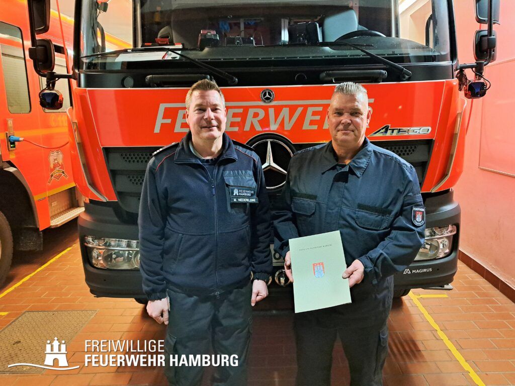 Der Wehrführer, Marco Niederkleine, überbrachte die Glückwünsche vom stellvertretenden Amtsleiter der Feuerwehr Hamburg und dem Landesbereichsführer der Freiwilligen Feuerwehr. Des Weiteren wurde der Kamerad Thomas Hartung mit der “Feuerwehr – Verdienstmedaille der 1. Stufe” im Namen des Präses der Behörde für Inneres und Sport, Senator Andy Grote, für sein ehrenamtliches Engagement und seine verdienstvolle Tätigkeit ausgezeichnet.