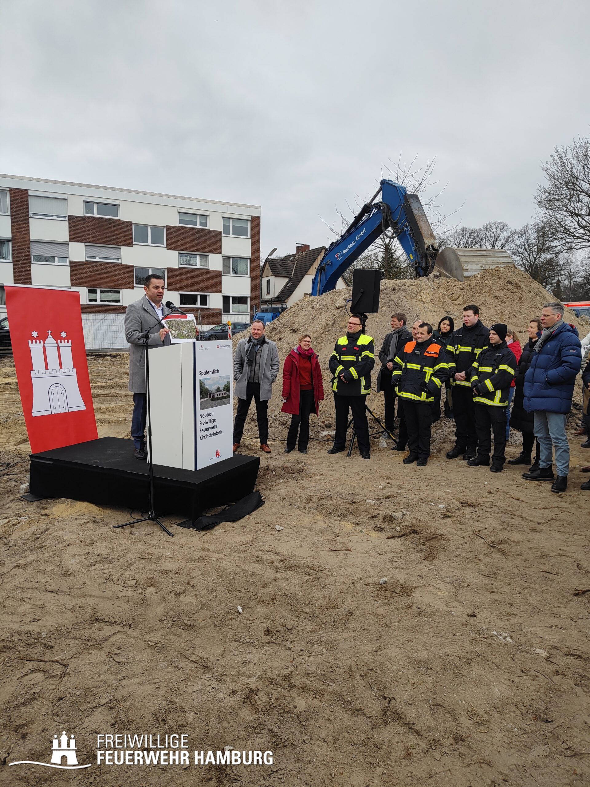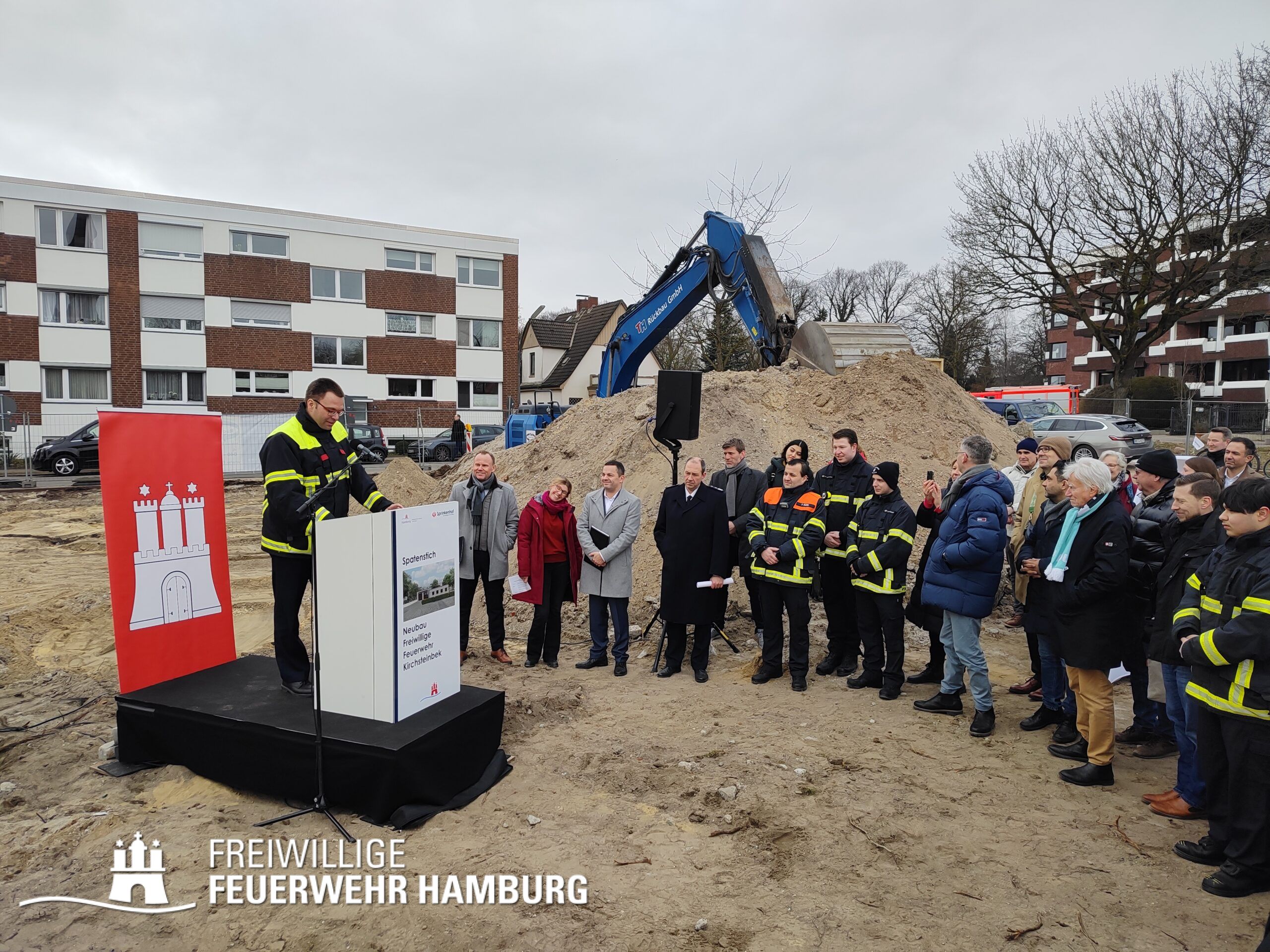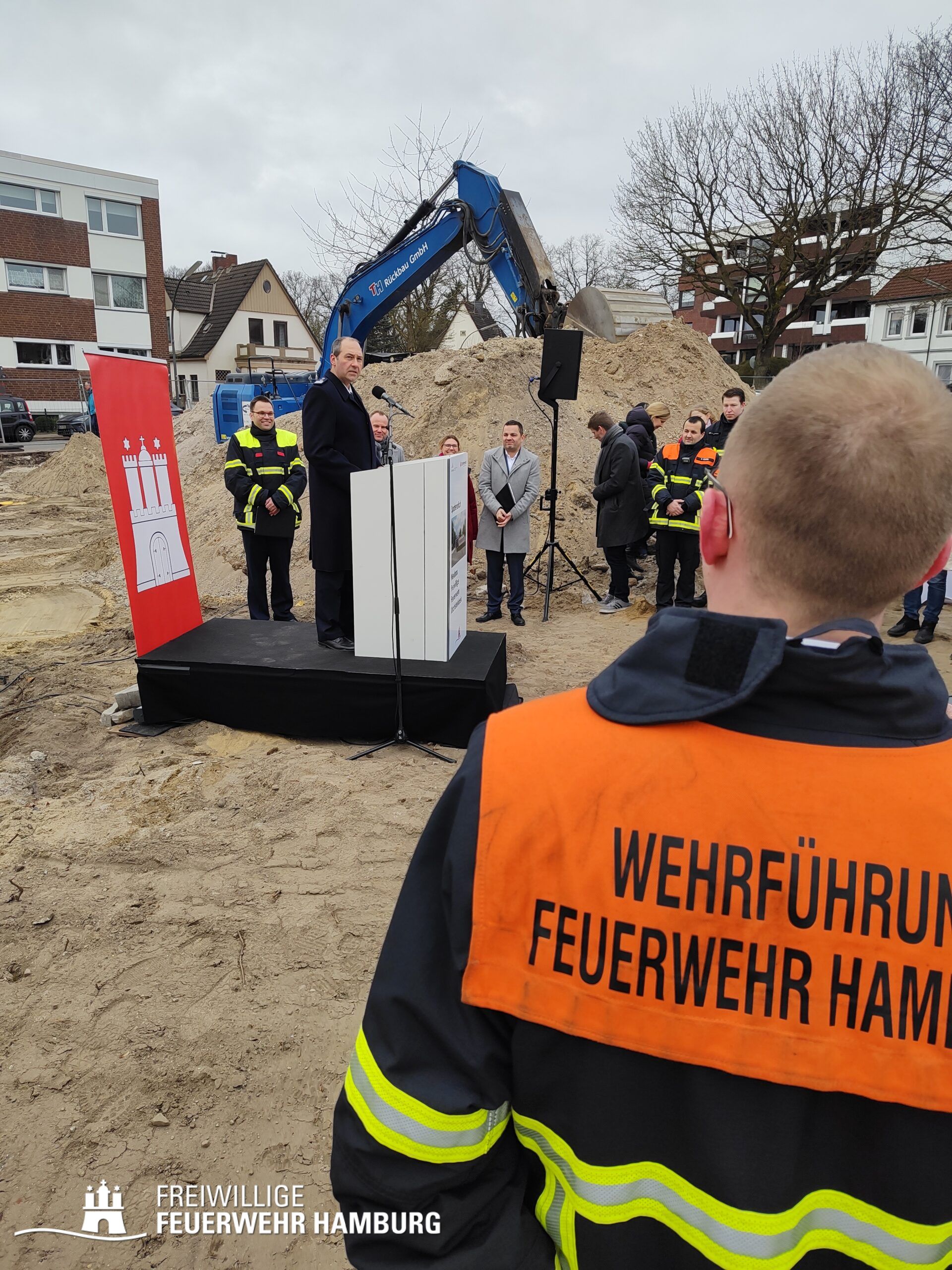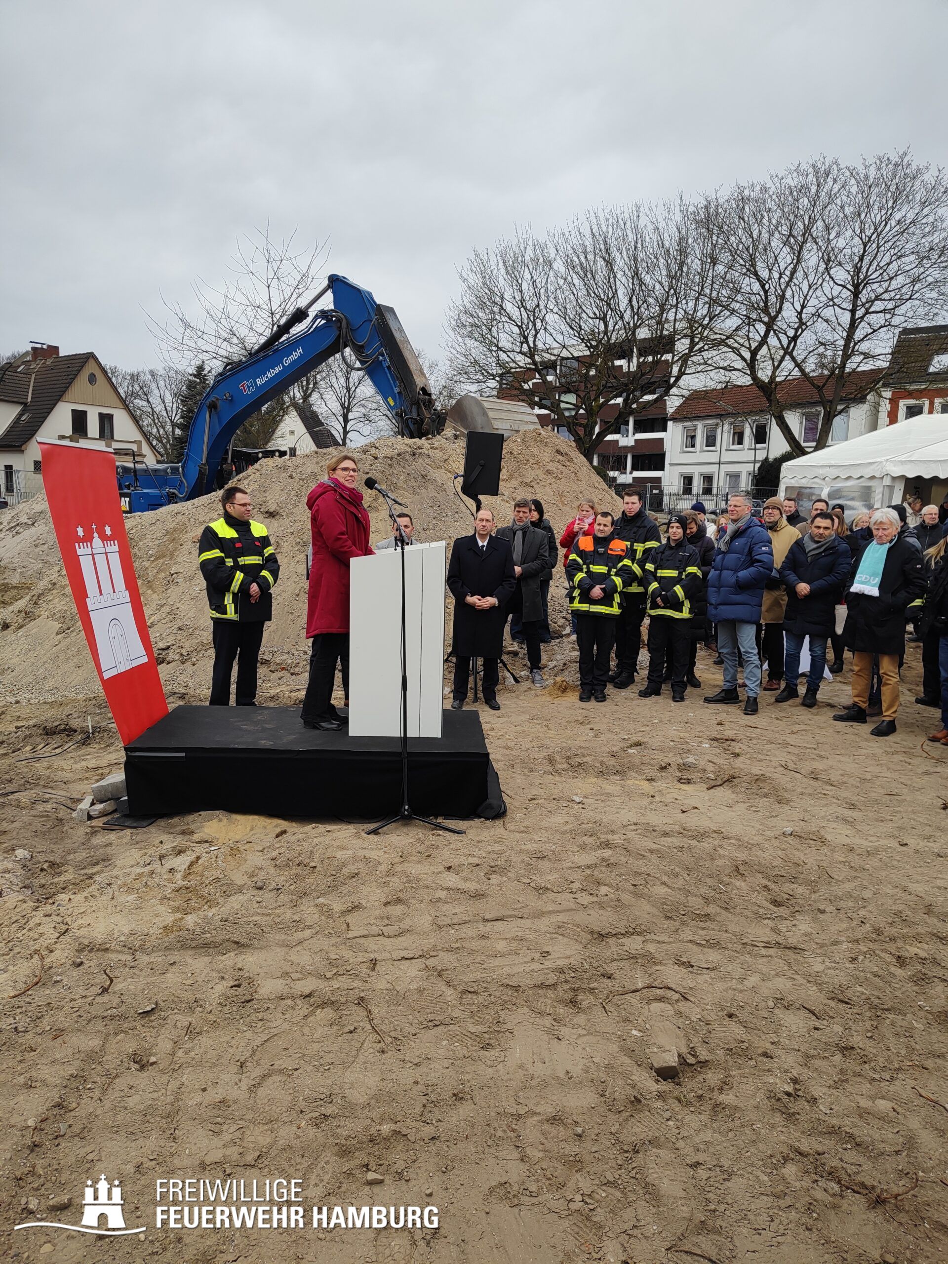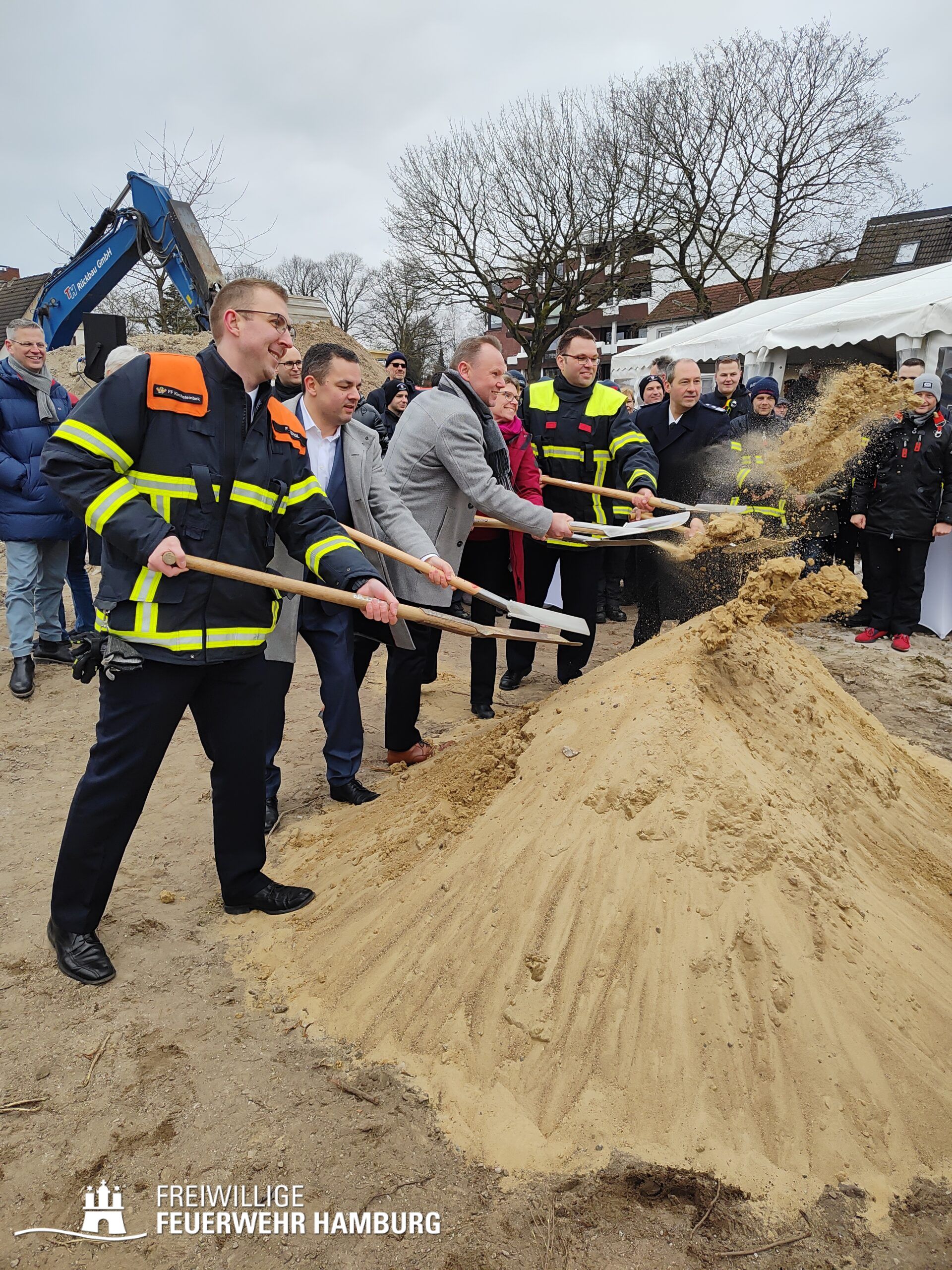 Der erste symbolische Spatenstich wurde heute durch Andy Grote, Senator der Behörde für Inneres und Sport, Ralf Neubauer, Bezirksamtsleiter Hamburg-Mitte, Jörg Sauermann, Leiter der Feuerwehr Hamburg, Harald Burghart, Landesbereichsführer der Freiwilligen Feuerwehr Hamburg, Nadine Krause-Möller, Abteilungsleiterin der Sprinkenhof sowie Fabian Sengl, Wehrführer der FF Kirchsteinbek, gesetzt.