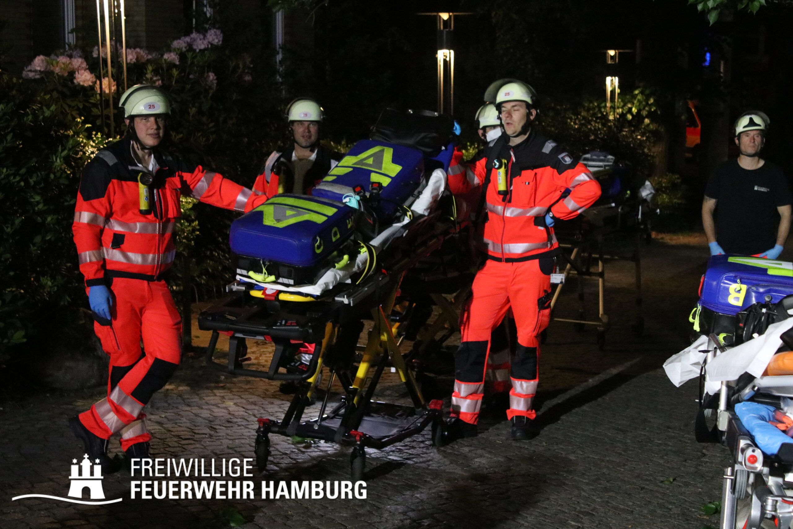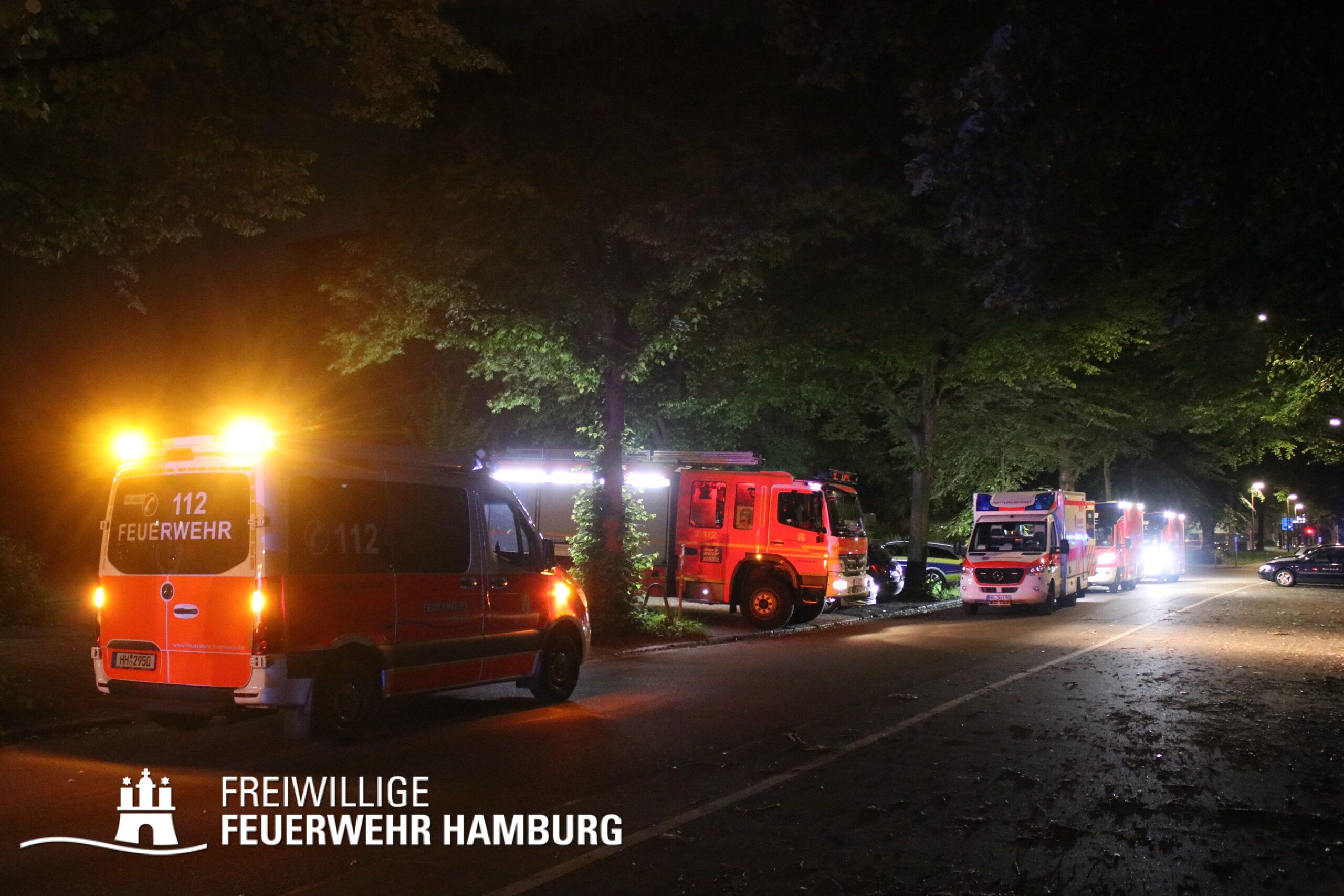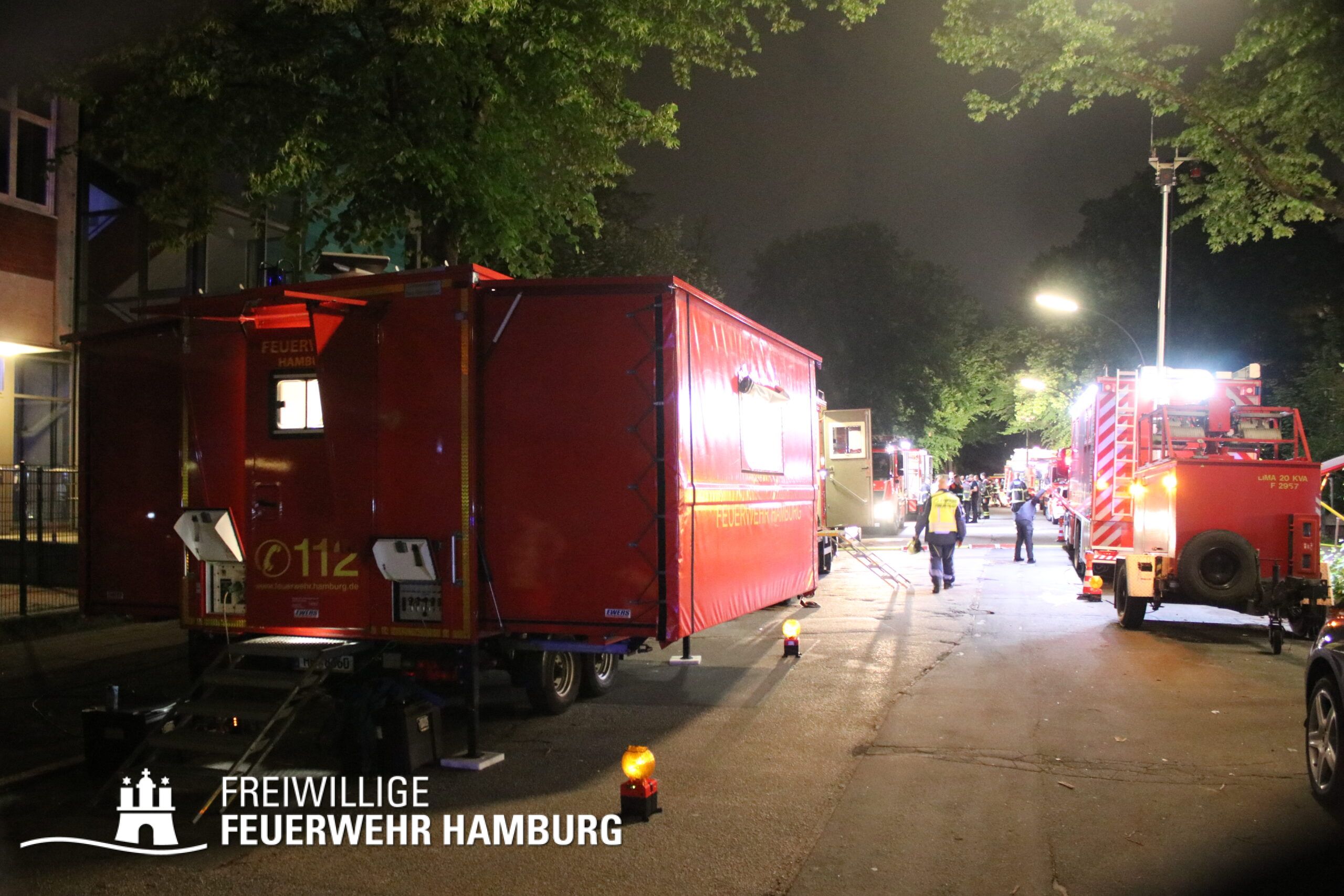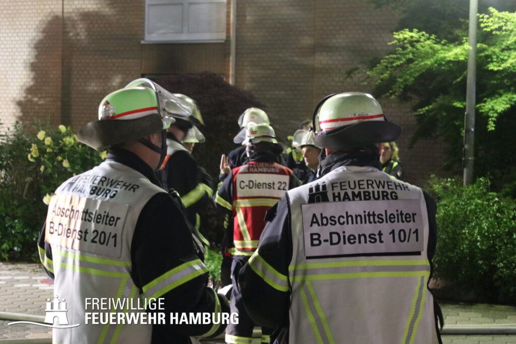 Aufgrund dieser Lage vor Ort erhöhte der Einsatzleiter der Feuerwehr Hamburg das Alarmstichwort auf FEU4MANV25 (Feuer, 4 Löschzüge und Massenanfall von mindestens 25 Verletzten) und forderte weitere Löschzüge sowie eine Vielzahl an Rettungsdienstkräften zur Unterstützung an. Innerhalb von Minuten machten sich diverse Rettungsdienstkräfte und Katastrophenschutzeinheiten der Hilfsorganisationen auf den Weg zur Einsatzstelle.