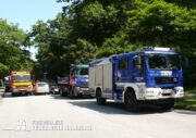 Aus bisher unbekannter Ursache kam es zum Brand eines ebenerdig angelegten Vereinsheims in Holzbauweise mit einer Bedachung aus Blechelementen. Das Gebäude hatte die Ausmaße von ca. 20mx10m und bei Eintreffen schlugen Flammen aus einem Fenster und starker Rauch quoll unter der Dachhaut hervor. Da sich die Anfahrt bis vor das Objekt sowie die Wasserversorgung auf dem hydrantenlosen Gelände als schwierig gestalteten, erhöhte der ersteintreffende Führungsdienst C der Berufsfeuerwehr auf Feuer 2. Somit waren auch bereits zwei Freiwillige Feuerwehren alarmiert.