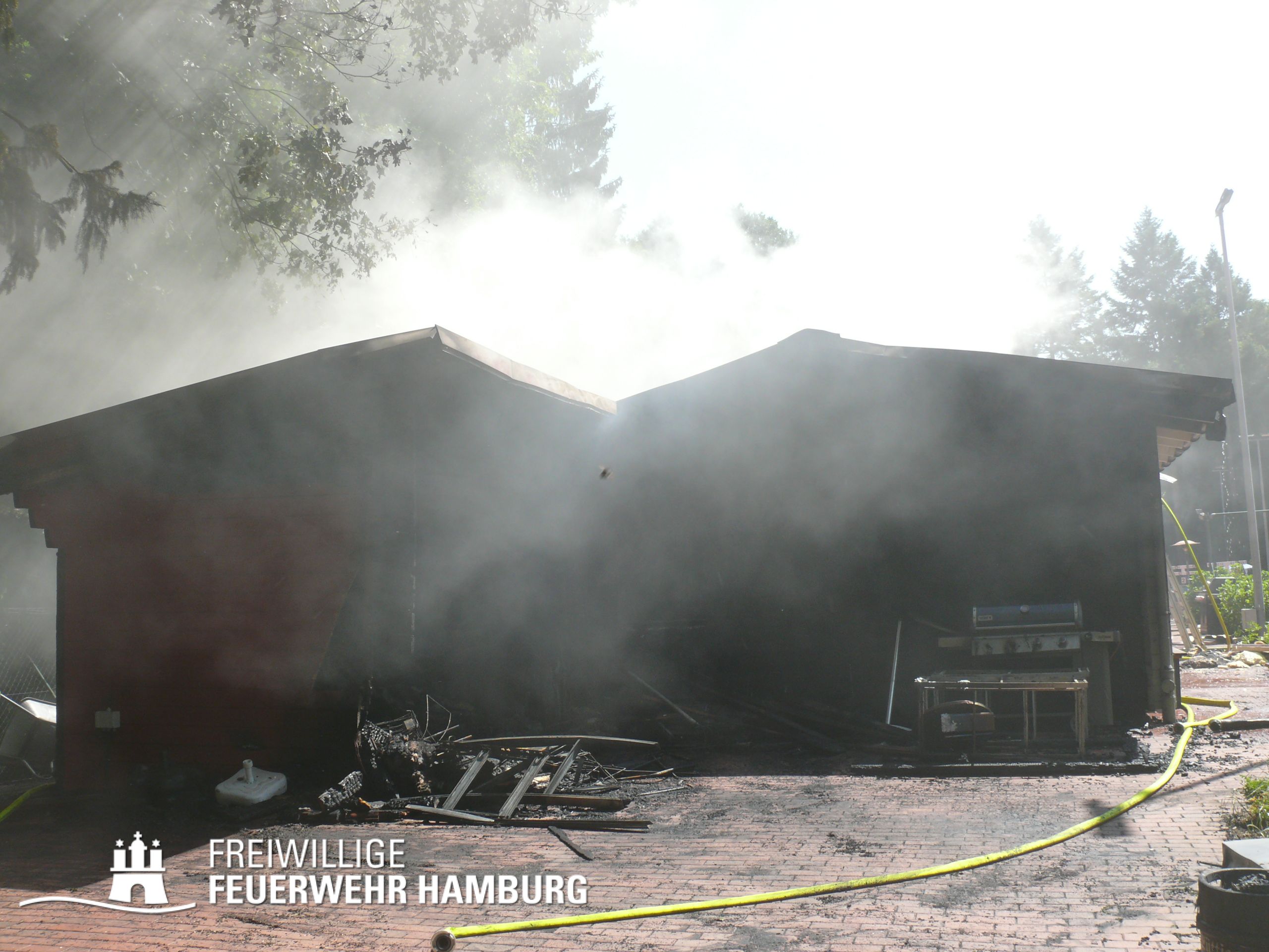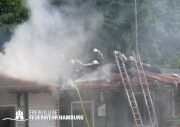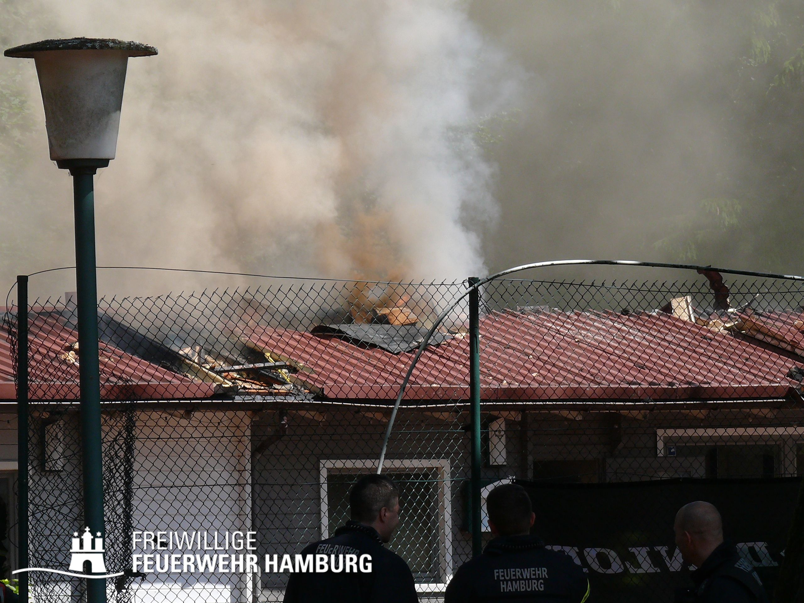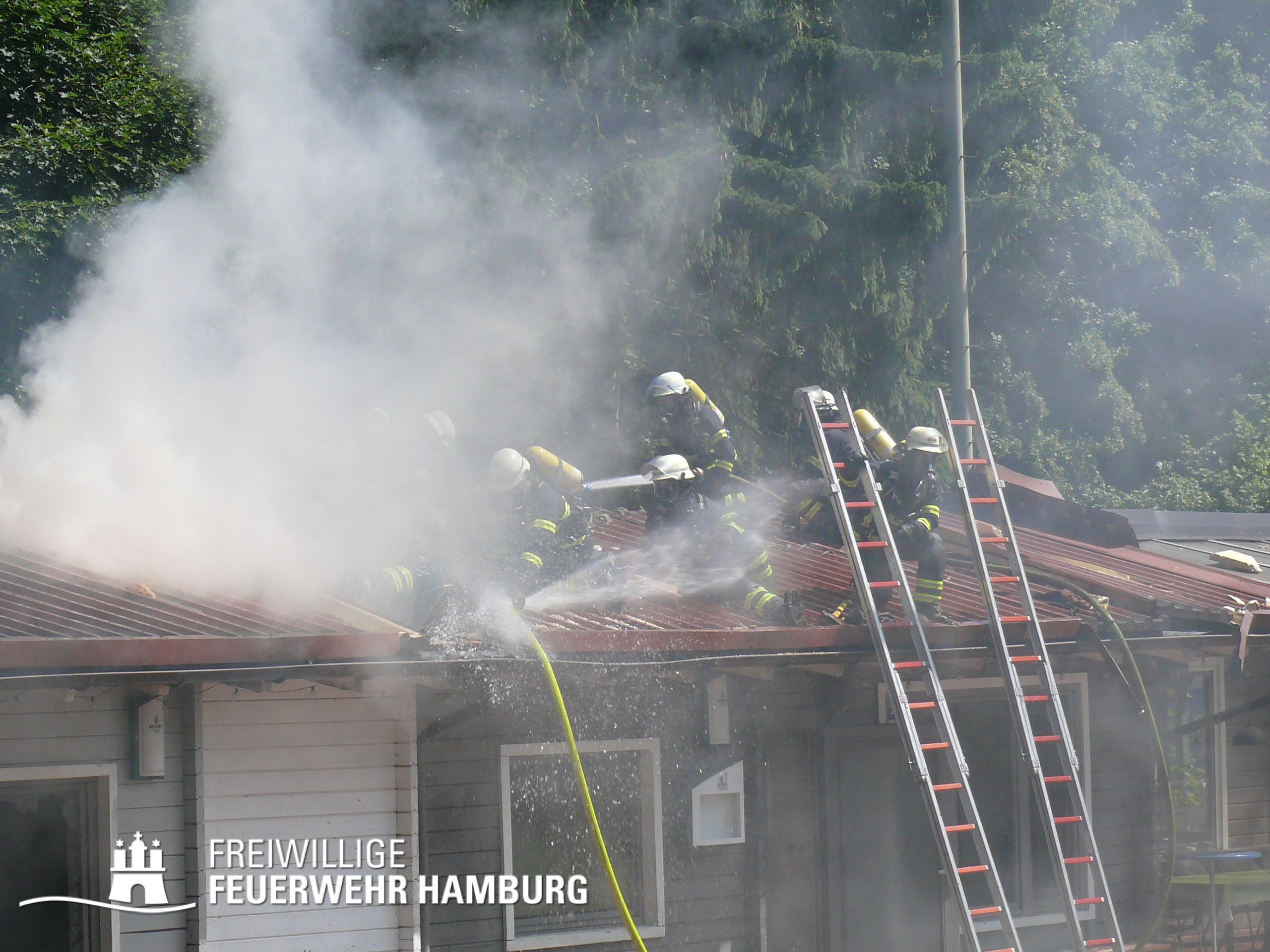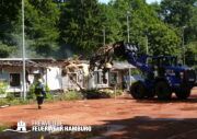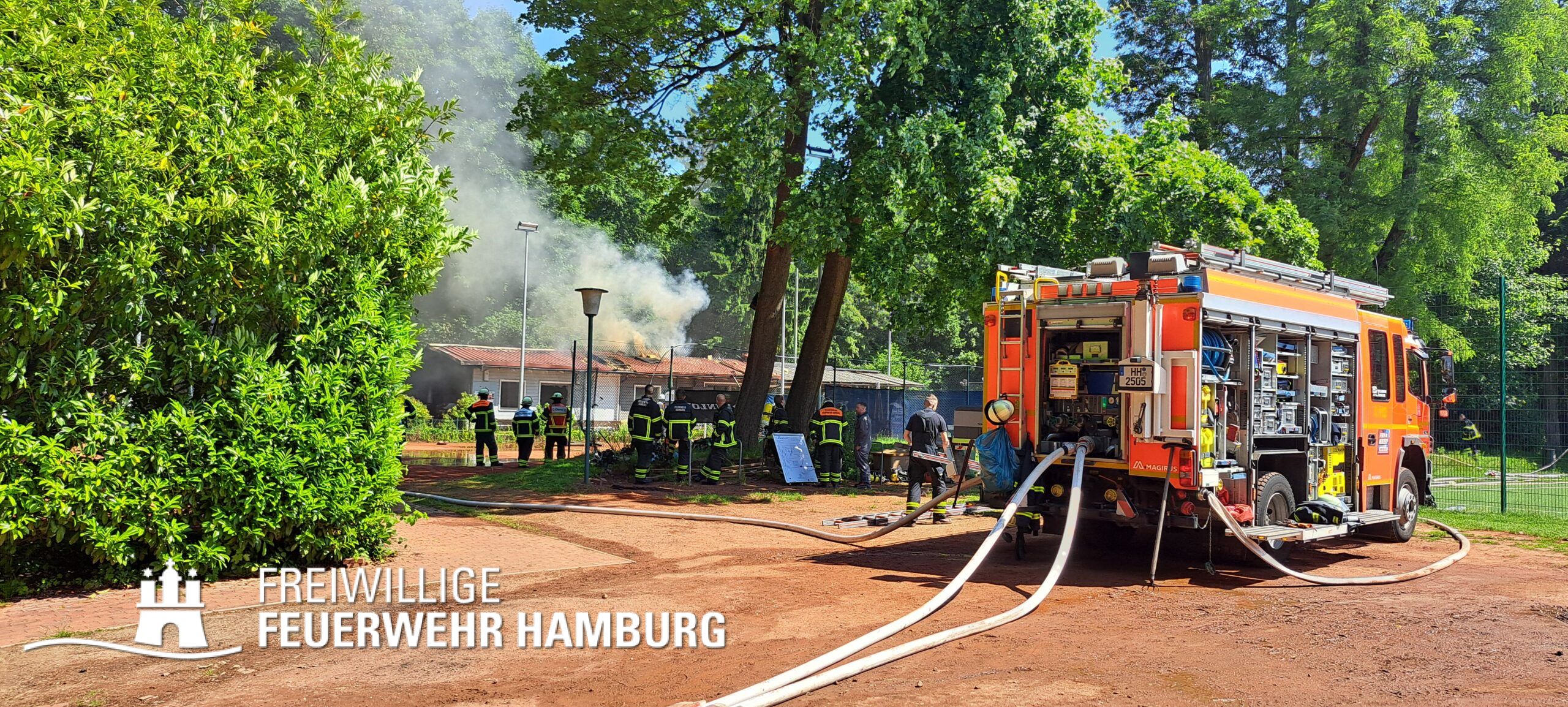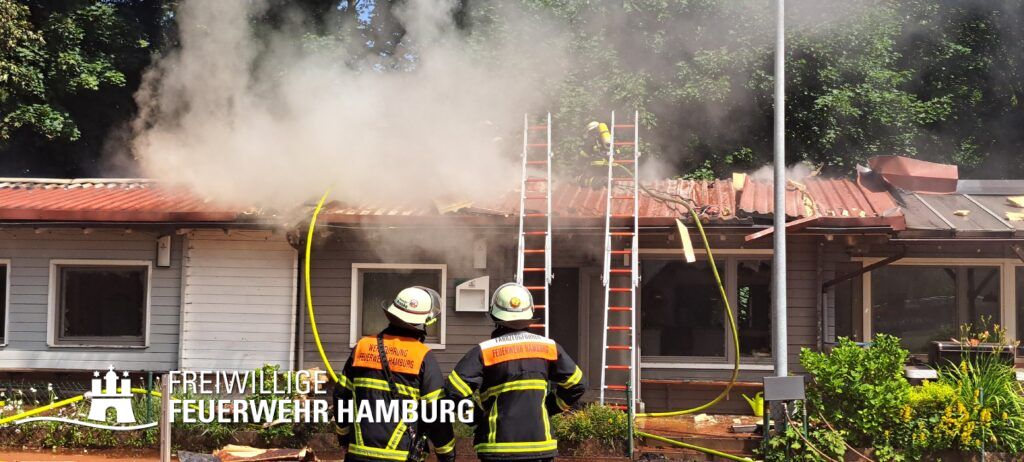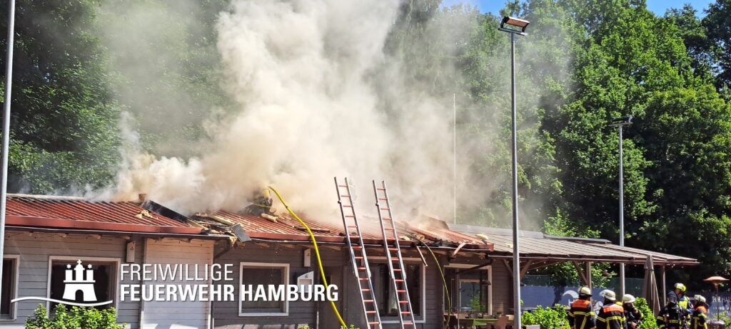 Am Morgen des 12.06.25 meldeten Anrufende zuerst ein vermeintliches Kleinfeuer, was sich nach weiteren Anrufen als Brand eines Vereinsheim im Hamburger Süden entpuppte. Nach Eintreffen wurde auf Feuer 2. Alarm (FEU2) erhöht. Zusätzlich zu den initial alarmierten Freiwilligen Feuerwehren musste wegen der Bauweise ders Gebäudes im Laufe des Einsatzes umfassend nachalarmiert werden.