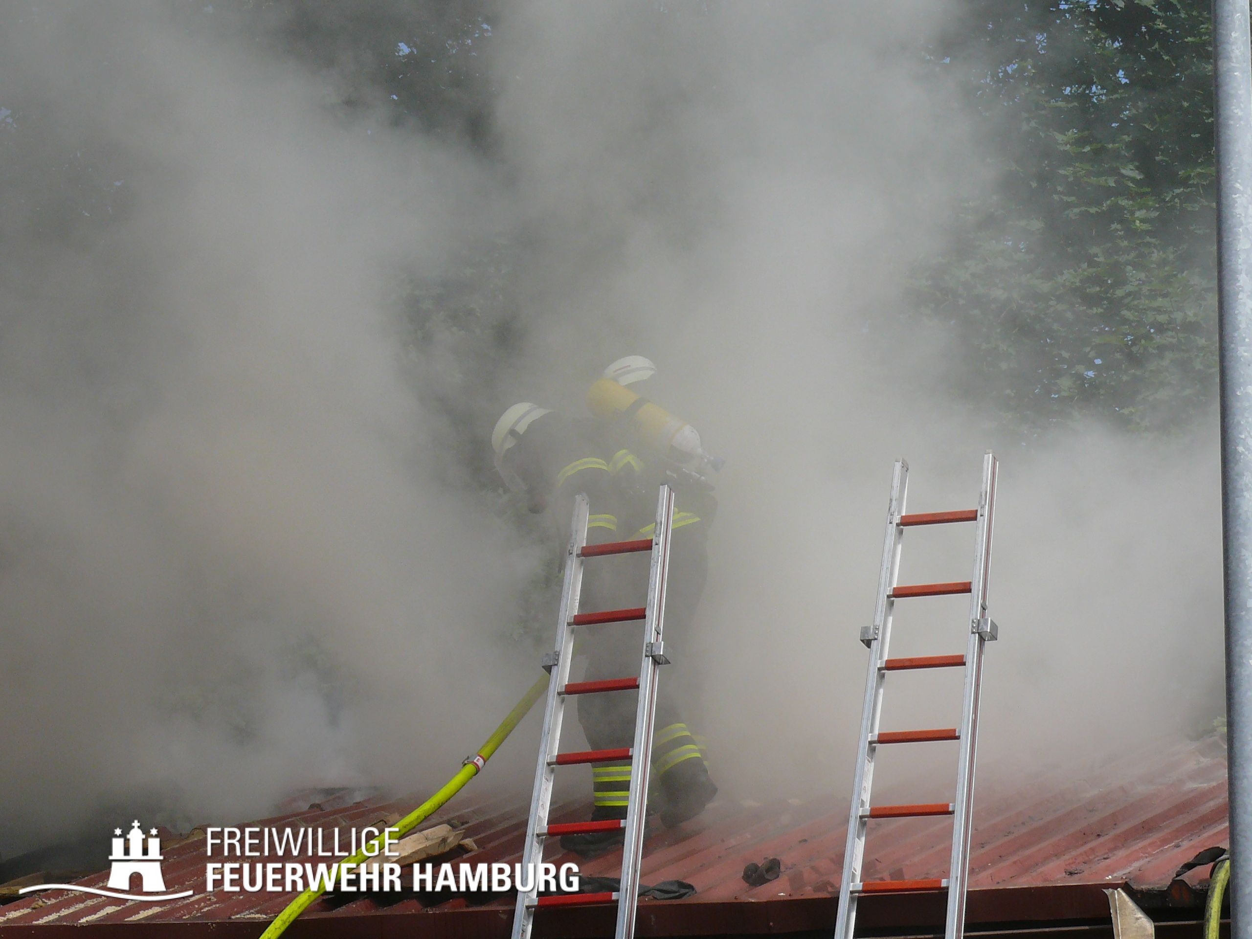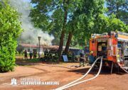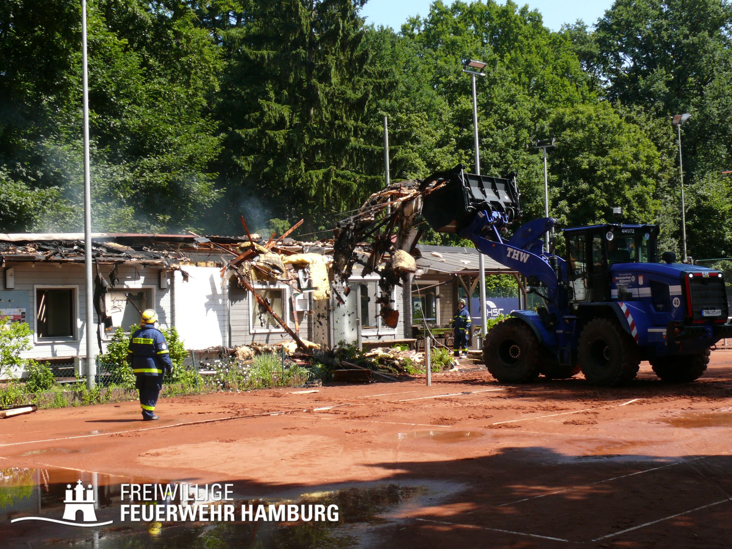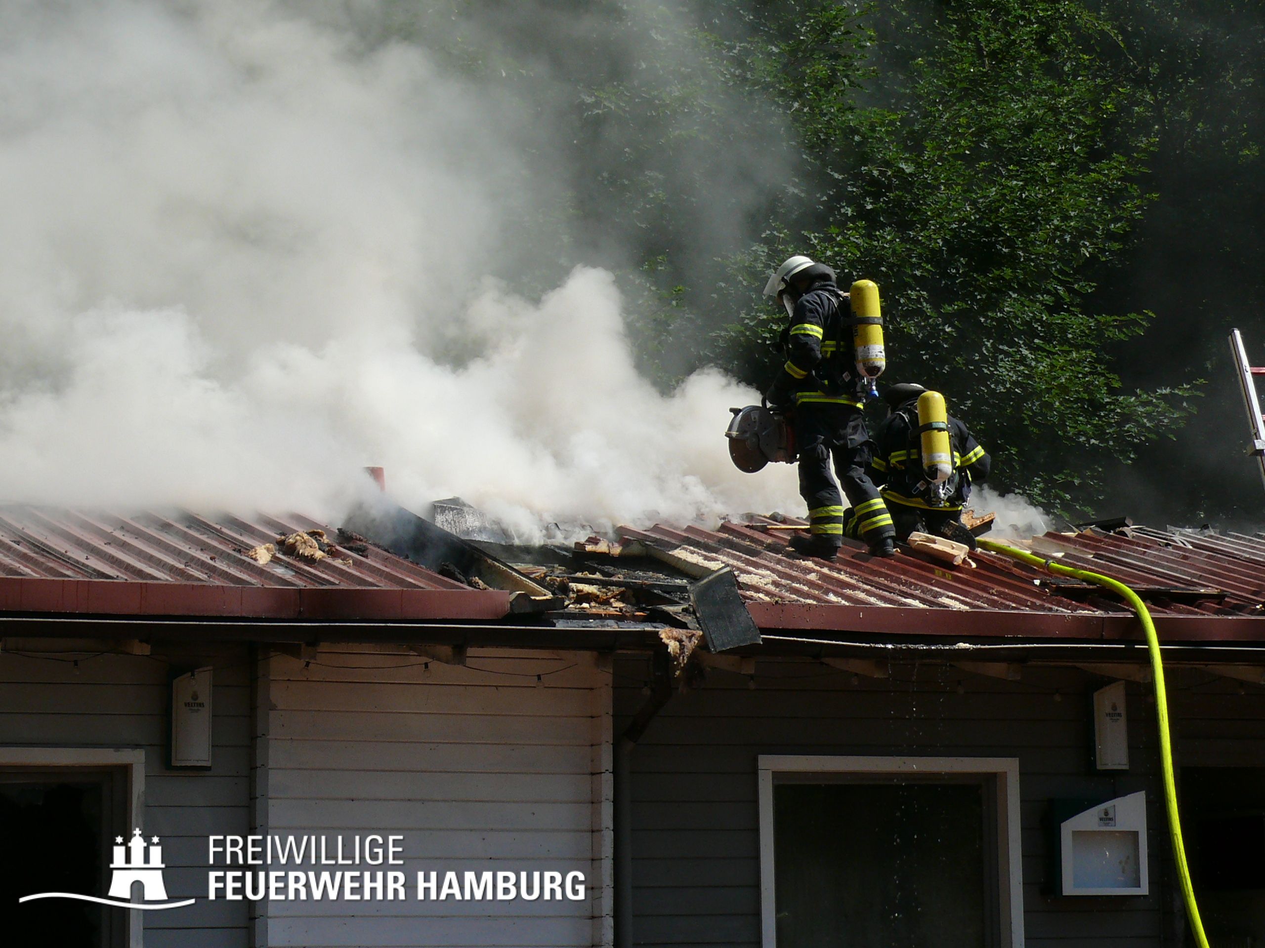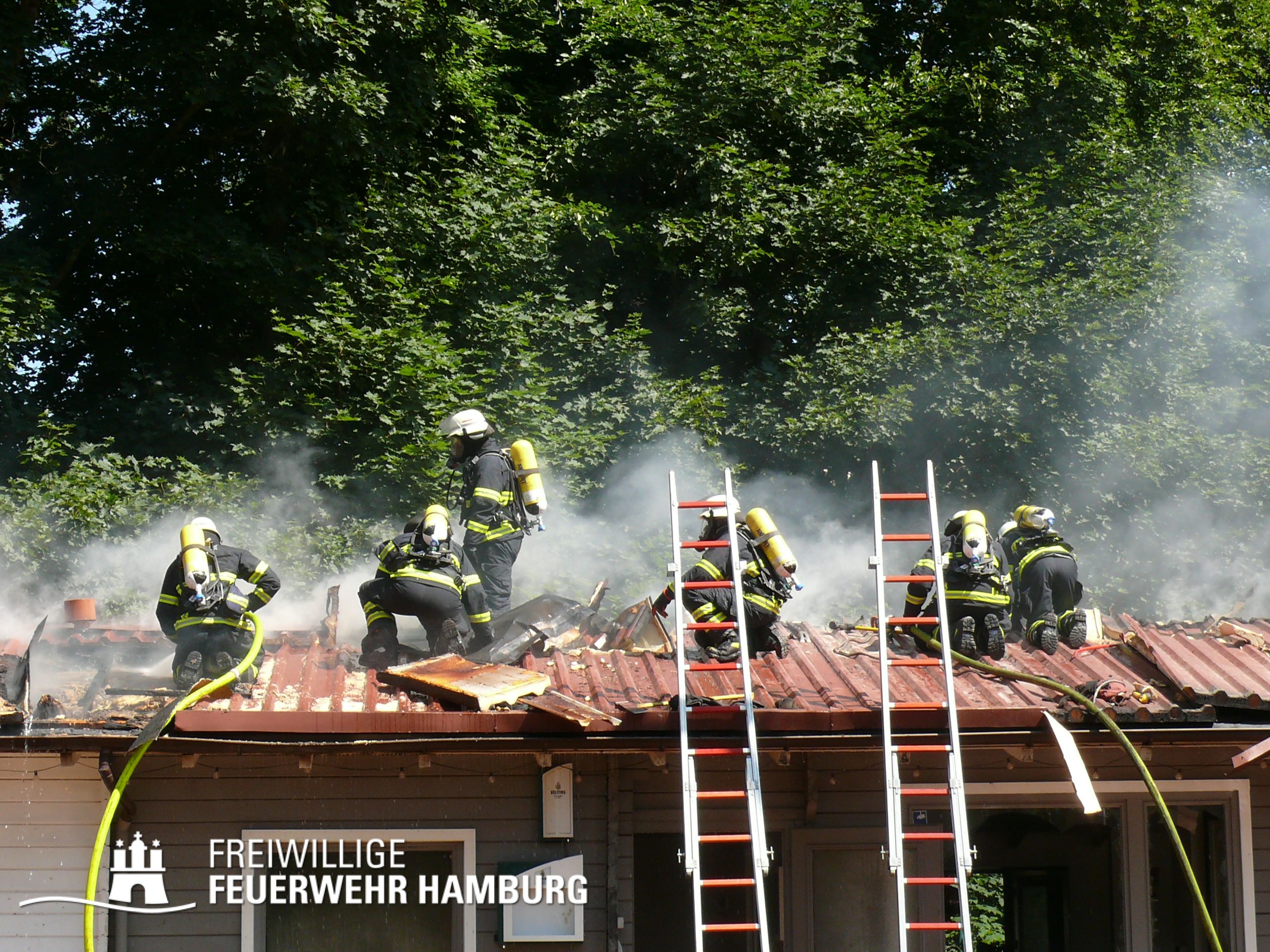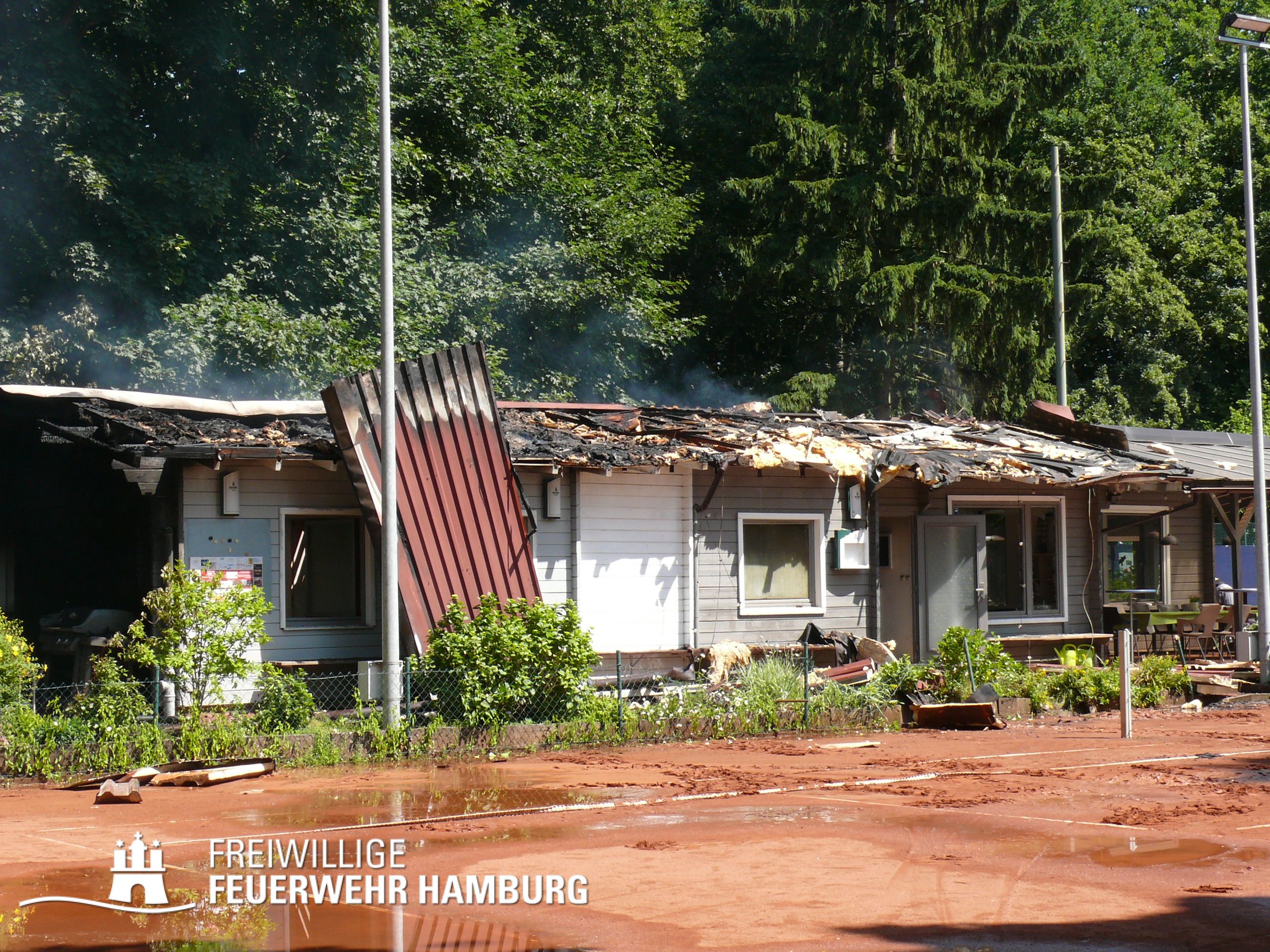 Am Morgen des 12.06.25 meldeten Anrufende zuerst ein vermeintliches Kleinfeuer, was sich nach weiteren Anrufen als Brand eines Vereinsheim im Hamburger Süden entpuppte. Nach Eintreffen wurde auf Feuer 2. Alarm (FEU2) erhöht. Zusätzlich zu den initial alarmierten Freiwilligen Feuerwehren musste wegen der Bauweise ders Gebäudes im Laufe des Einsatzes umfassend nachalarmiert werden.