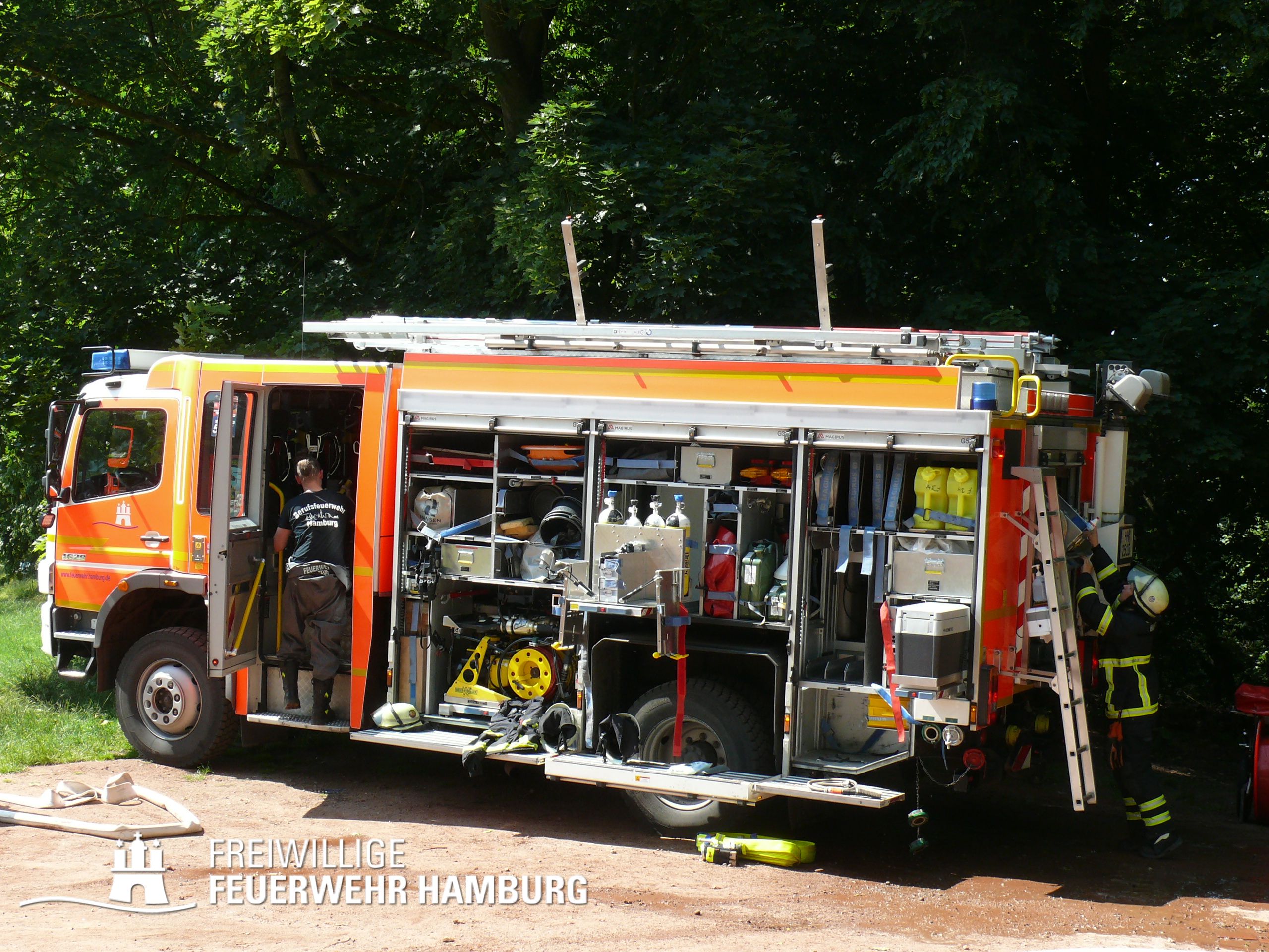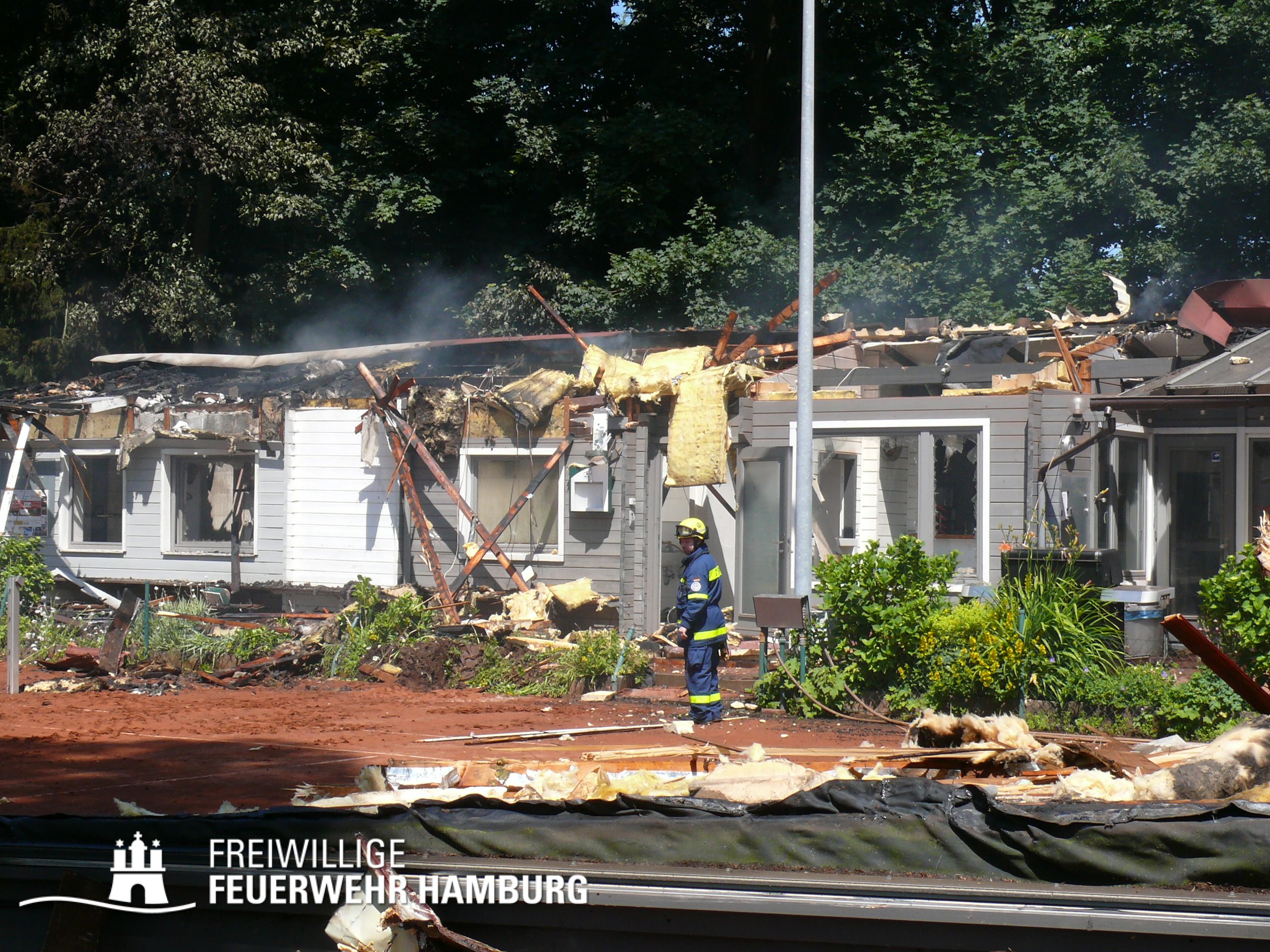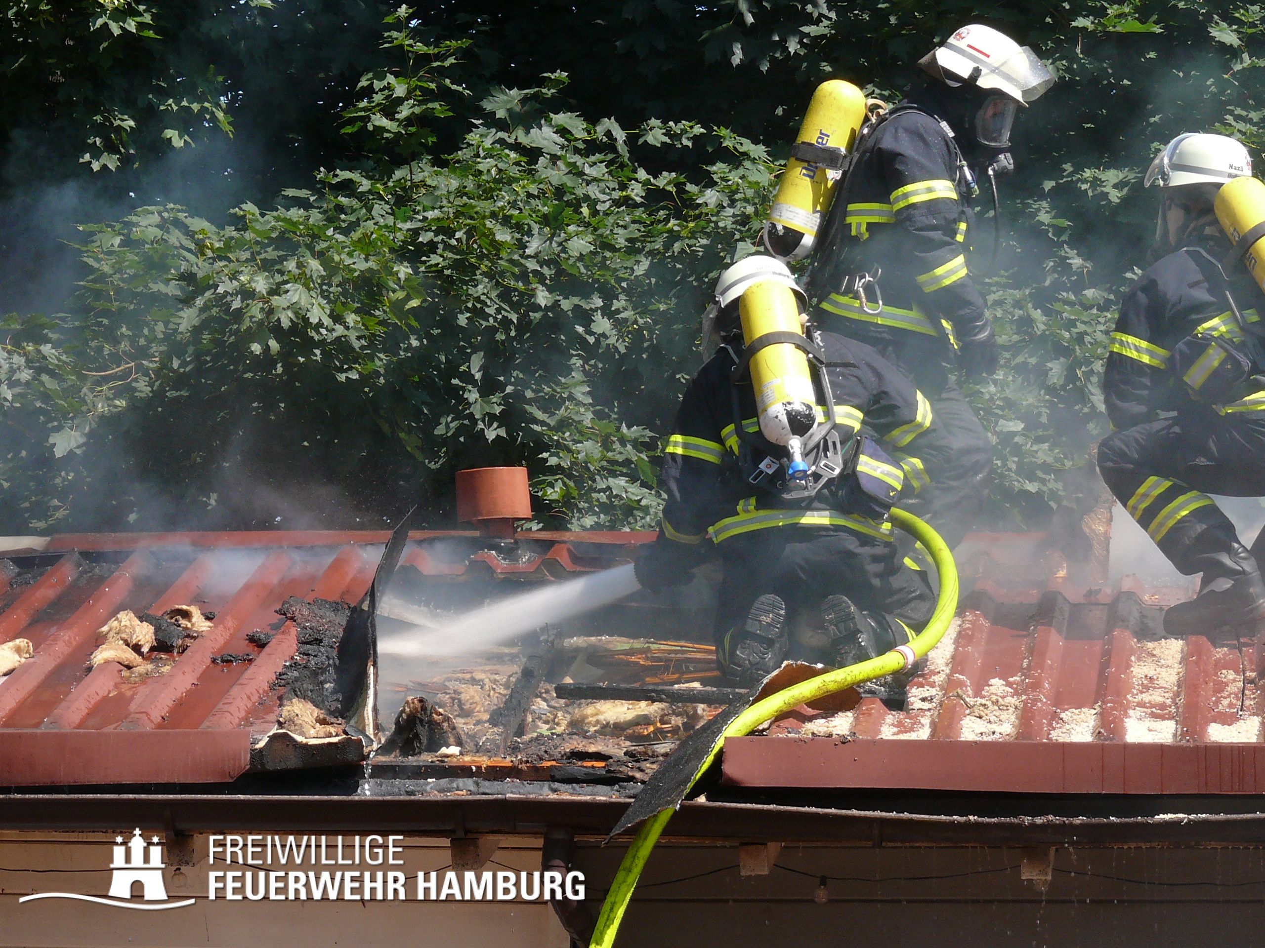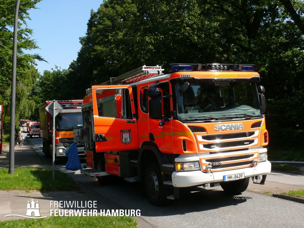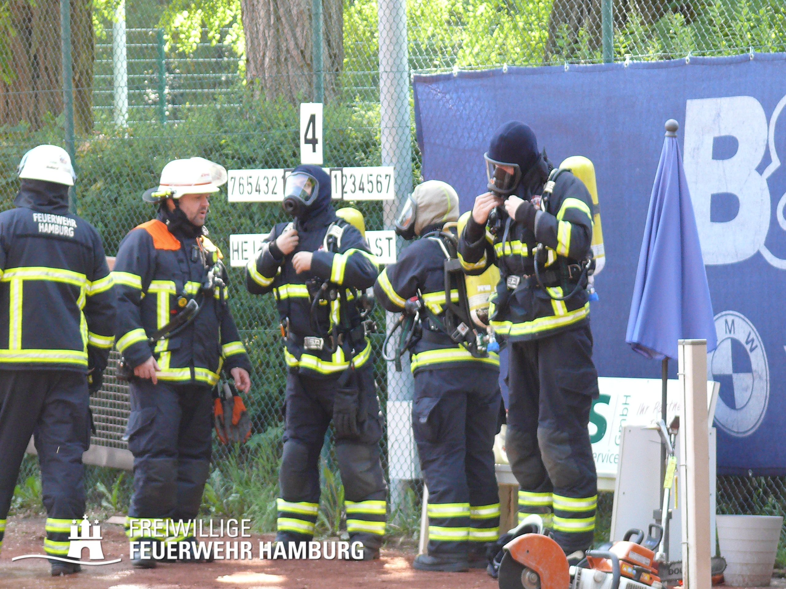 Am Morgen des 12.06.25 meldeten Anrufende zuerst ein vermeintliches Kleinfeuer, was sich nach weiteren Anrufen als Brand eines Vereinsheim im Hamburger Süden entpuppte. Nach Eintreffen wurde auf Feuer 2. Alarm (FEU2) erhöht. Zusätzlich zu den initial alarmierten Freiwilligen Feuerwehren musste wegen der Bauweise ders Gebäudes im Laufe des Einsatzes umfassend nachalarmiert werden.