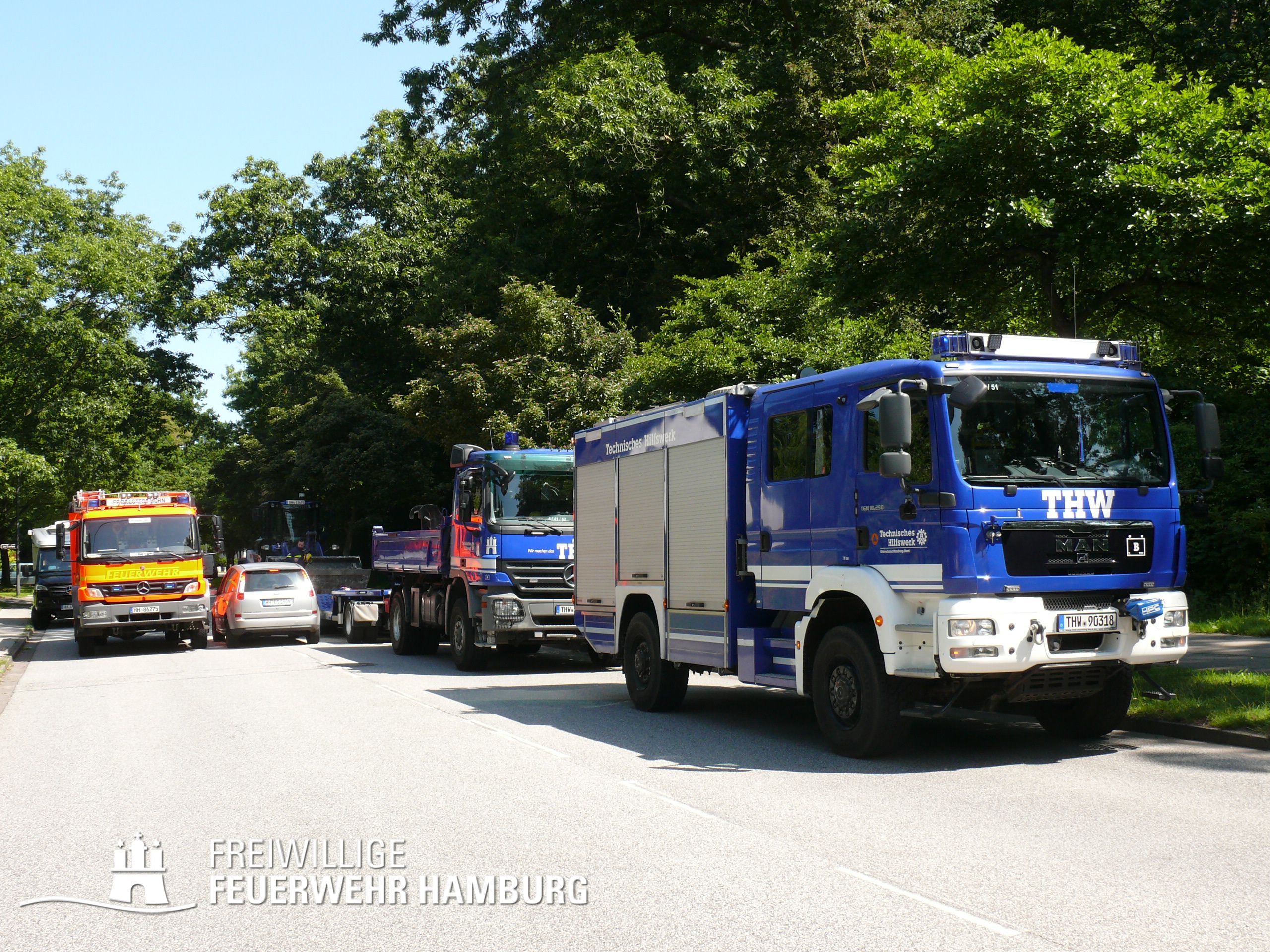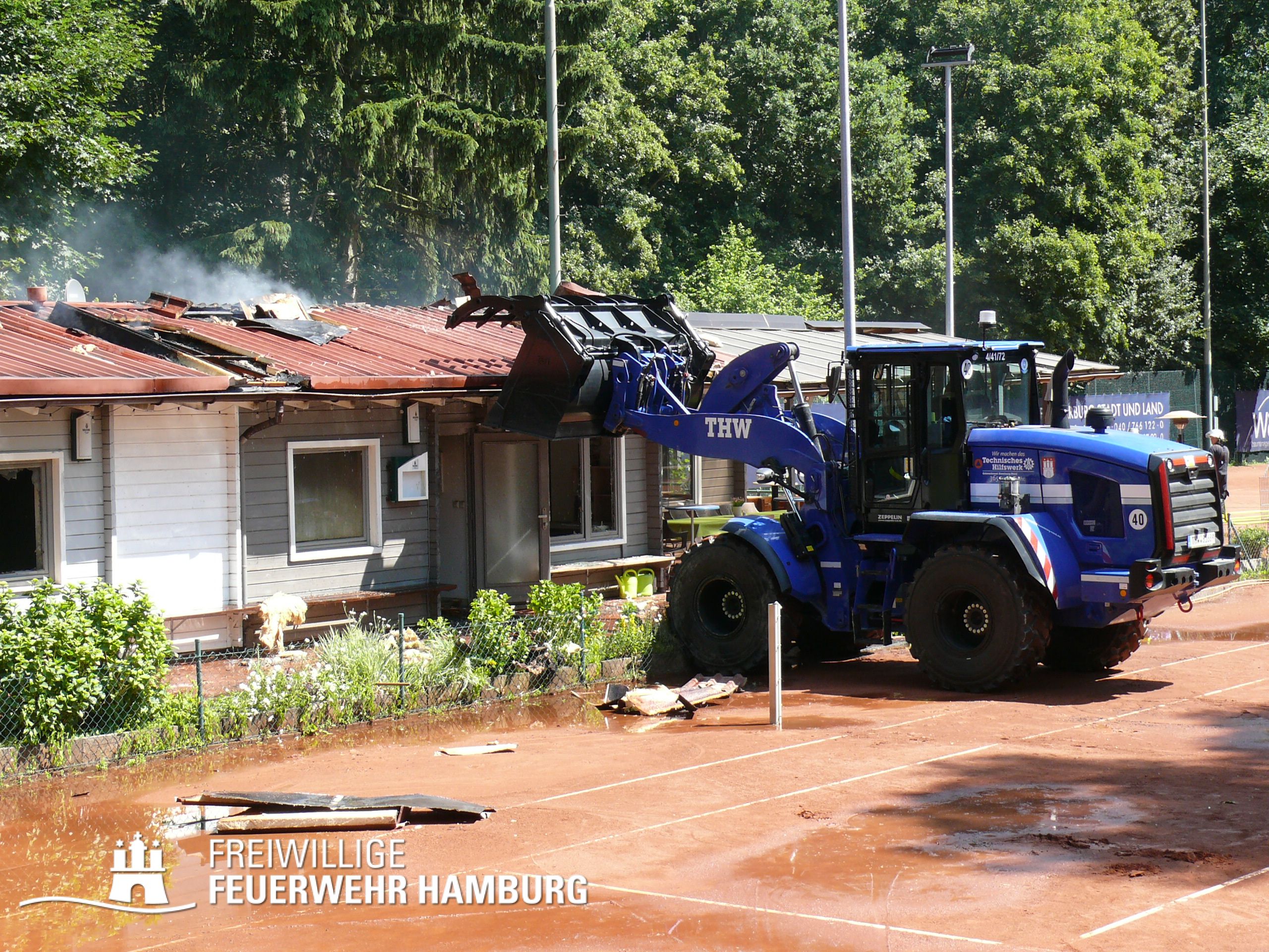 Im Verlauf der Brandbekämpfung stellte sich heraus, dass der Cobra-Einsatz nicht zielführend war, weiter massiv Rauch aus dem Dach drang und man die Brandherde nicht erreichen konnte. Da nun die Bedachung aufgenommen werden sollte, kamen der Führungsdienst des Technischen Hilfswerks (THW) Hamburg und die Räumgruppe des Ortsverband Hamburg-Nord mit dem Radlader zum Einsatz.