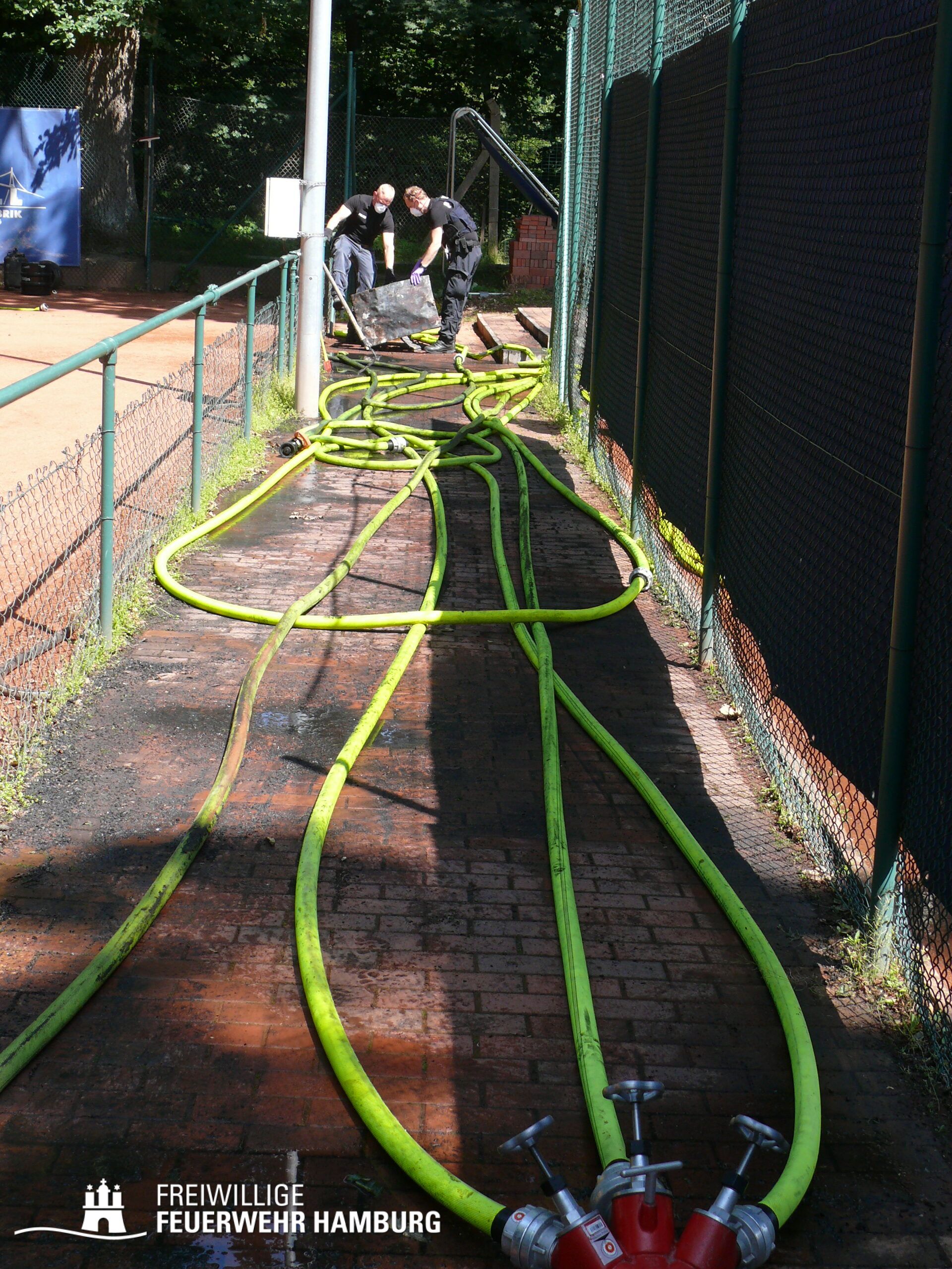 Schließlich konnte nach Entnahme großflächiger Dachelemente der Brand vollständig unter Einsatz von mehreren C-Rohren gelöscht werden. Es wurden fast alle Geräte eines der Abrollbehälter Atemschutz der Berufsfeuerwehr genutzt. Nach ca. 5 Std. wurde mit den Nachlöscharbeiten begonnen. Aufgrund der Verschmutzung des Schlauchmaterials mit rotem Ziegelmehl der umgebenden Tennisplätze war noch eine längere Tausch- und Abrüstzeit erforderlich.