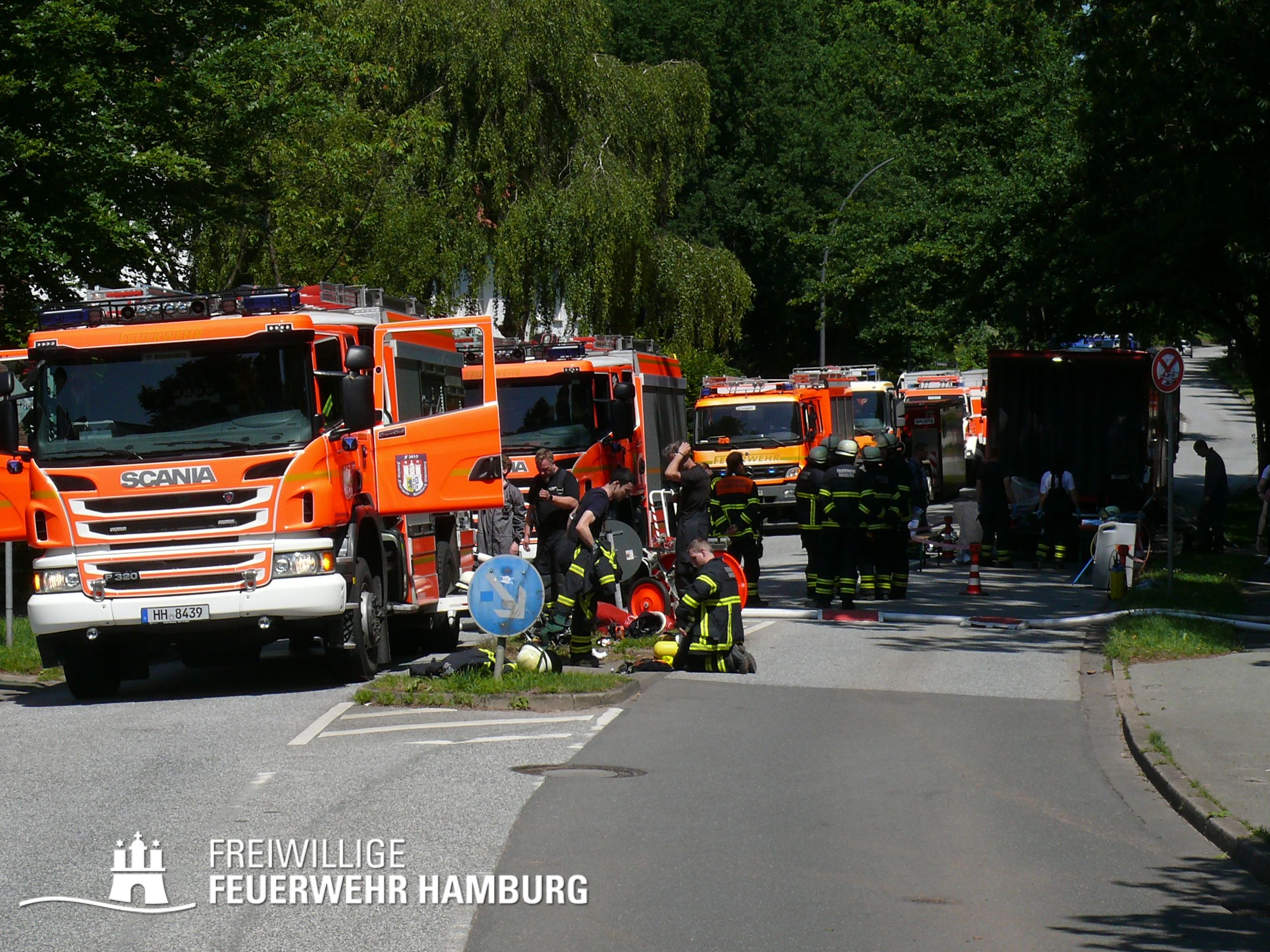 Die FFen Wilhelmsburg und Billstedt-Horn waren den Zügen der Berufsfeuerwehr zugeordnet. Die FF Fünfhausen wurde mit dem Schlauchwagen (SW-KatS) zur Wasserversogung in Bereitstellung gehalten, ebenso die FF Warwisch als Technischer Zug für den Cobra-Einsatz. Die FFen Rönneburg und Neugraben wurden alarmiert, die FF Moorburg danach zur Verstärkung der Atemschutzgeräteträger. Die FF-Einheiten wurden z.B. zum Aufbau der Wasserversorgung, Stellung von Sicherheitstrupps für den Atemschutzeinsatz und als Atemschutzgeräteträger bei der Brandbekämpfung eingesetzt. Es konnte immer nur eine begrenzte Anzahl Kräfte auf dem Dach arbeiten.
