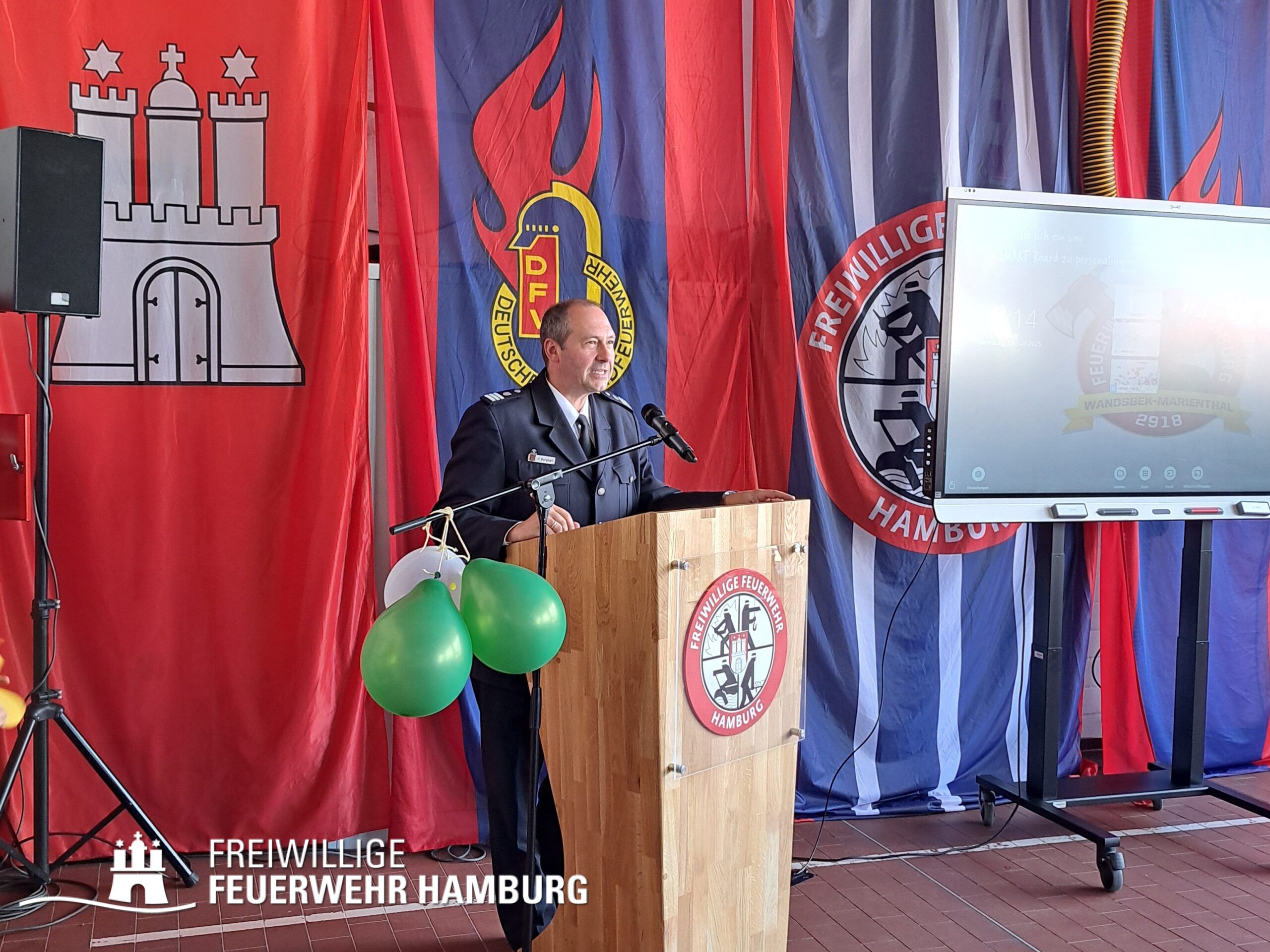Nach der Begrüßung durch den Wehrführer Fabian Krull-Funk überbrachte der Landesbereichsführer Harald Burghart die Glückwünsche der FF Hamburg. Weitere Grußworte folgten vom Bereichsführer Wandsbek Sebastian Bierdel und den Gästen. Auch der abschließende umfangreiche chronologische Rückblick der Wehr, präsentiert durch den Hauptbrandmeister Thomas Menschel, war sehr interessant.