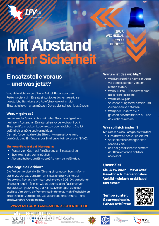 Der Landesfeuerwehrverband Schleswig-Holstein setzt sich gemeinsam mit zahlreichen Partnerorganisationen dafür ein, dass das Verhalten von Verkehrsteilnehmenden beim Annähern an Einsatzstellen künftig gesetzlich klar geregelt wird.