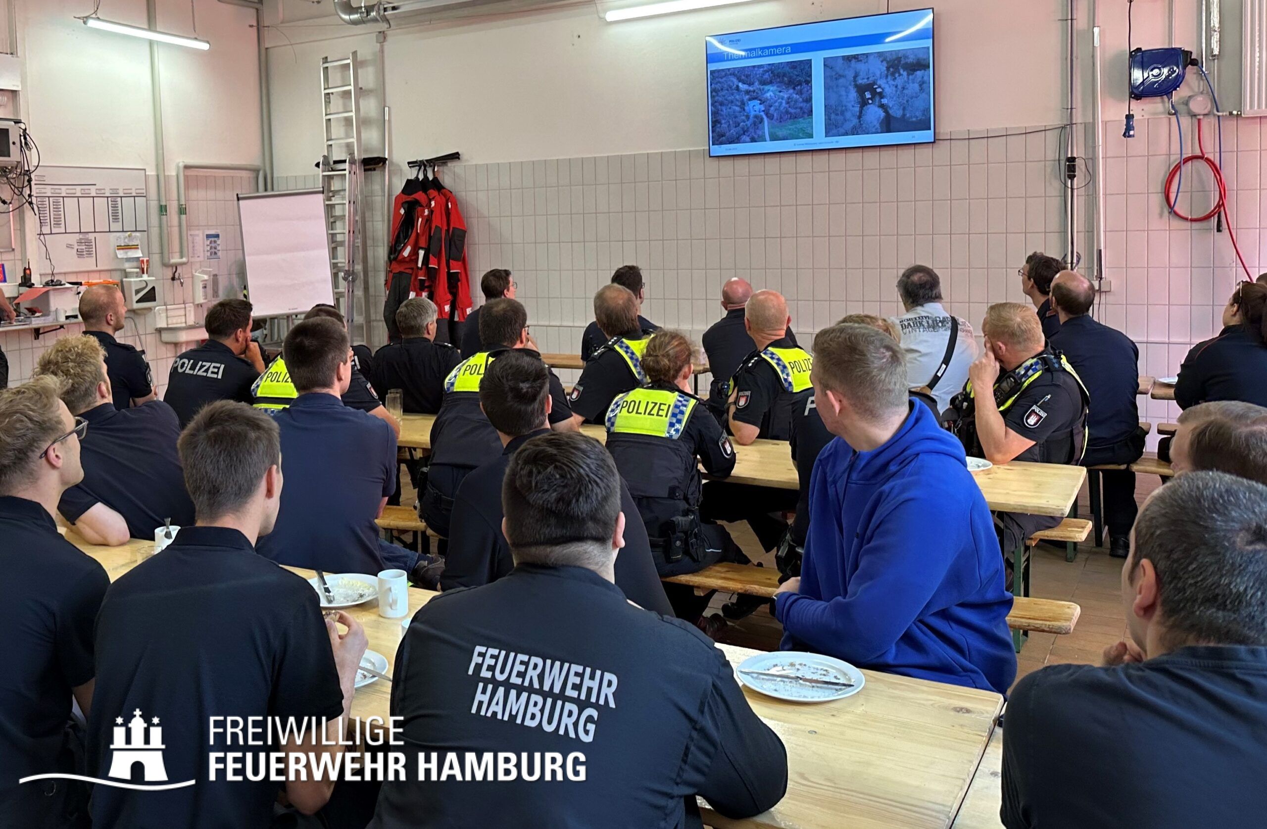 Der Drohnentag begann mit einem gemeinsamen Frühstück, das gezielt zur Förderung der Zusammenarbeit und des persönlichen Austauschs zwischen der Freiwilligen Feuerwehr und Polizei genutzt wurde. Daran schloss sich ein theoretischer Teil zu den rechtlichen Rahmenbedingungen für Drohneneinsätze an.