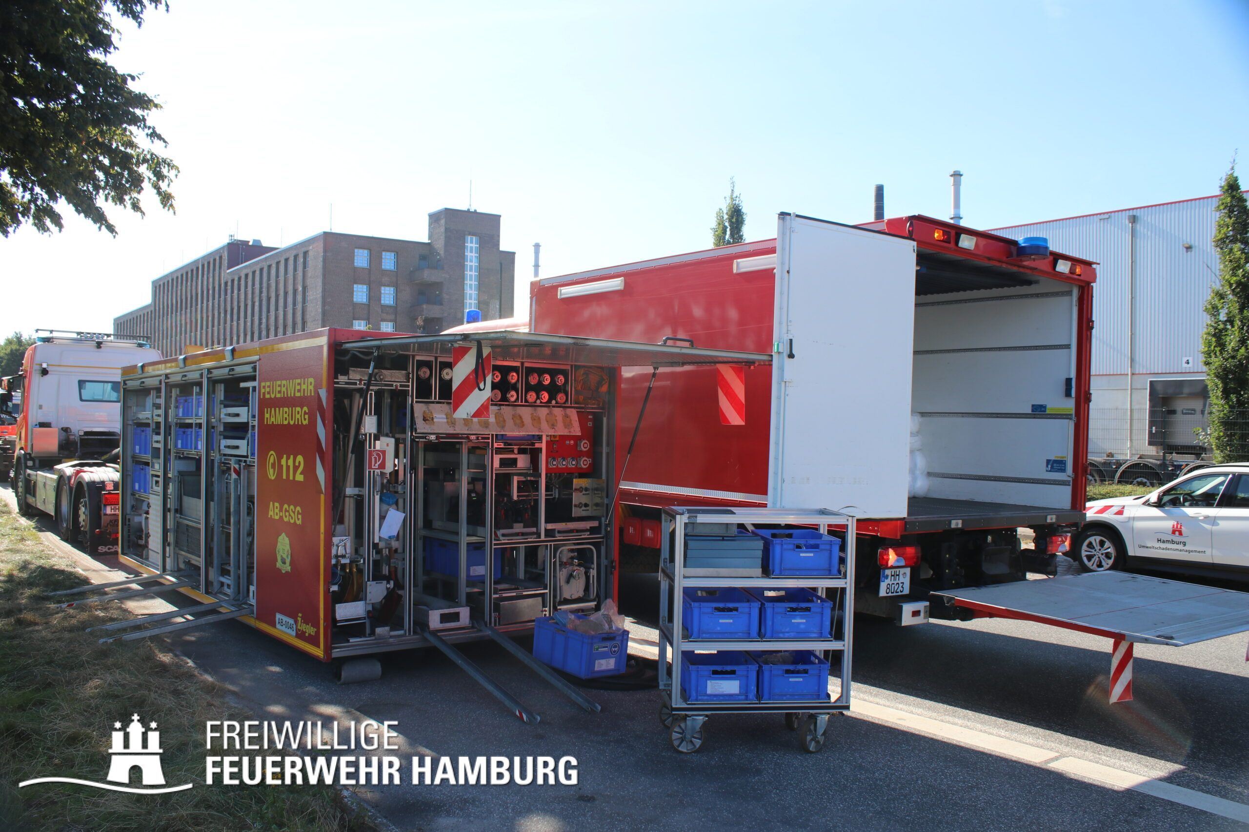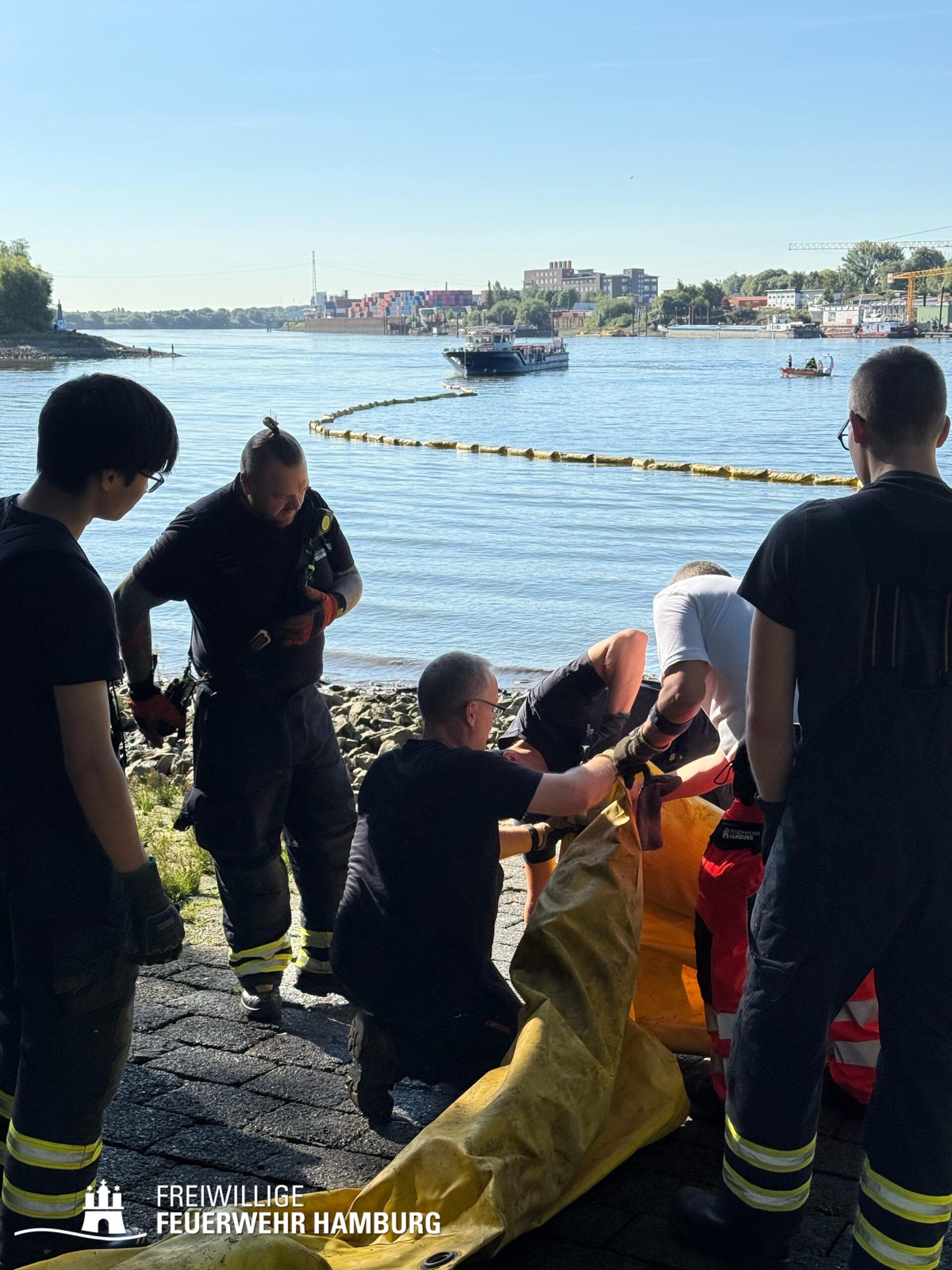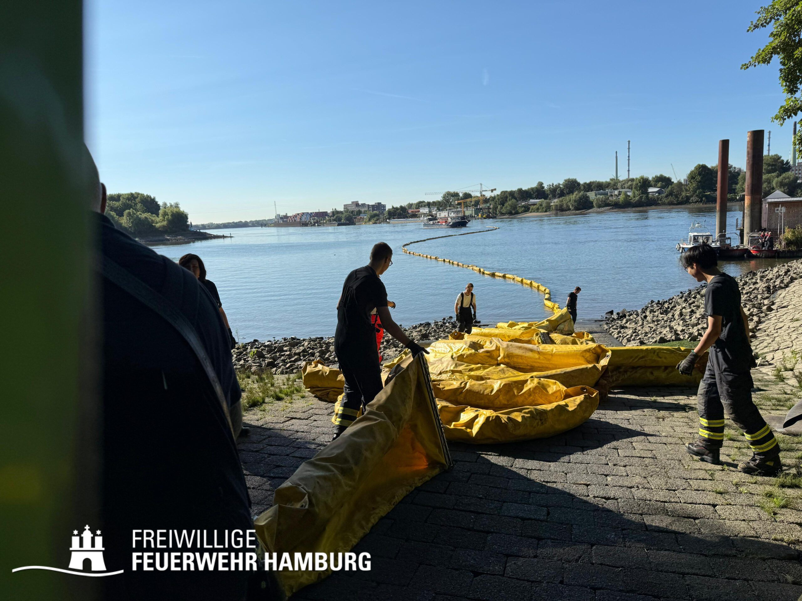 Die FF Billstedt-Horn sowie FF Moorburg unterstützten beim in Stellung bringen der Ölschlengel vom Land aus. Über die Kleinboote wurden diese dann in die Norderelbe gebracht und konnten so in den Peutehafen gezogen werden. Die FF Eissendorf stellte mit ihrem GW-Versorgung Getränke und Snacks für alle Einsatzkräfte zur Verfügung.