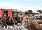 Durch die Explosionen wurden mehrere Einsatzfahrzeuge der Feuerwehr beschädigt, darunter eine Drehleiter, bei der Trümmer das Dach durchschlugen. Glücklicherweise wurde niemand verletzt.