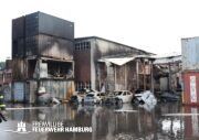 Das Dach der Lagerhalle stürzte bereits vor Mitternacht infolge des Vollbrands ein. Im angrenzenden Containerlager kam es immer wieder zu Explosionen von Druckgasflaschen.