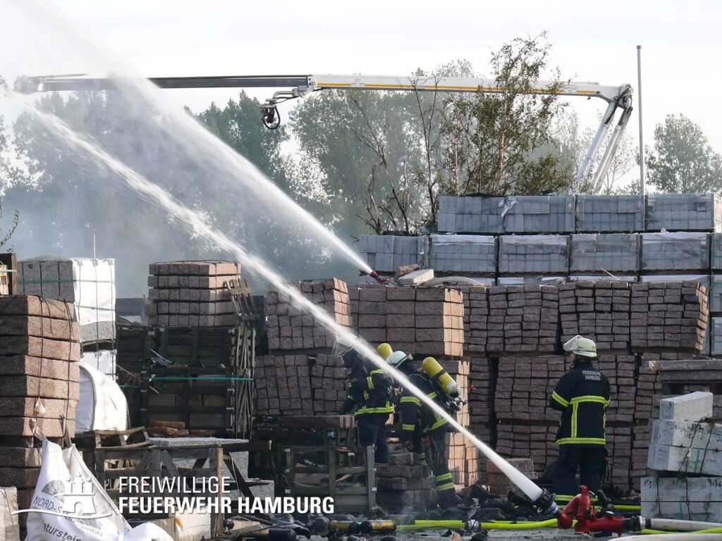 Die Feuerwehr konzentrierte sich zunächst auf die Brandbekämpfung in den umliegenden Bereichen, während eine direkte Löschung im Zentrum aufgrund der anhaltenden Explosionen über zweieinhalb Stunden lang nicht möglich war. Mit Hilfe von Flugfeldlöschfahrzeugen der Flughafenfeuerwehr Hamburg, mobilen Wasserwerfern der Werkfeuerwehr Aurubis und Polizei-Wasserwerfern konnte die Brandbekämpfung langsam ausgeweitet werden. Der große Wasserbedarf stellte jedoch eine weitere Herausforderung dar, sodass große Wassermengen über lange Schlauchleitungen und das Löschboot „Prag“ an die Einsatzstelle gepumpt werden mussten.