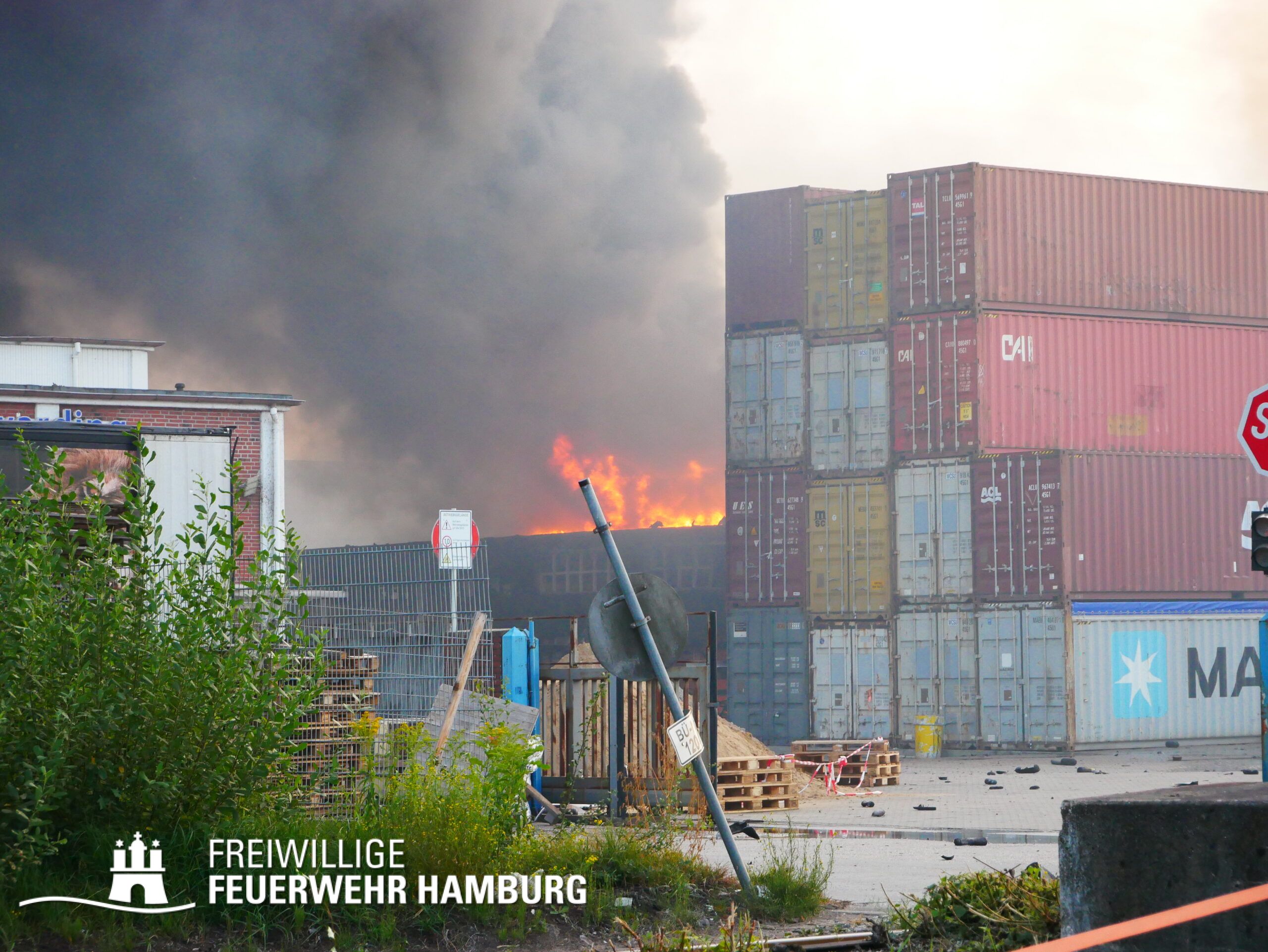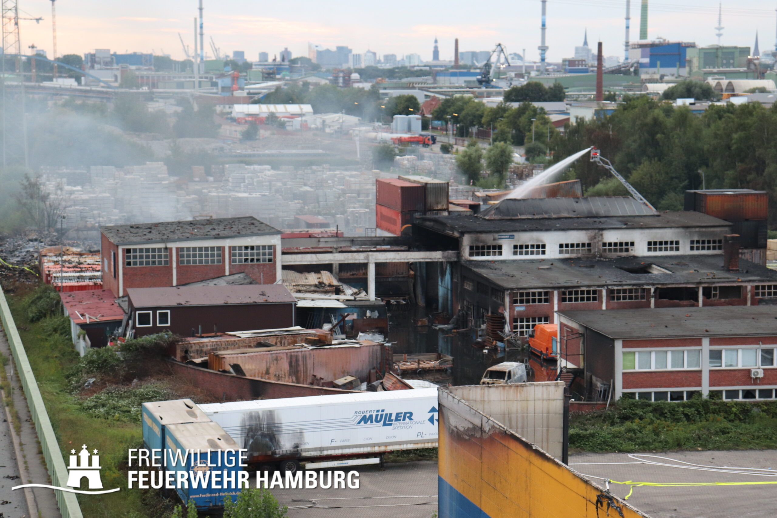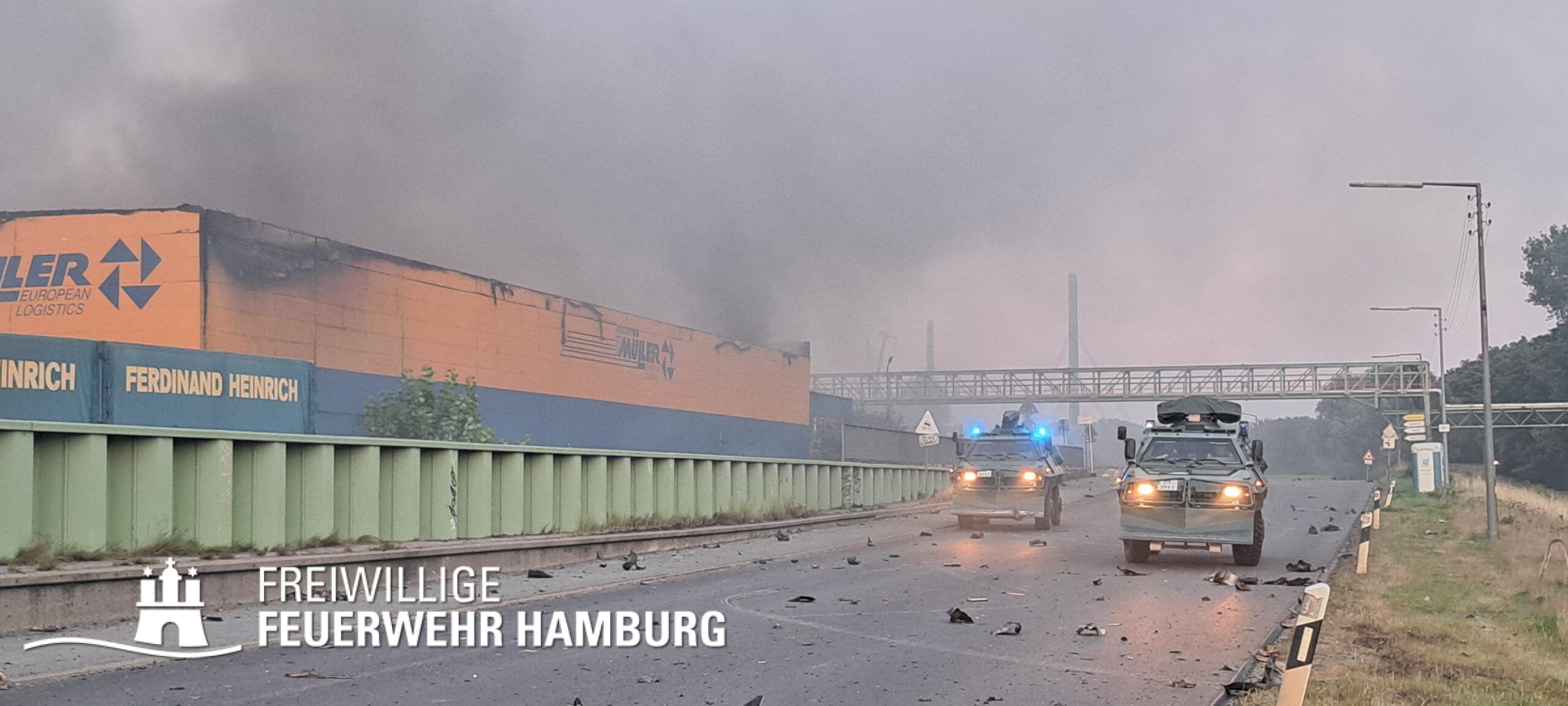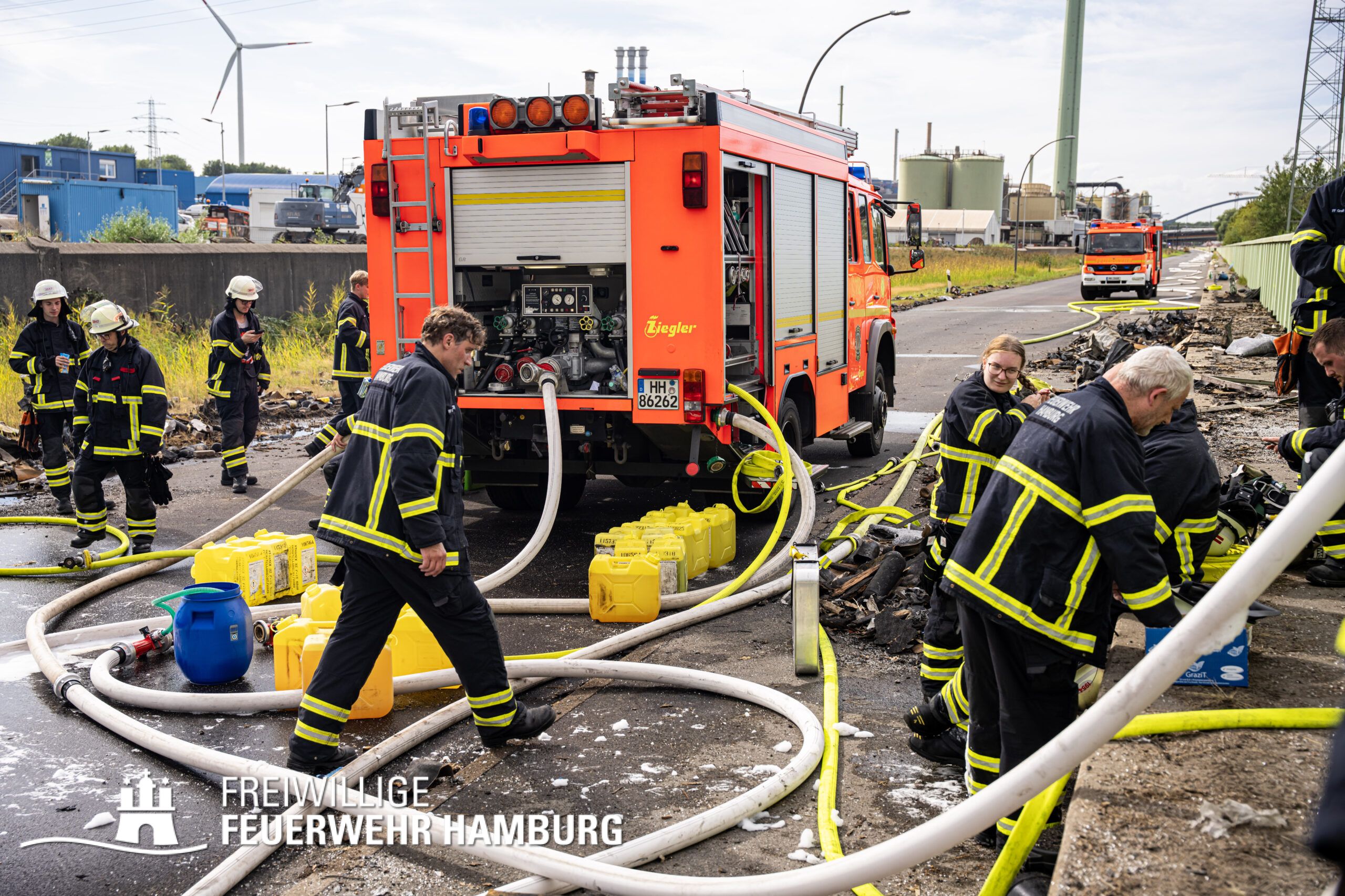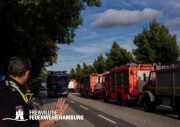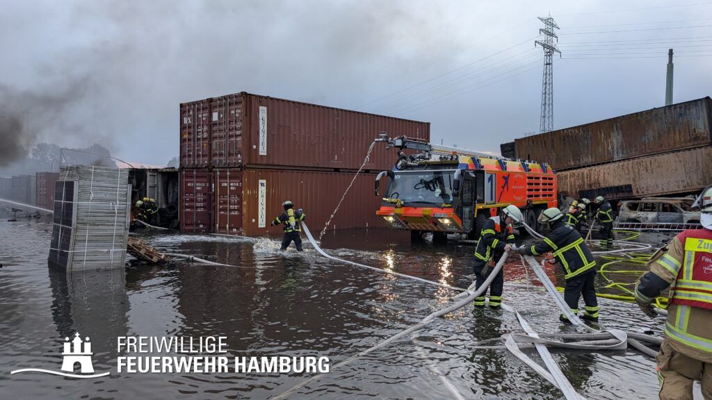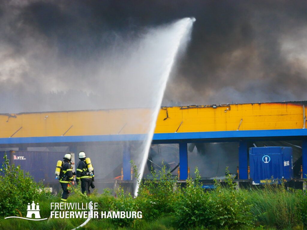 Am Montagnachmittag den 25.08.2025 erhielt die Rettungsleitstelle der Feuerwehr Hamburg eine Meldung über ein brennendes Fahrzeug in einer Lagerhalle in der Müggenburger Straße, Hamburg-Veddel. Als die ersten Einsatzkräfte eintrafen, kam es bereits zu mehreren Explosionen von Druckgasbehältern in der Halle. Die Explosions- und Brandintensität war so hoch, dass der Einsatzleiter nach einer ersten Evakuierung und Rettung von Personen entschied, die Kräfte sofort zurückzuziehen. Aufgrund der enormen Gefahr für die Feuerwehrleute war eine direkte Brandbekämpfung zu diesem Zeitpunkt nicht mehr möglich.