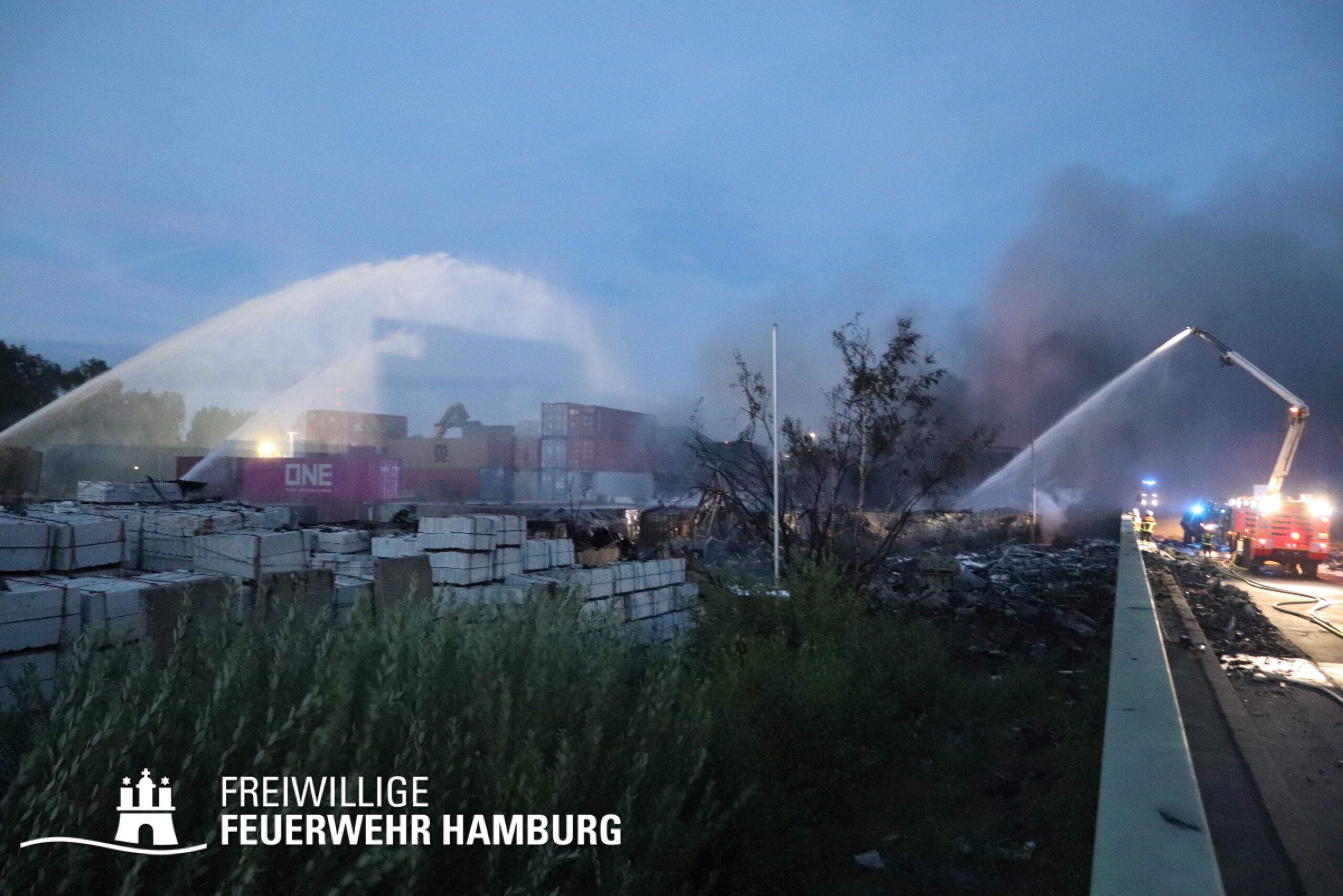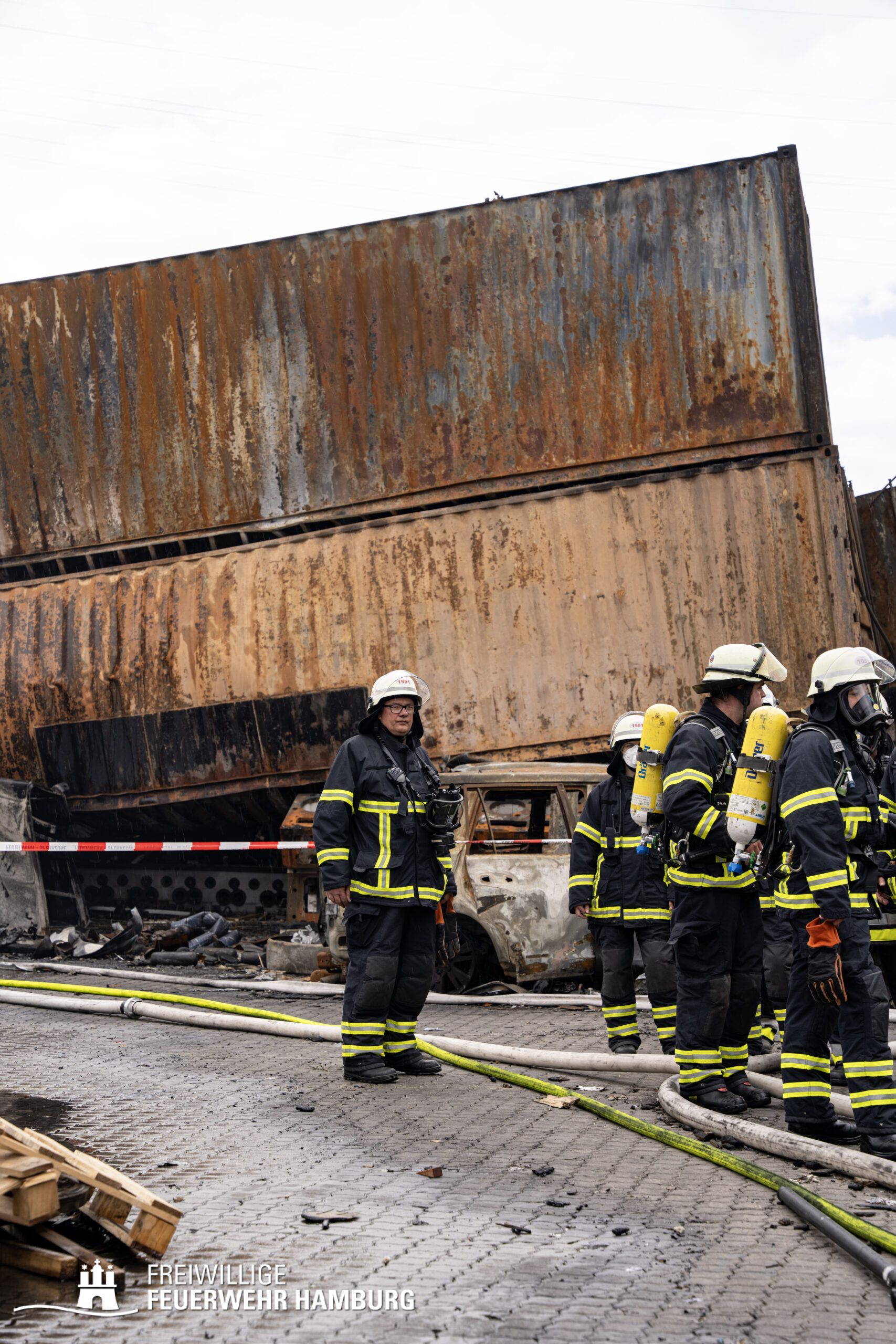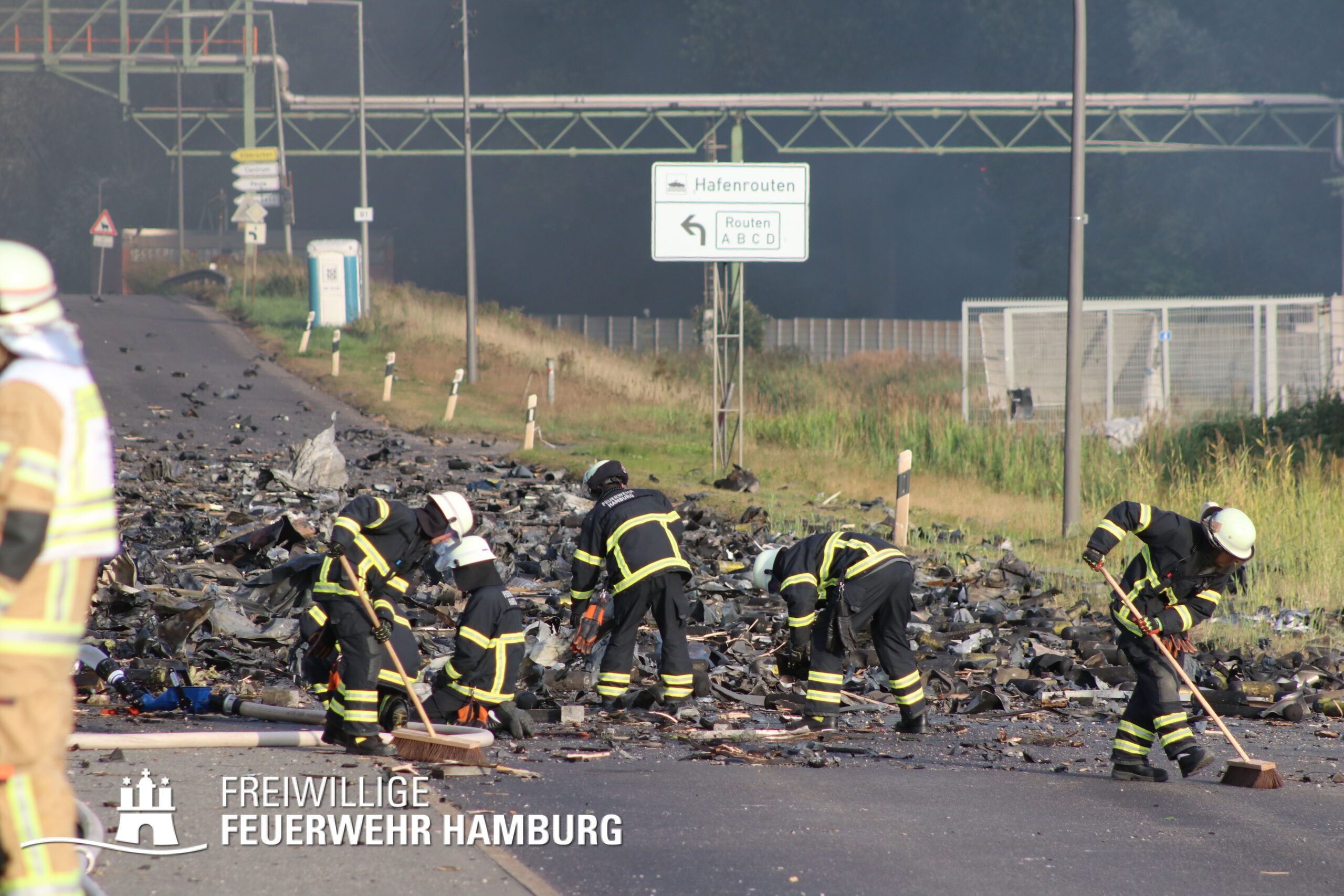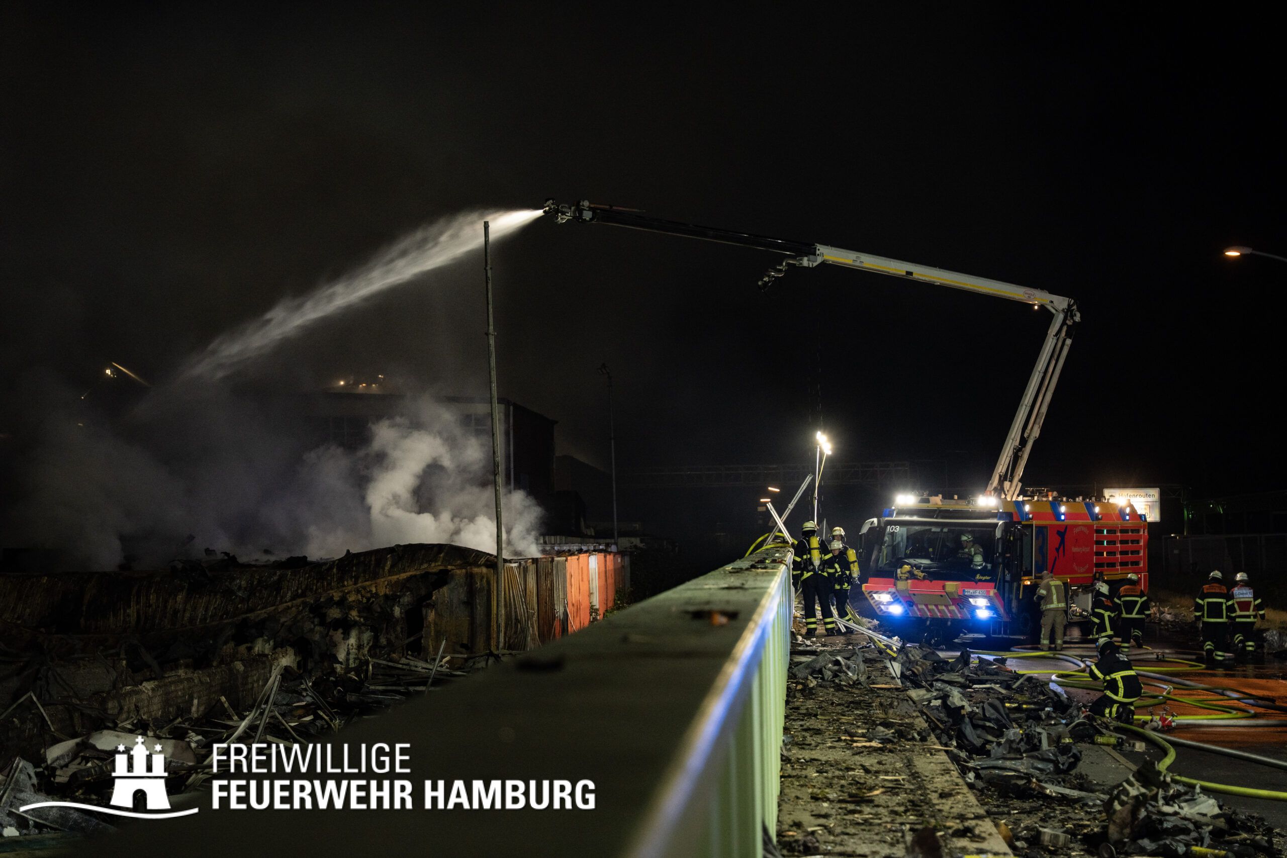 Die Drohnen der Feuerwehr und Polizei lieferten wichtige Luftaufnahmen und ermöglichten der Einsatzleitung einen klaren Überblick über die gesamte Einsatzstelle, während die Werkfeuerwehr Aurubis sowie die Flughafenfeuerwehr Hamburg tatkräftig bei der Brandbekämpfung unterstützten. Auch die Polizei spielte eine entscheidende Rolle: Mit gepanzerten Sonderfahrzeugen räumten sie die Straße von Trümmern und halfen mit Wasserwerfern, die Flammen zu bekämpfen. Im späteren Verlauf des Einsatzes konnten durch Löschpanzern der Feuerwehr Vechta bzw. der Firma Alpha Robotics einige Seecontainer gelöscht werden.