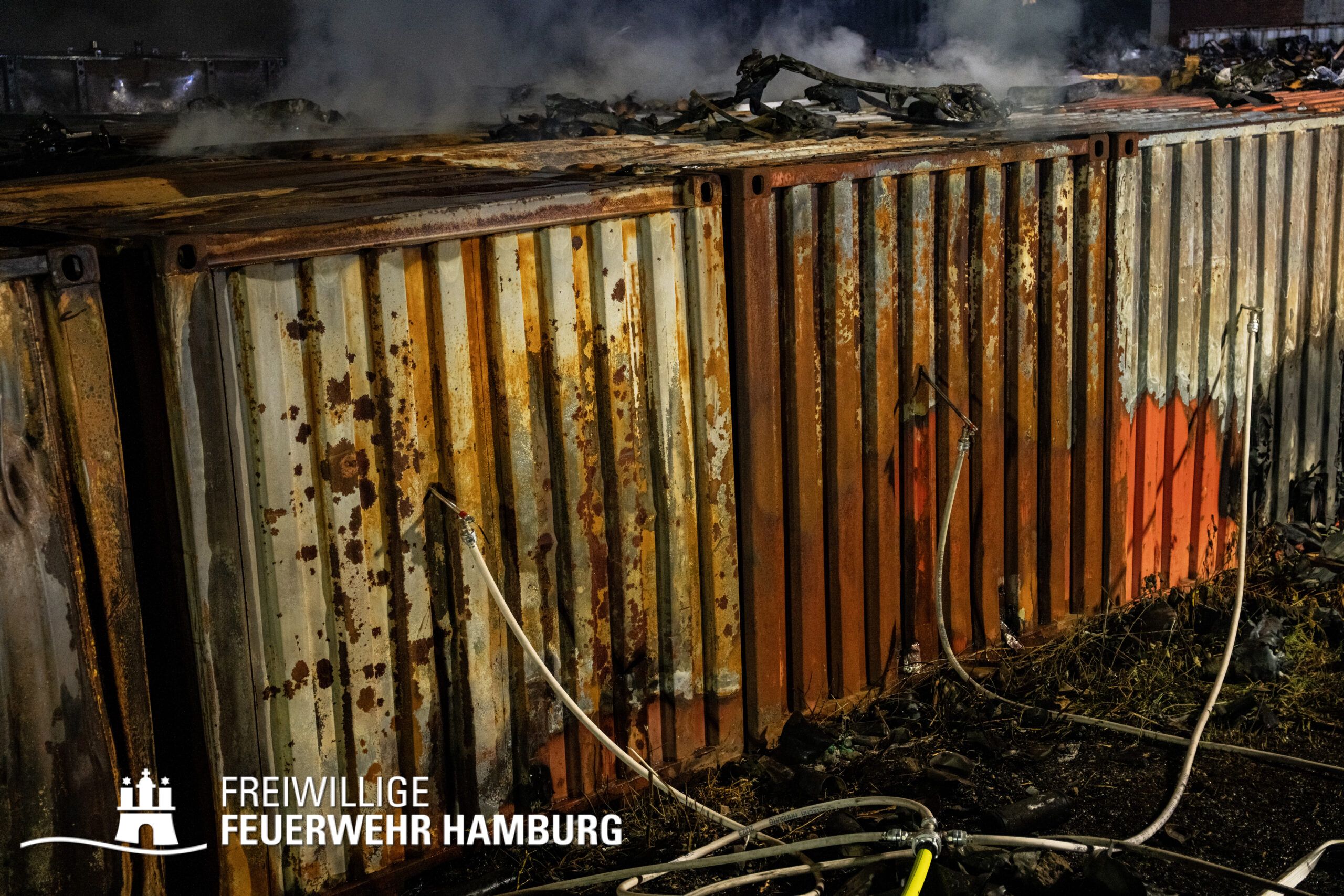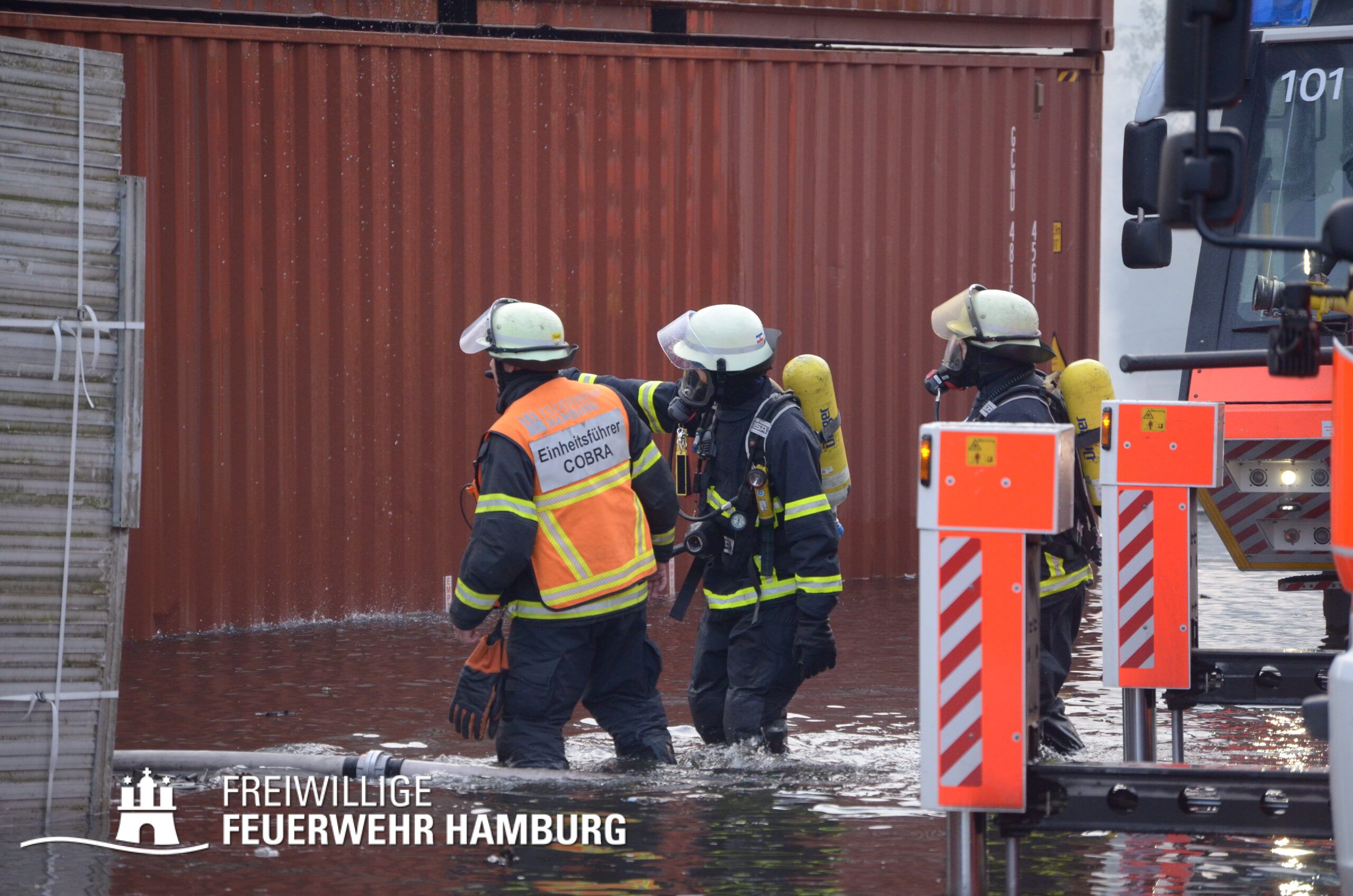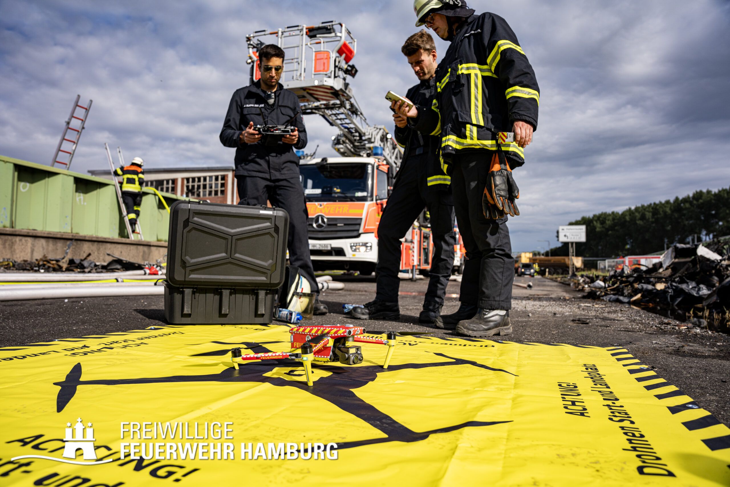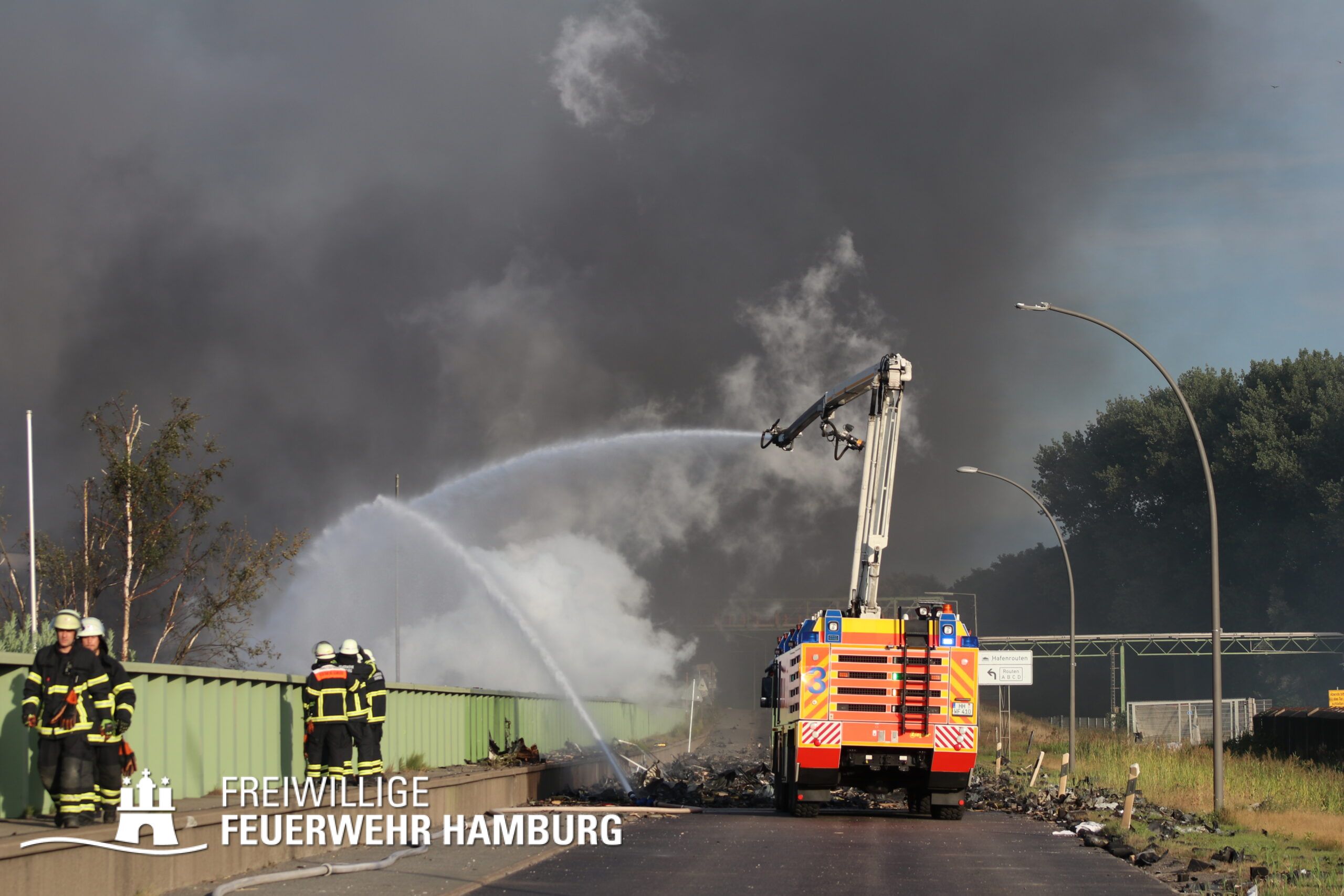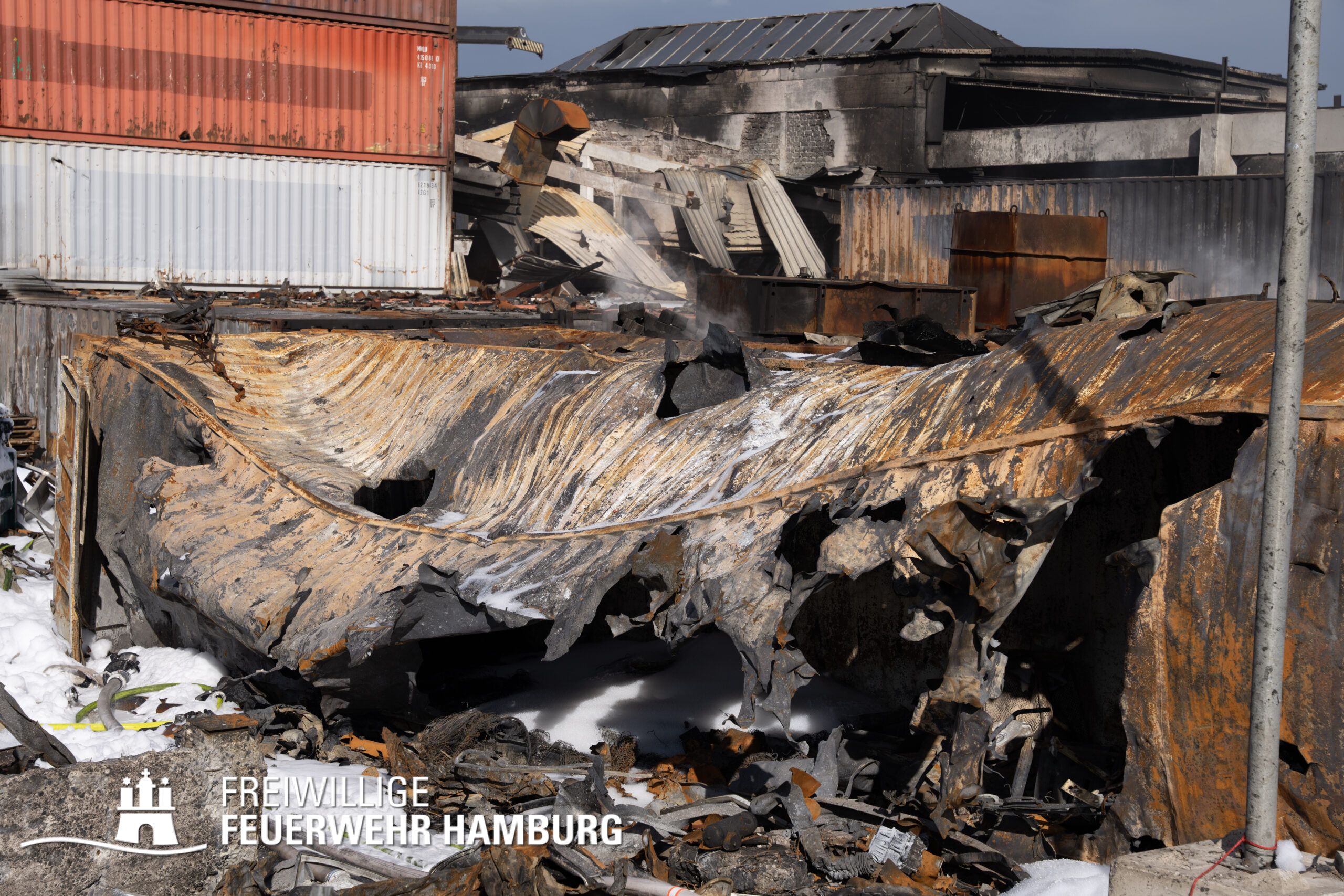 Die Drohnen der Feuerwehr und Polizei lieferten wichtige Luftaufnahmen und ermöglichten der Einsatzleitung einen klaren Überblick über die gesamte Einsatzstelle, während die Werkfeuerwehr Aurubis sowie die Flughafenfeuerwehr Hamburg tatkräftig bei der Brandbekämpfung unterstützten. Auch die Polizei spielte eine entscheidende Rolle: Mit gepanzerten Sonderfahrzeugen räumten sie die Straße von Trümmern und halfen mit Wasserwerfern, die Flammen zu bekämpfen. Im späteren Verlauf des Einsatzes konnten durch Löschpanzern der Feuerwehr Vechta bzw. der Firma Alpha Robotics einige Seecontainer gelöscht werden.