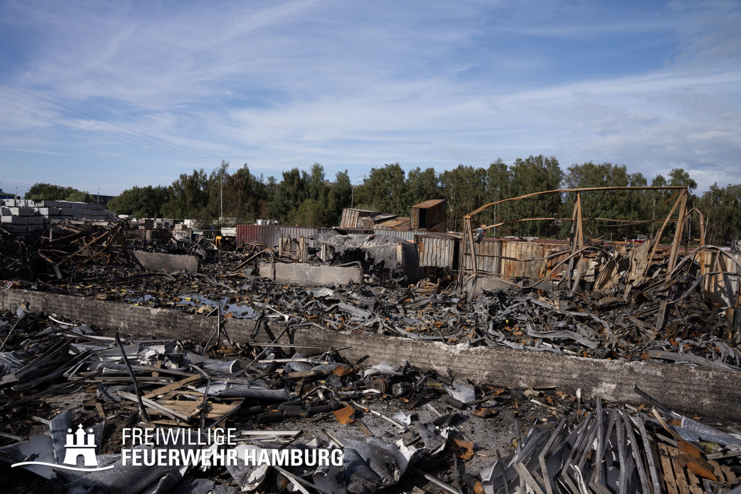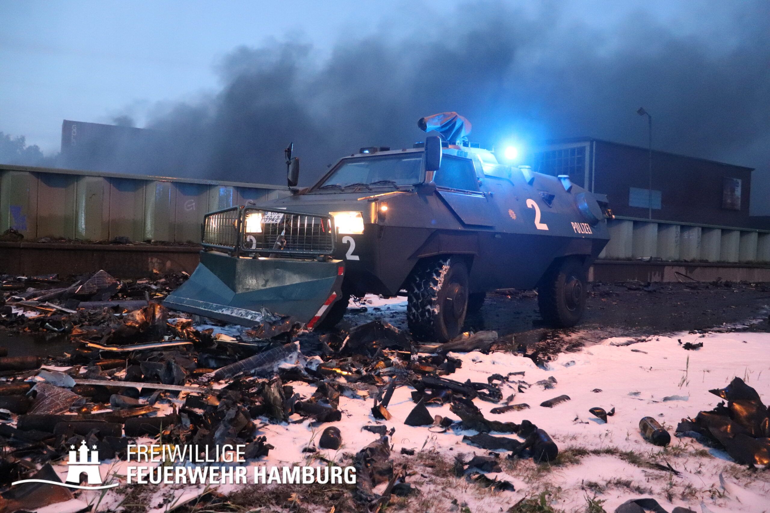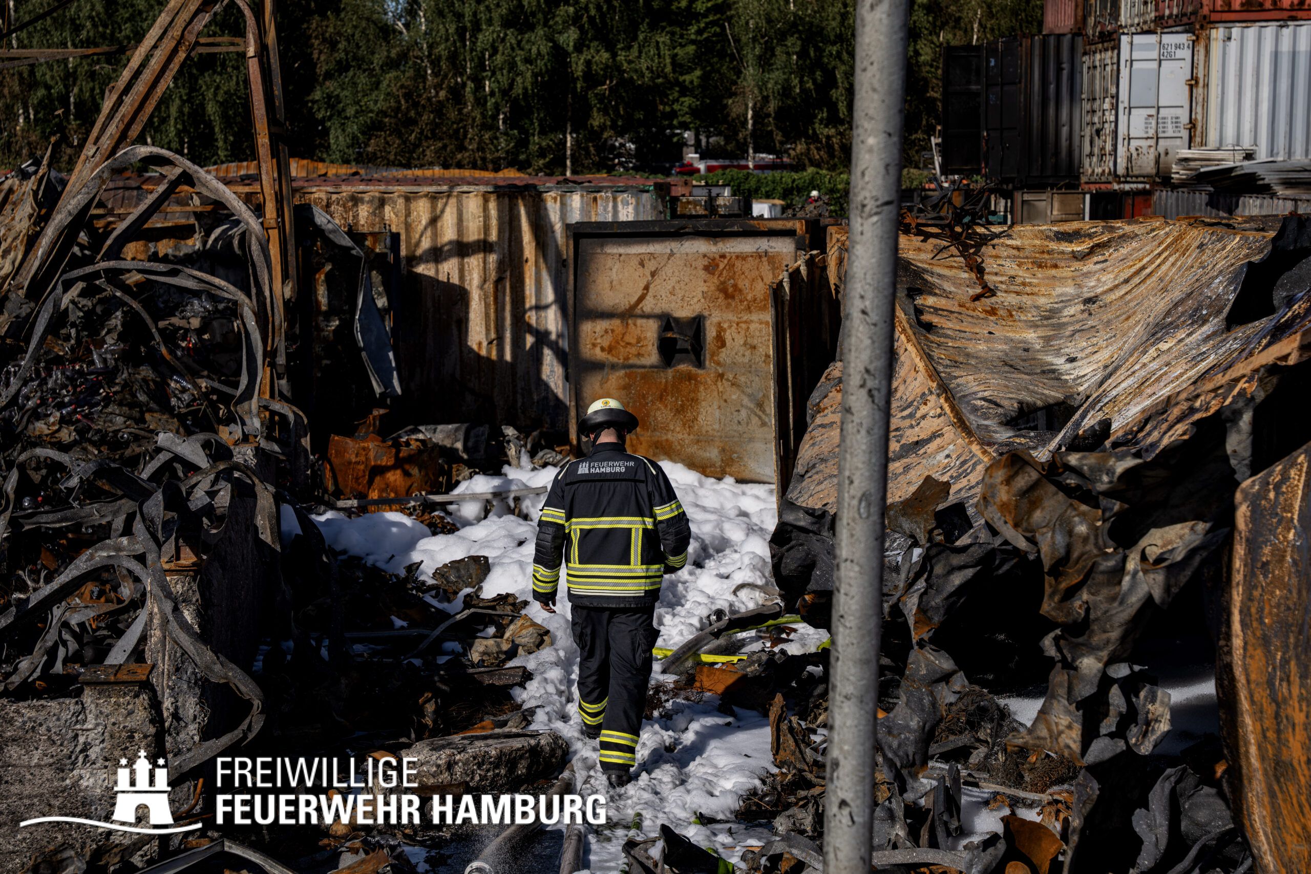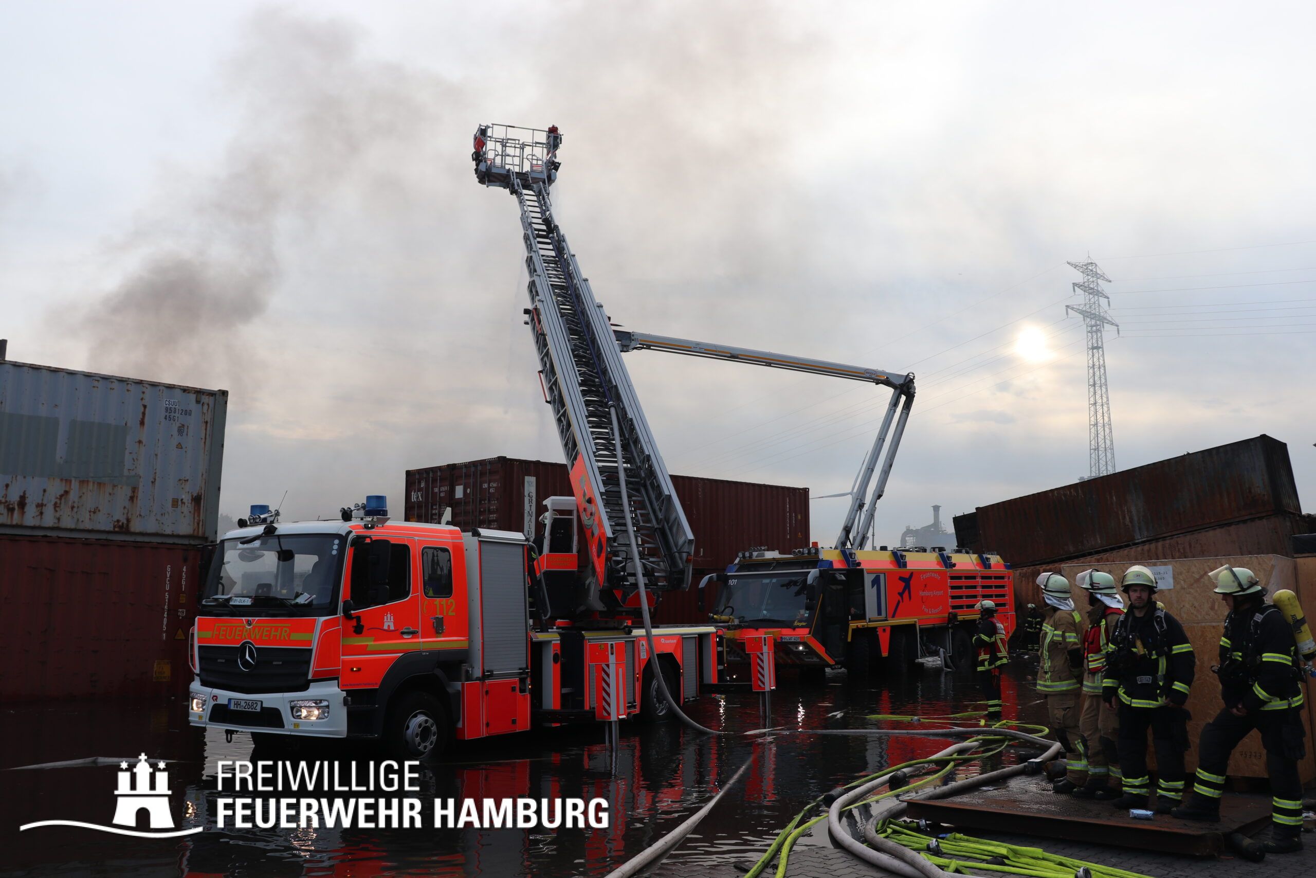Die Drohnen der Feuerwehr und Polizei lieferten wichtige Luftaufnahmen und ermöglichten der Einsatzleitung einen klaren Überblick über die gesamte Einsatzstelle, während die Werkfeuerwehr Aurubis sowie die Flughafenfeuerwehr Hamburg tatkräftig bei der Brandbekämpfung unterstützten. Auch die Polizei spielte eine entscheidende Rolle: Mit gepanzerten Sonderfahrzeugen räumten sie die Straße von Trümmern und halfen mit Wasserwerfern, die Flammen zu bekämpfen. Im späteren Verlauf des Einsatzes konnten durch Löschpanzern der Feuerwehr Vechta bzw. der Firma Alpha Robotics einige Seecontainer gelöscht werden.