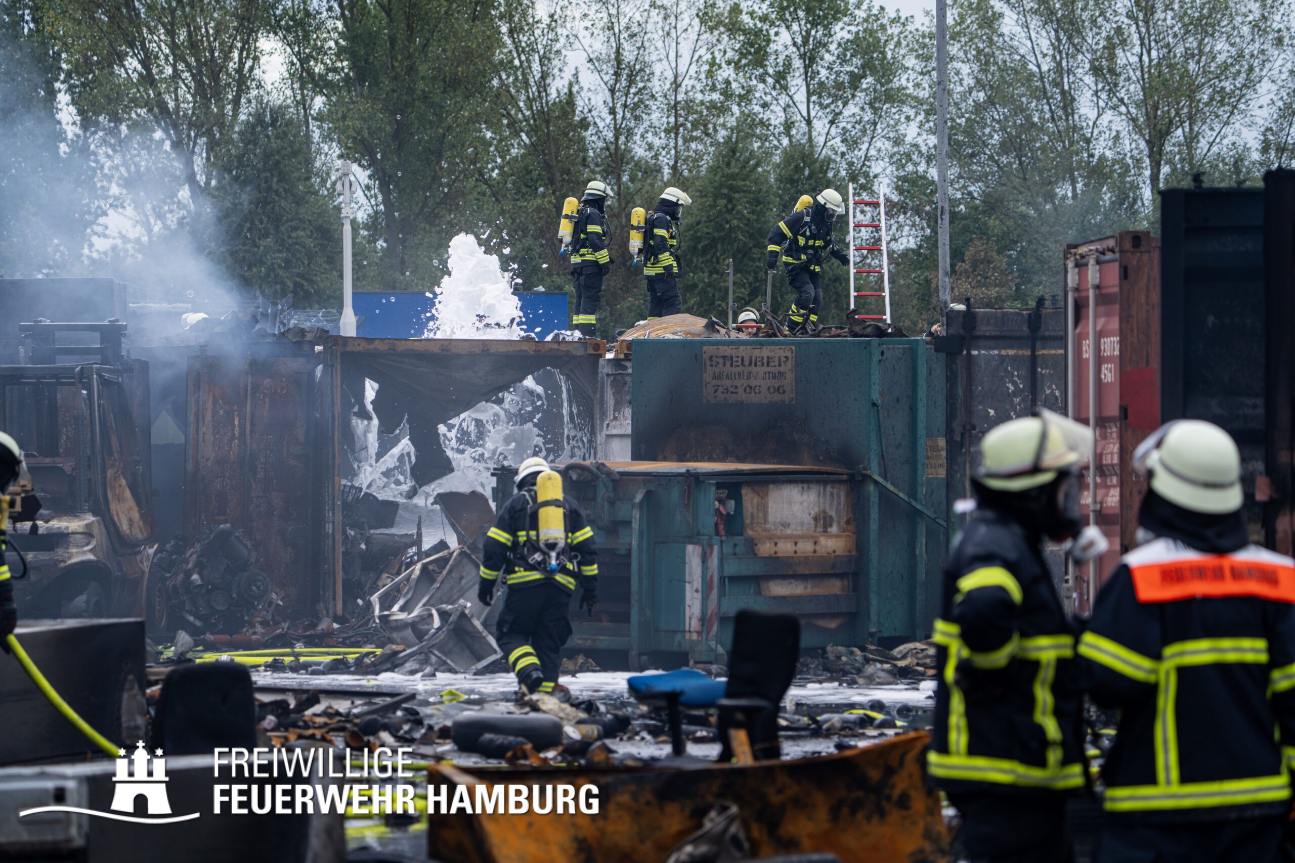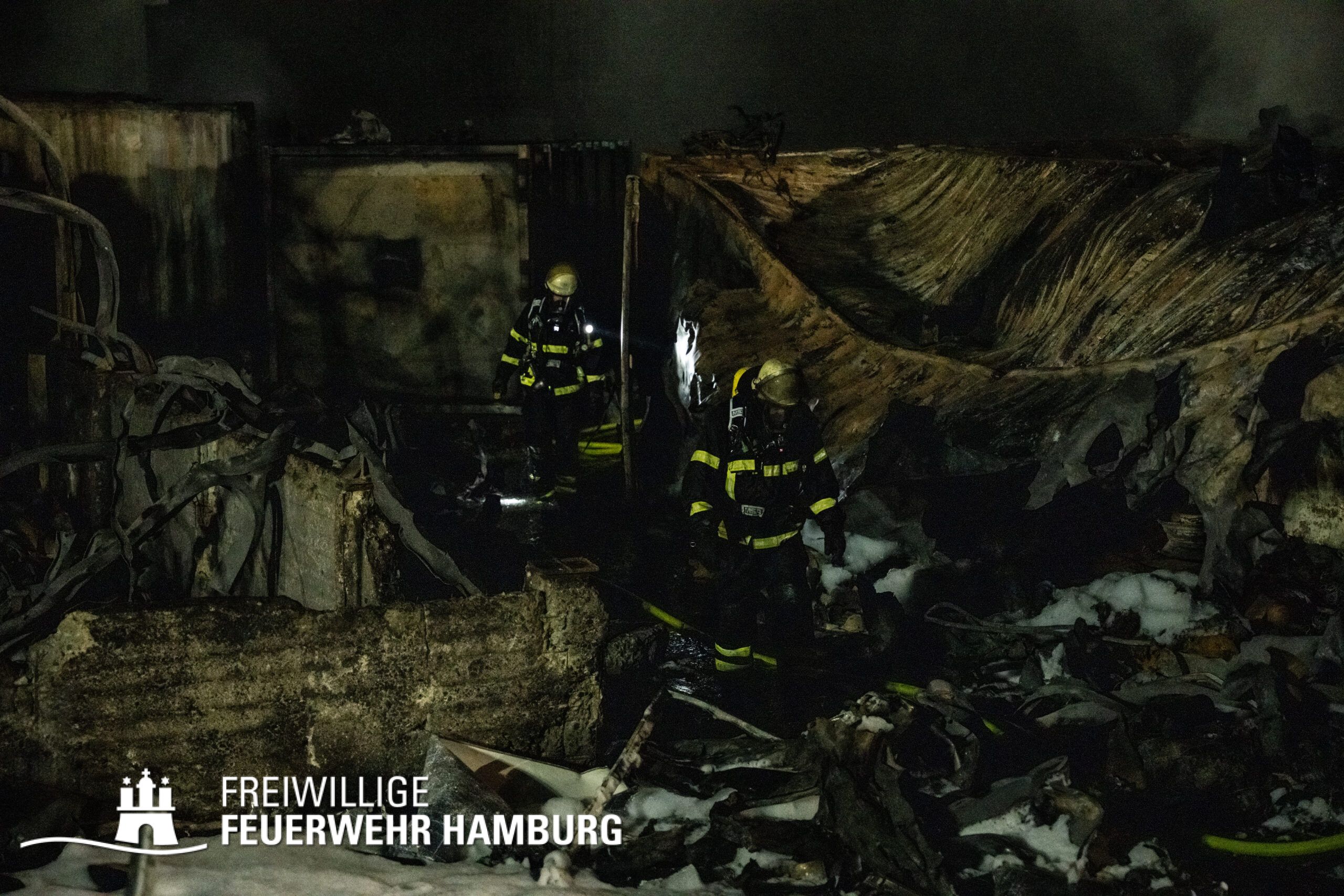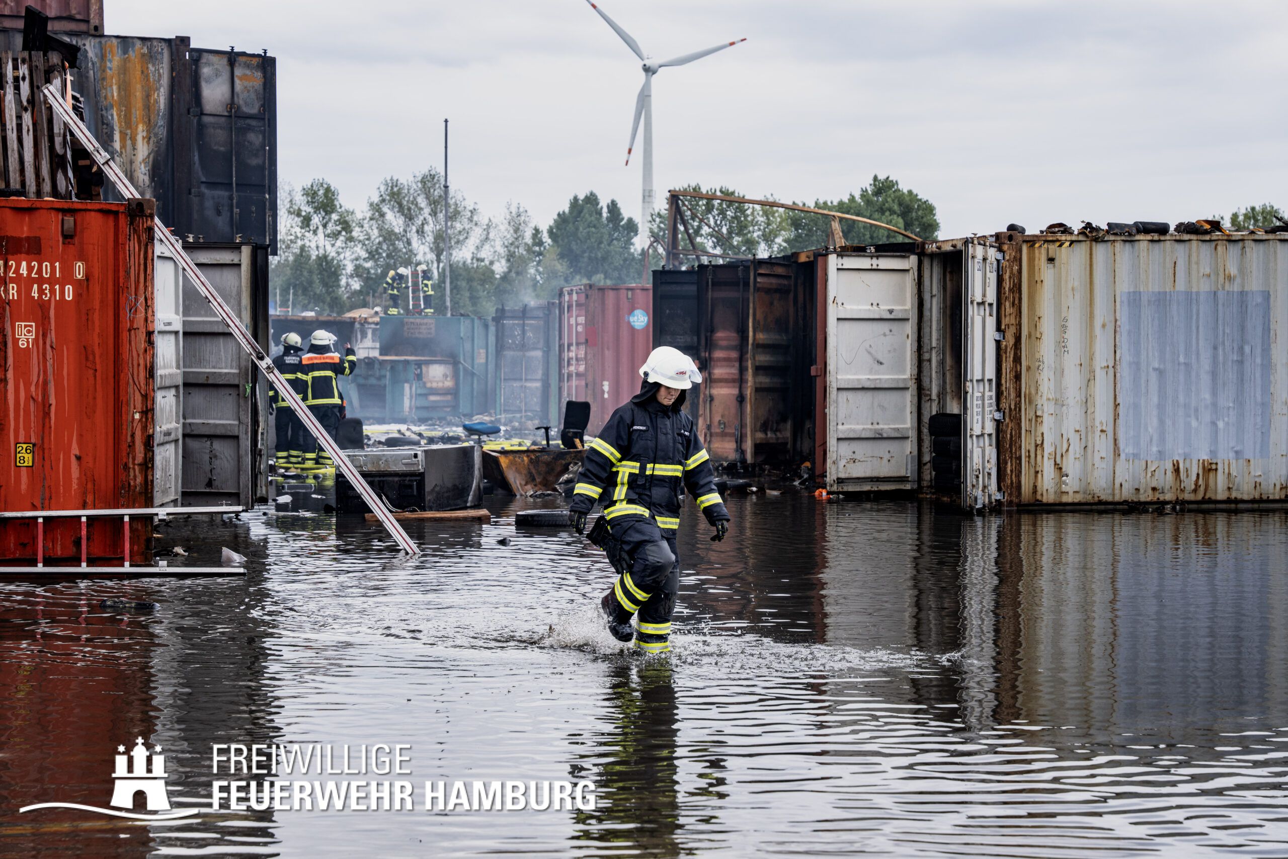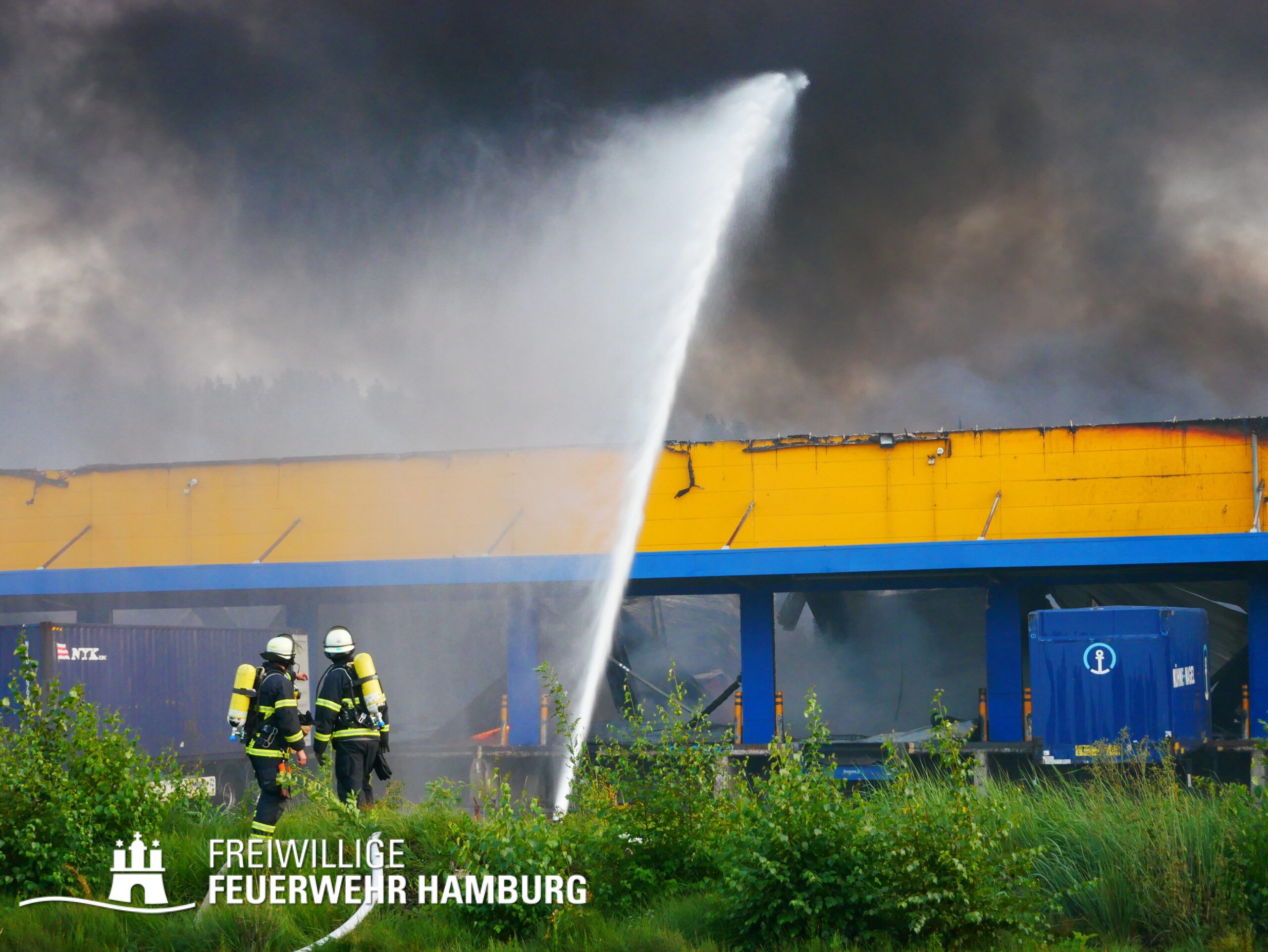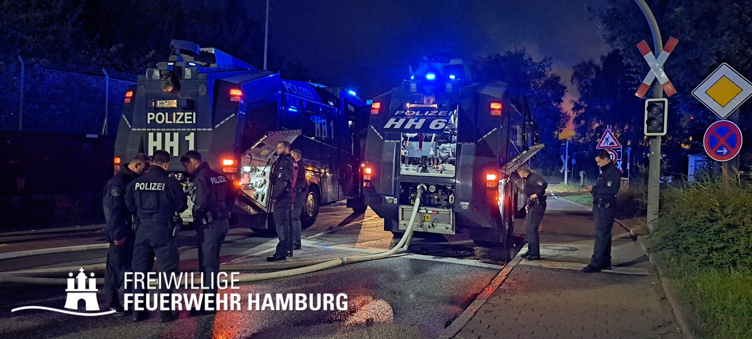 Die Drohnen der Feuerwehr und Polizei lieferten wichtige Luftaufnahmen und ermöglichten der Einsatzleitung einen klaren Überblick über die gesamte Einsatzstelle, während die Werkfeuerwehr Aurubis sowie die Flughafenfeuerwehr Hamburg tatkräftig bei der Brandbekämpfung unterstützten. Auch die Polizei spielte eine entscheidende Rolle: Mit gepanzerten Sonderfahrzeugen räumten sie die Straße von Trümmern und halfen mit Wasserwerfern, die Flammen zu bekämpfen. Im späteren Verlauf des Einsatzes konnten durch Löschpanzern der Feuerwehr Vechta bzw. der Firma Alpha Robotics einige Seecontainer gelöscht werden.