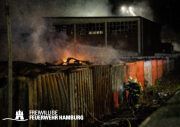 Das Dach der Lagerhalle stürzte bereits vor Mitternacht infolge des Vollbrands ein. Im angrenzenden Containerlager kam es immer wieder zu Explosionen von Druckgasflaschen.